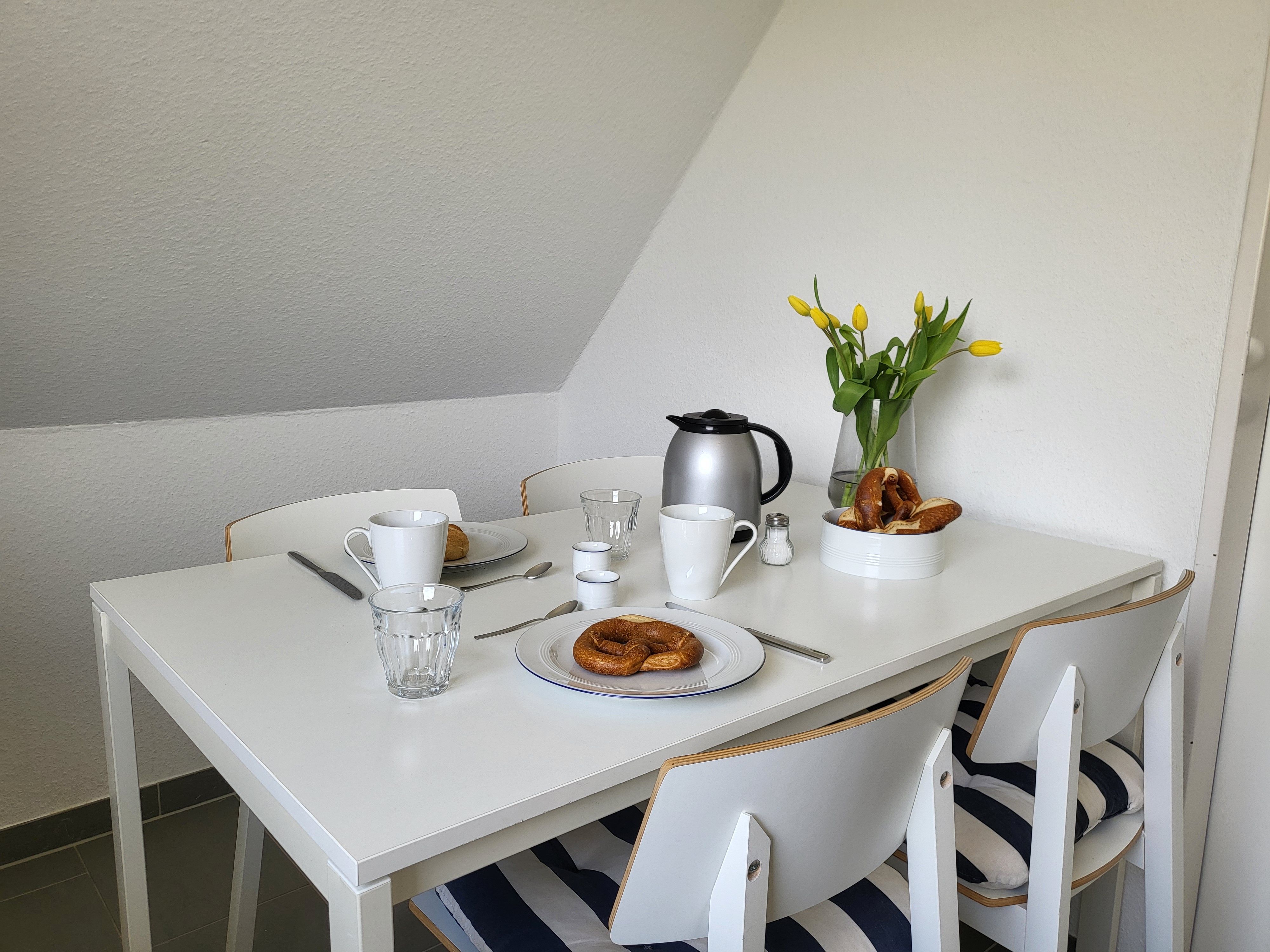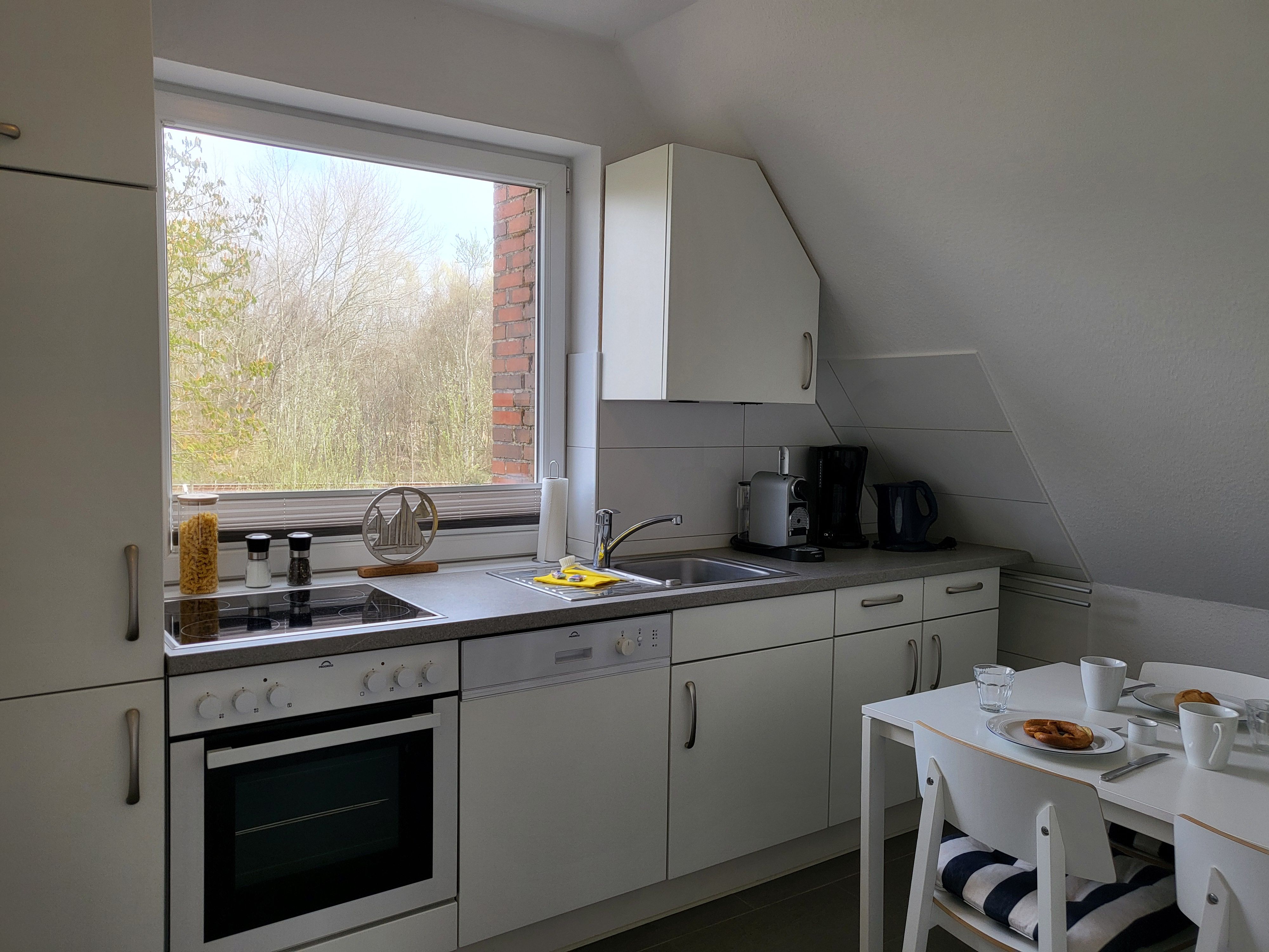 Für Ihre kulinarischen Bedürfnisse verfügt die Ferienwohnung über eine geschlossene Küche mit einem umfangreichen Angebot an Ausstattung: Ein Cerankochfeld, Backofen, Mikrowelle, Kühlschrank mit Gefrierfach, Geschirrspüler sowie verschiedene Küchenutensilien sind vorhanden, um Ihnen das Kochen zu erleichtern. Darüber hinaus stehen Ihnen eine Kaffeemaschine, Wasserkocher, Toaster und ein Eierkocher zur Verfügung – alles, was Sie für ein gemütliches Frühstück oder Abendessen benötigen.