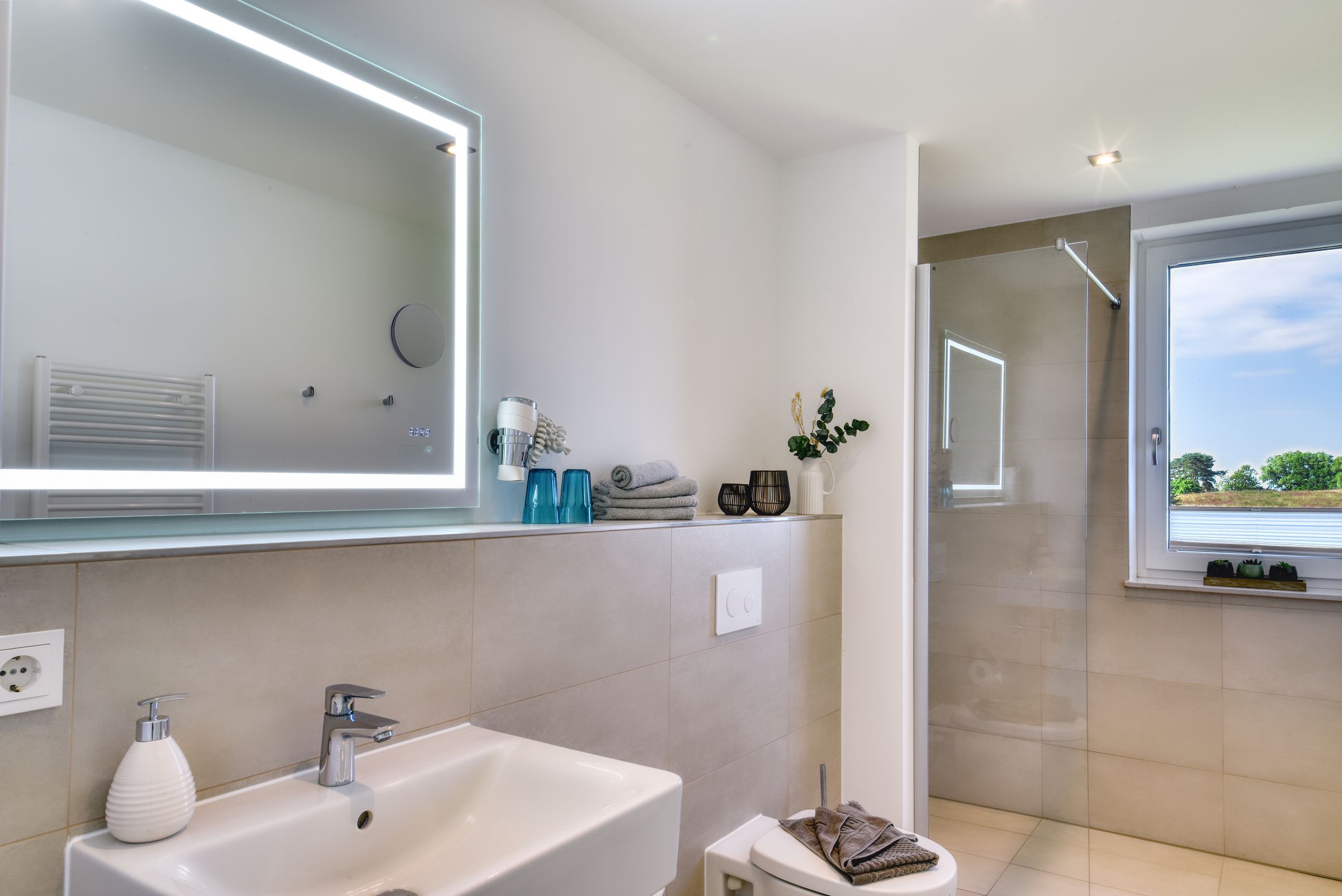 Badezimmer: Das moderne Badezimmer verfügt über eine Dusche, ein Waschbecken und eine Toilette. Handtücher und grundlegende Toilettenartikel sind für Sie bereitgestellt.