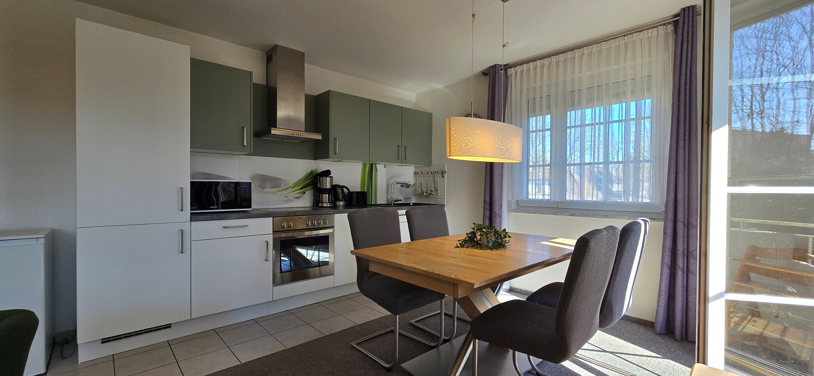 - in separater Ecke im Wohnbereich eine Einbauküche inkl. Geschirrspüler, Herd mit Backofen, Mikrowelle, Kaffeemaschine, Wasserkocher, Toaster, Kühlschrank mit
