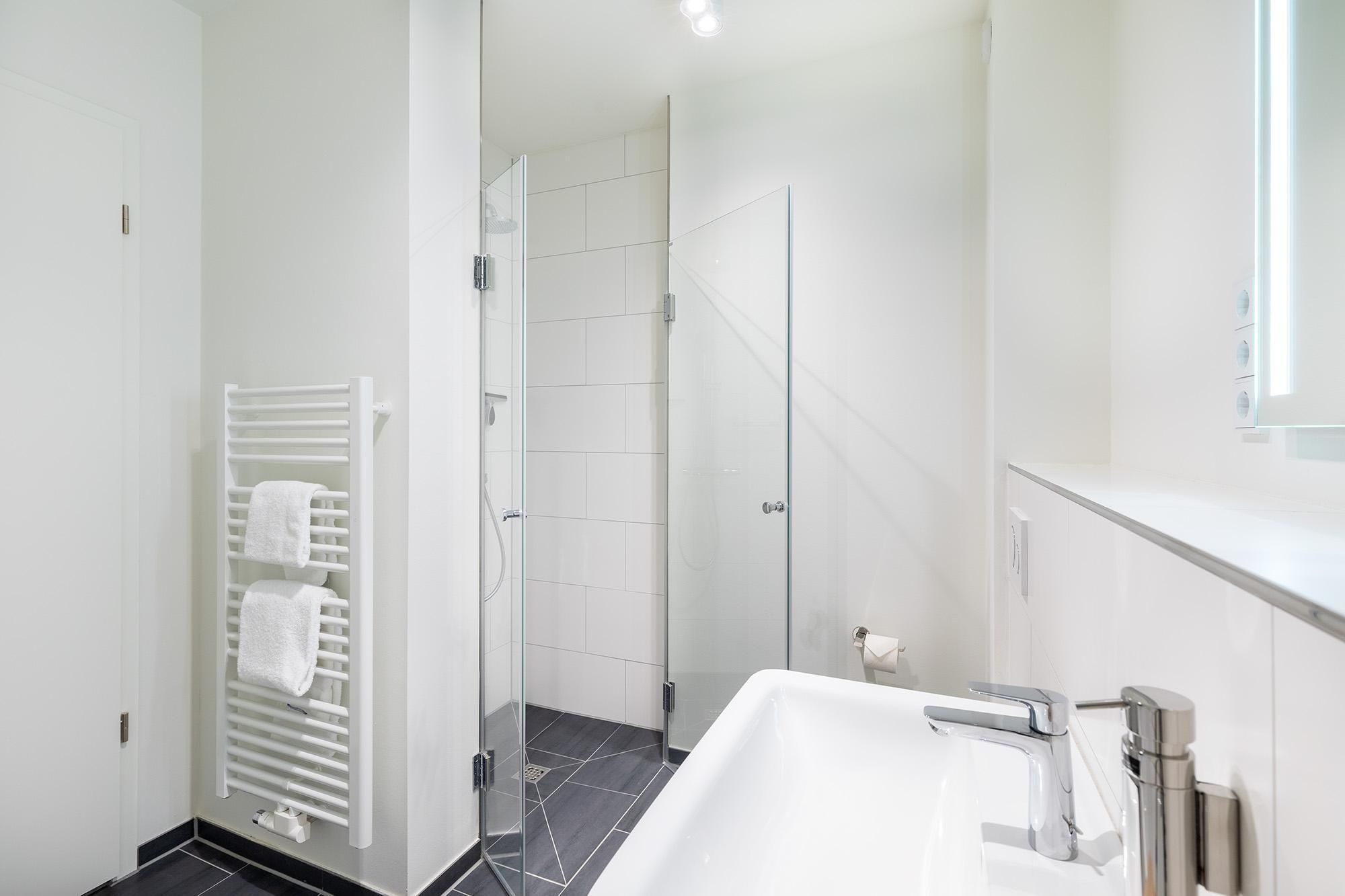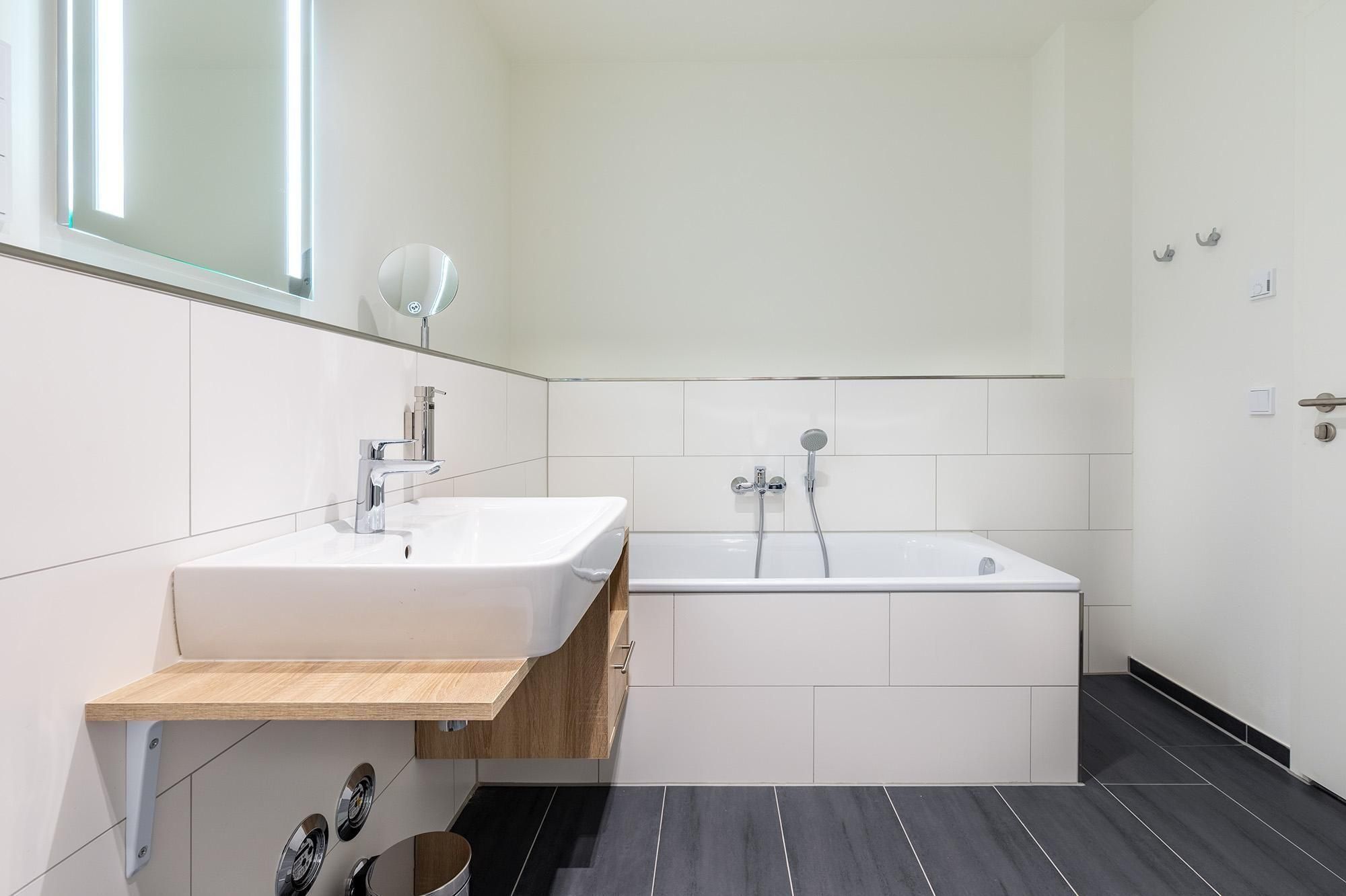 Besonders angenehm für den Urlaub mit mehreren Personen: Neben dem stilvollen Badezimmer mit ebenerdiger Dusche, Badewanne, WC, Handtuchheizkörper, Waschtisch mit Föhn und Fußbodenheizung, steht Ihnen zusätzlich ein zweites, separates WC zur Verfügung – ein echter Pluspunkt in puncto Komfort.