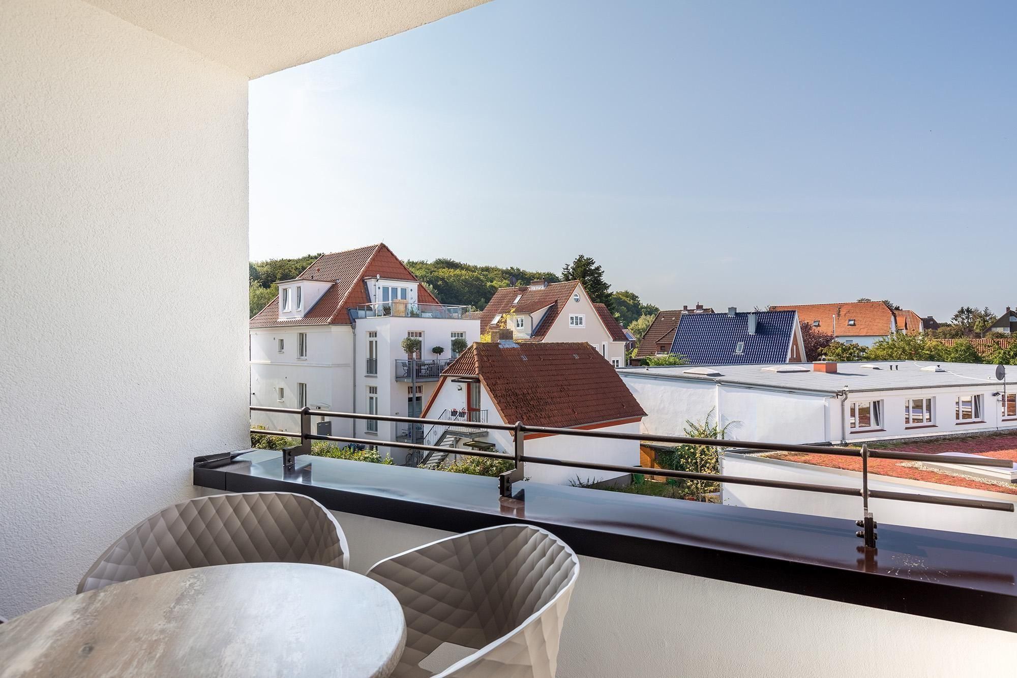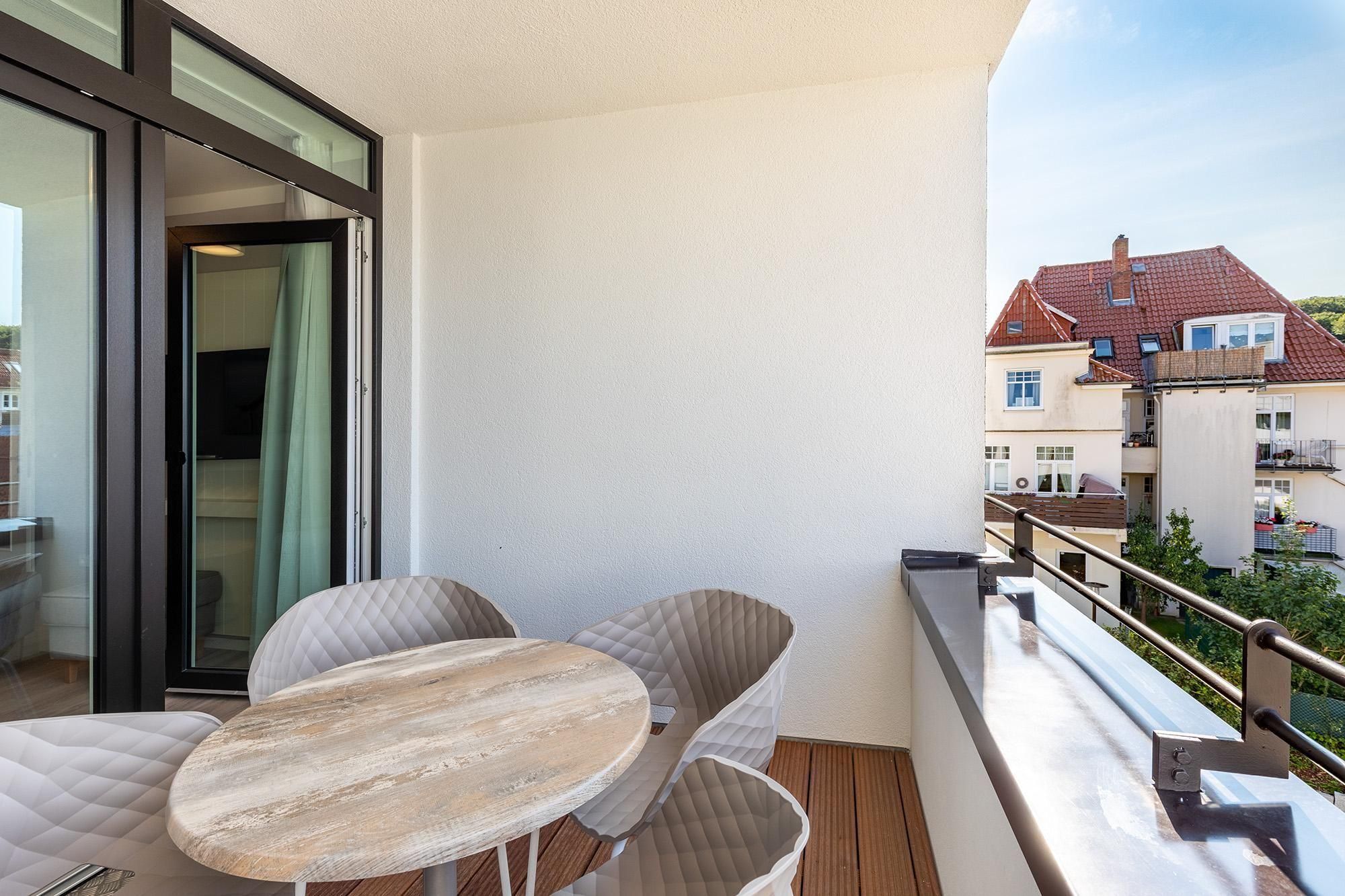 Ein besonderes Highlight ist die überdachte Loggia in sonniger Süd-West-Lage, die Ihnen ganztägig Sonnenlicht sowie das wohltuende Klima der Ostsee schenkt. Hier können Sie bei einem ausgedehnten Frühstück den Tag entspannt beginnen oder abends die letzten Sonnenstrahlen bei einem Glas Wein genießen. Ausgestattet mit bequemen Gartenmöbeln wird sie rasch zu Ihrem Lieblingsplatz im Freien. Die Loggia ist direkt vom Wohnbereich aus zugänglich.
