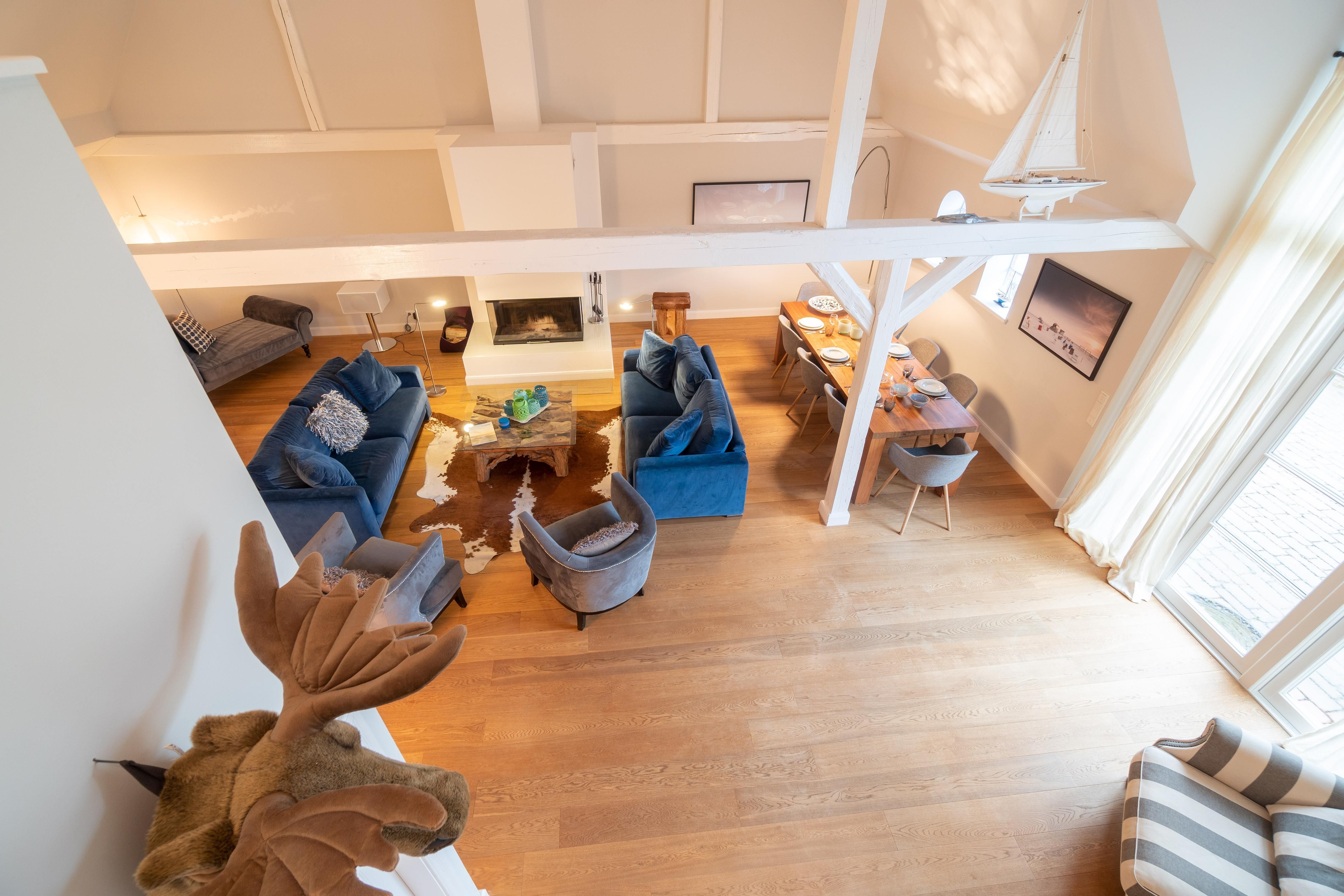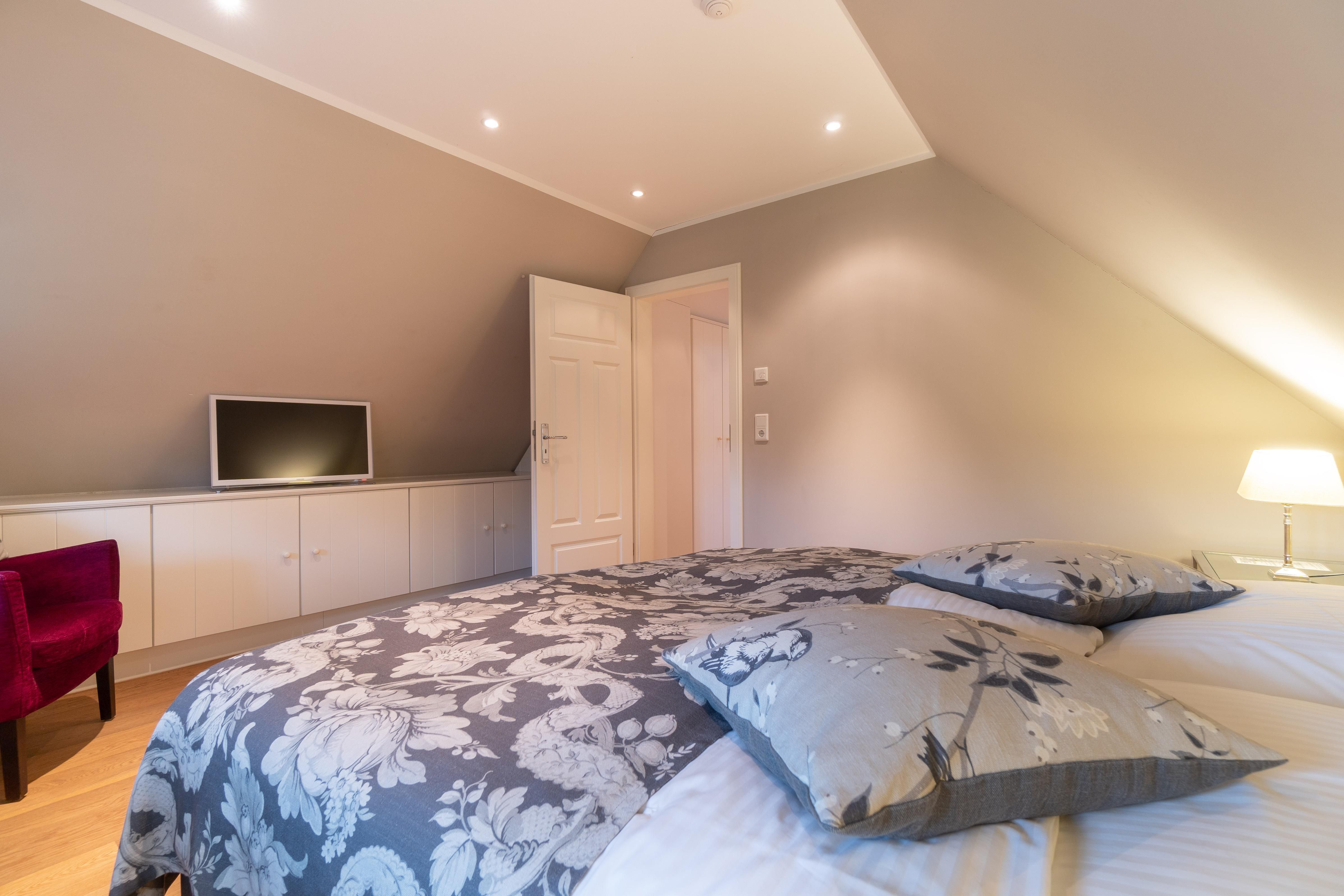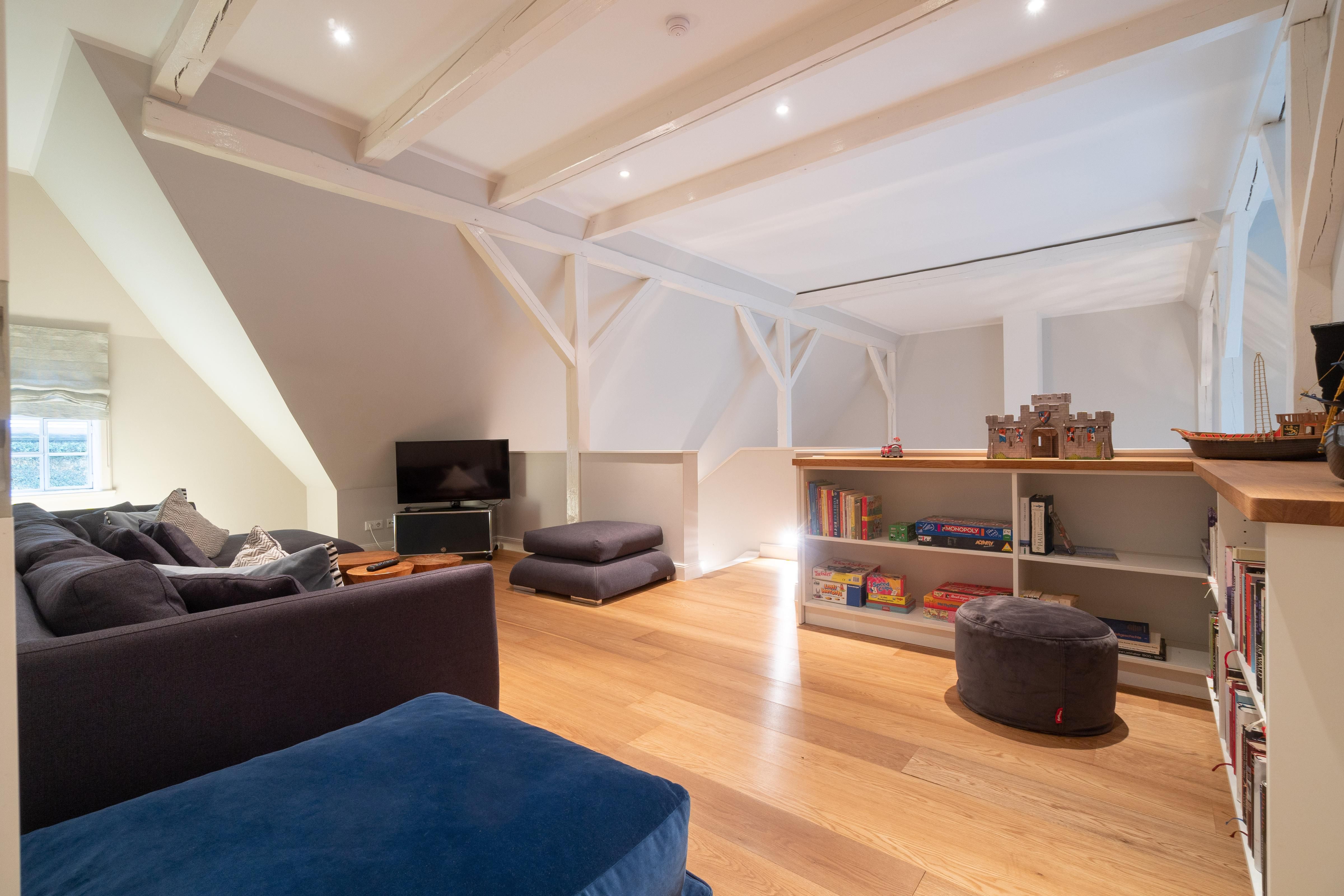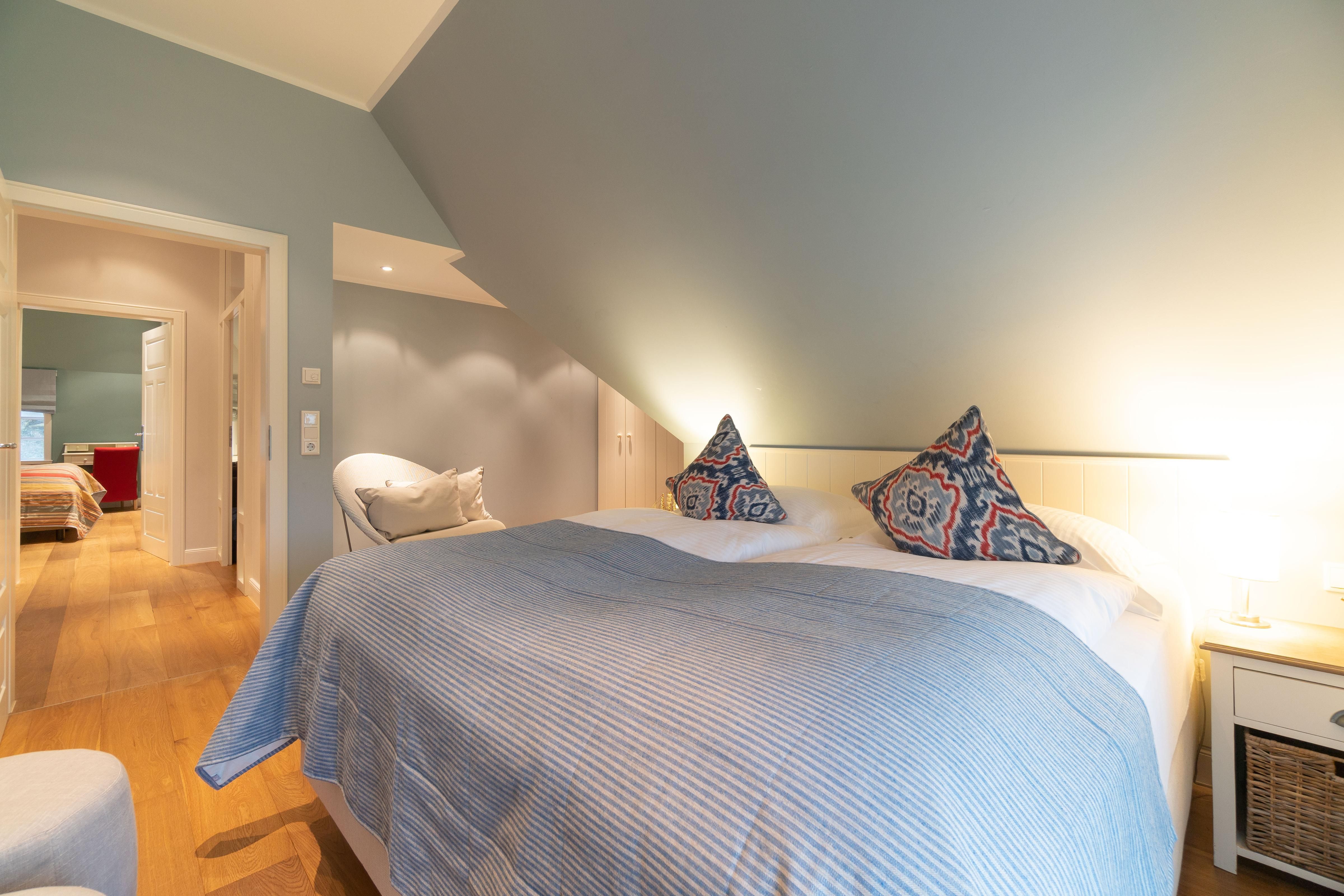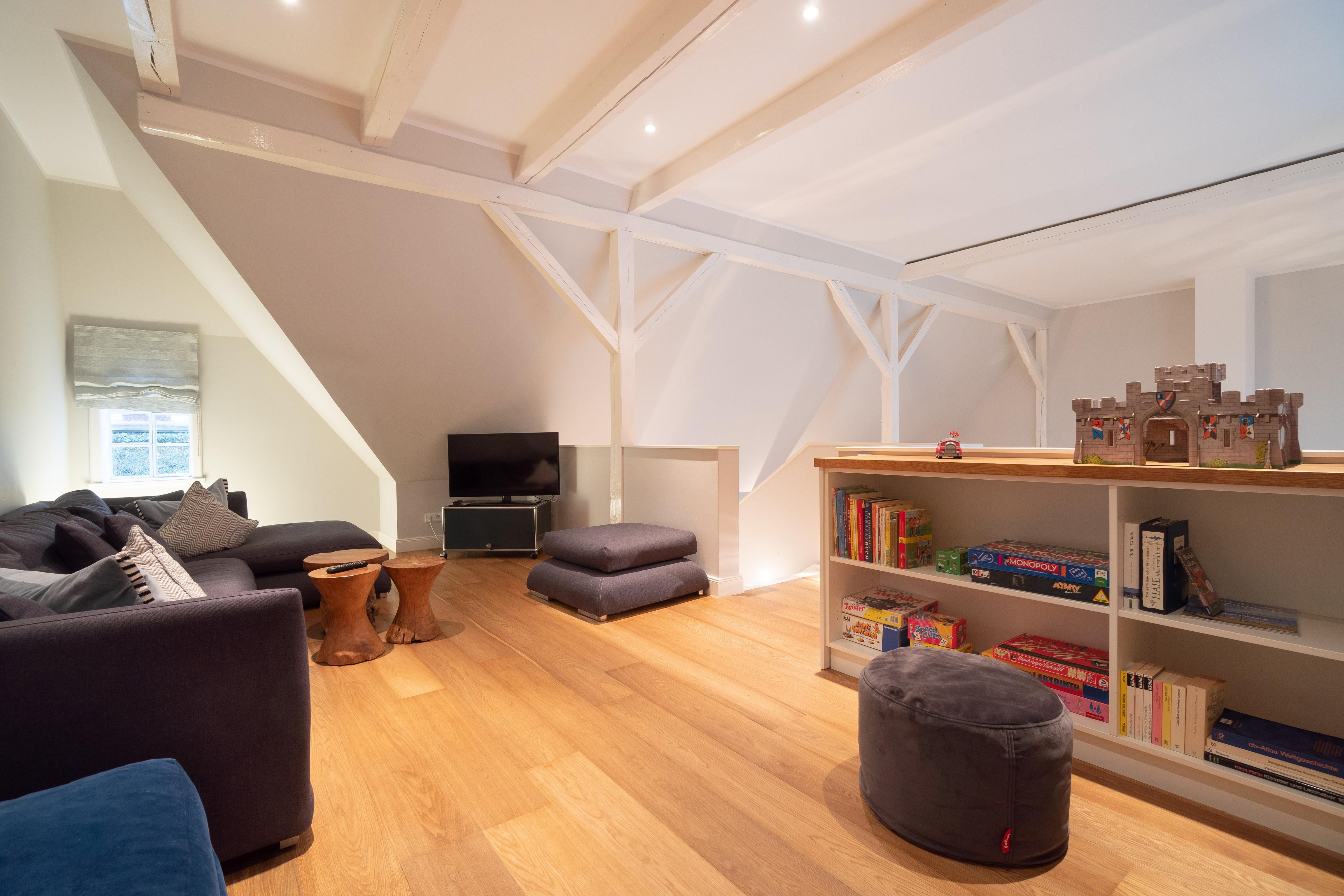 Im Obergeschoss sind die vier Schlafzimmer - jeweils mit einem Doppelbett ausgestattet -, ein Vollbad und ein Duschbad sowie ein TV- und Spielbereich gelegen. Aus dem Spielbereich haben Sie einen Ausblick in den großzügigen Wohn- und Essbereich im Erdgeschoss.