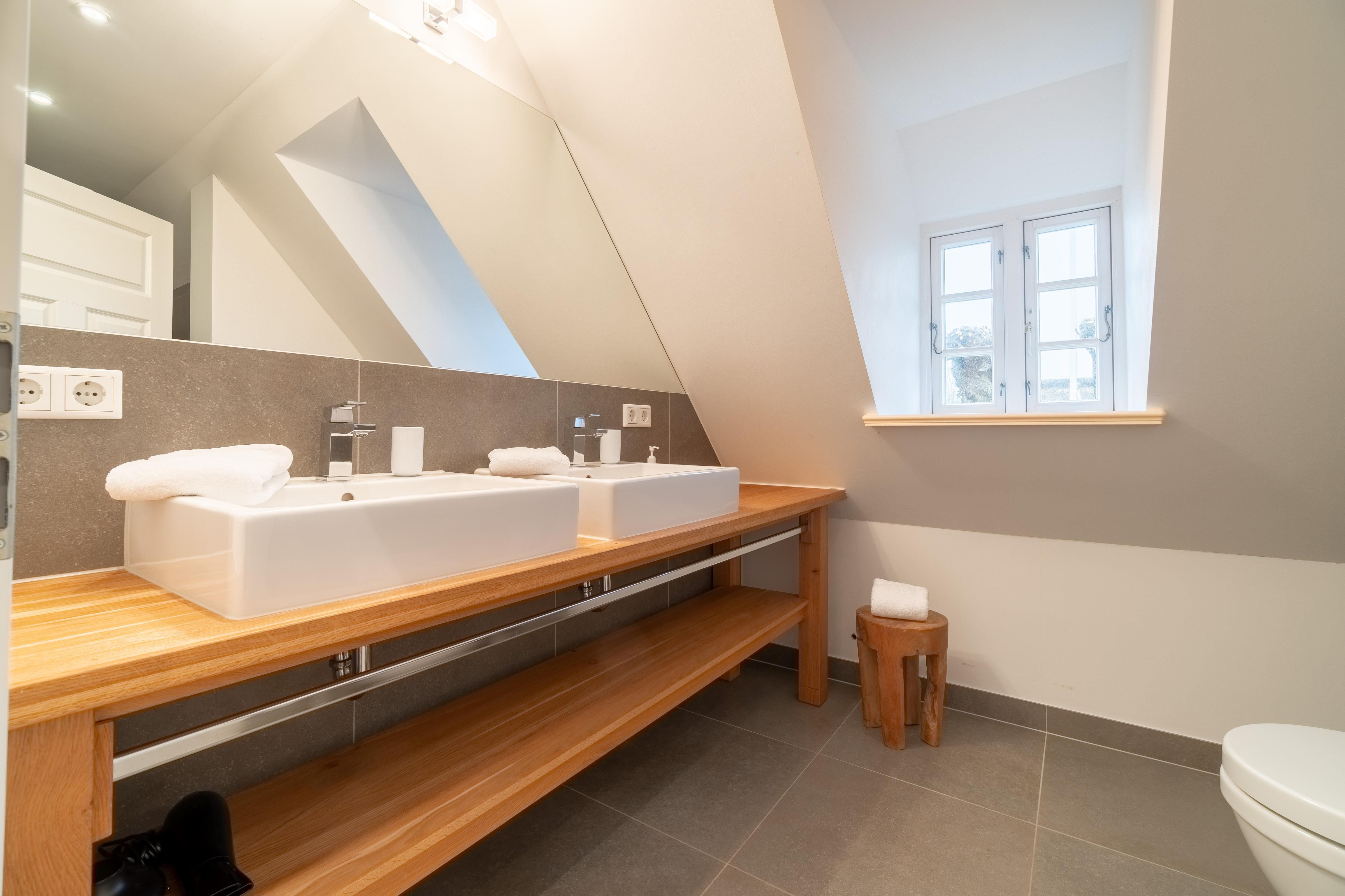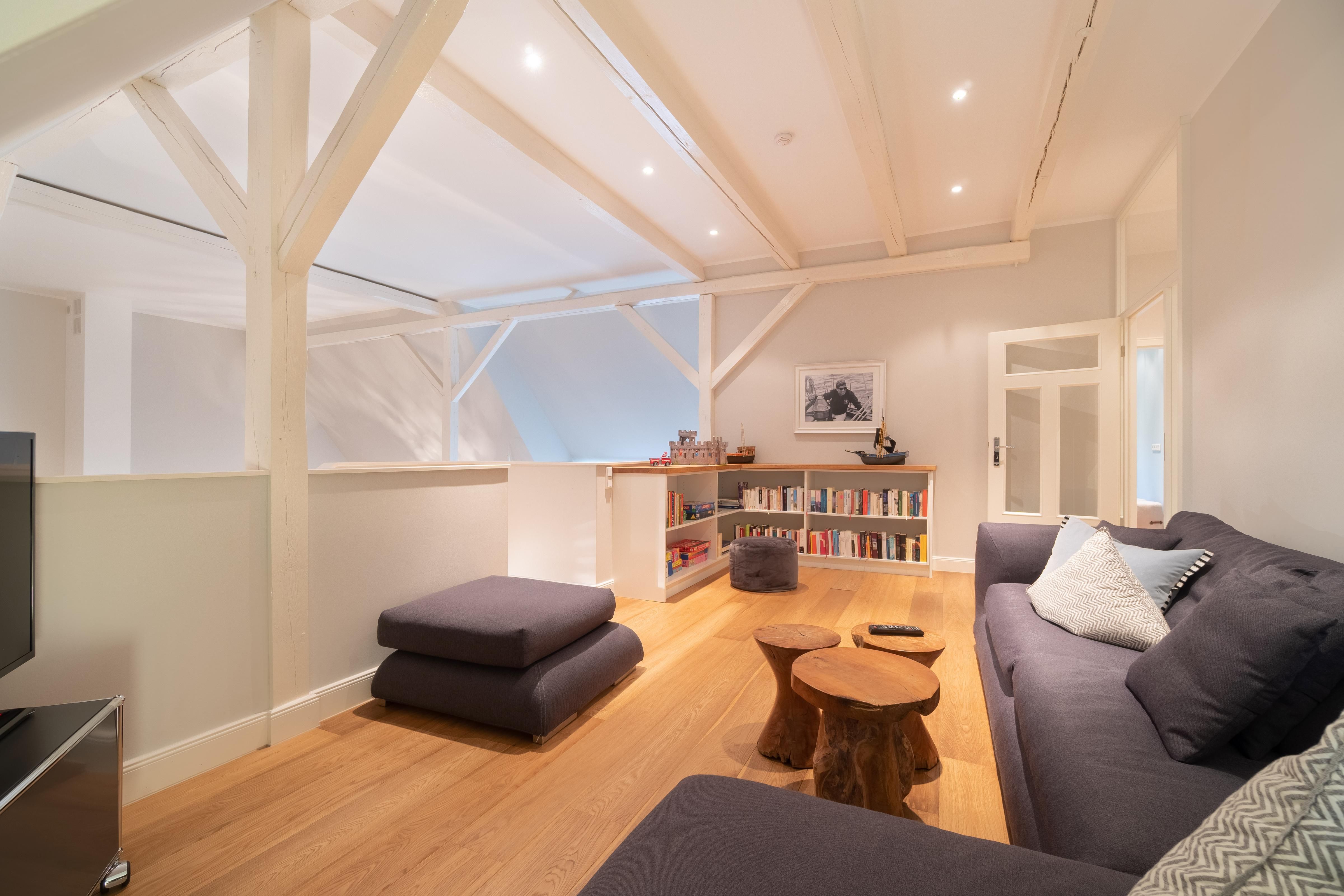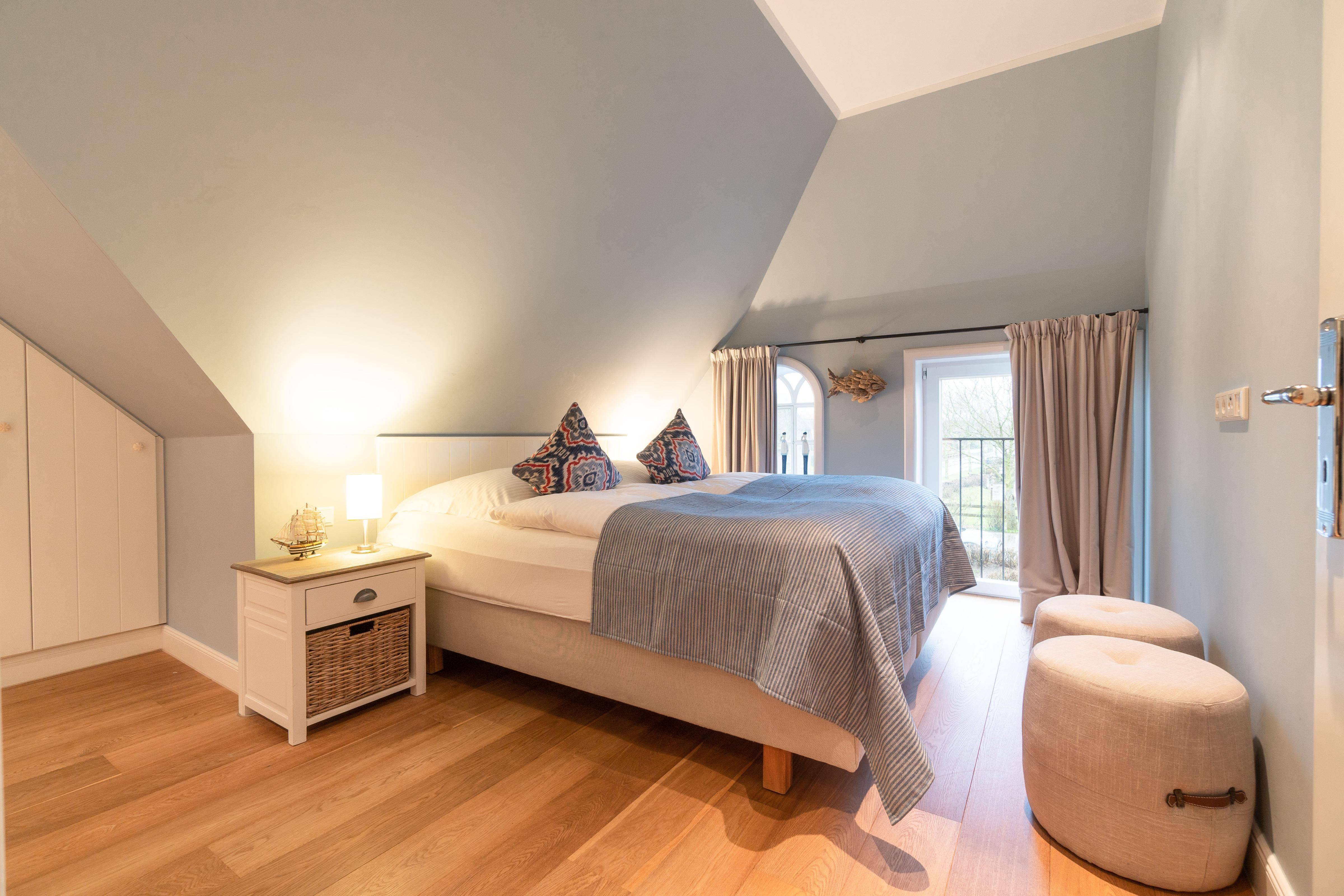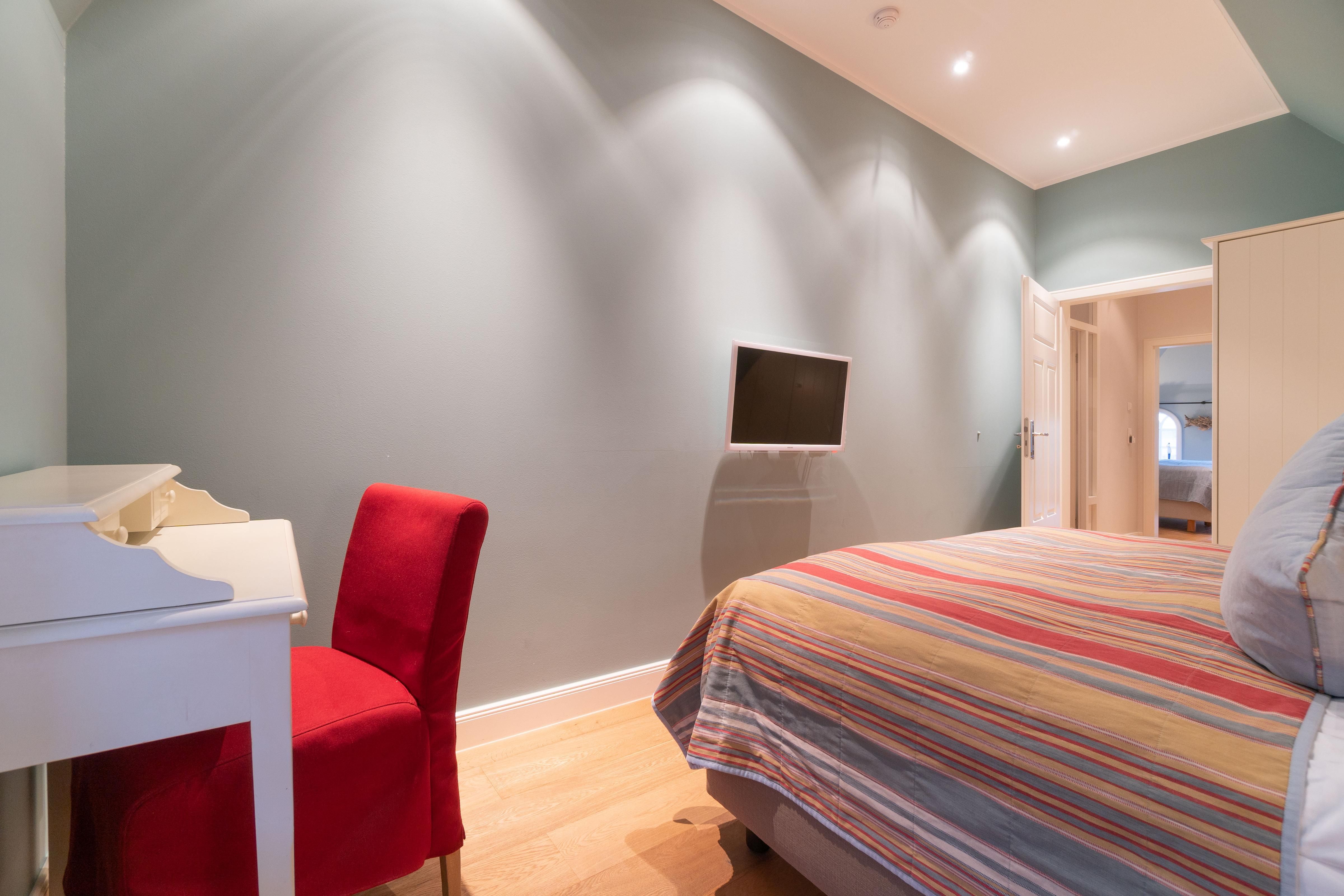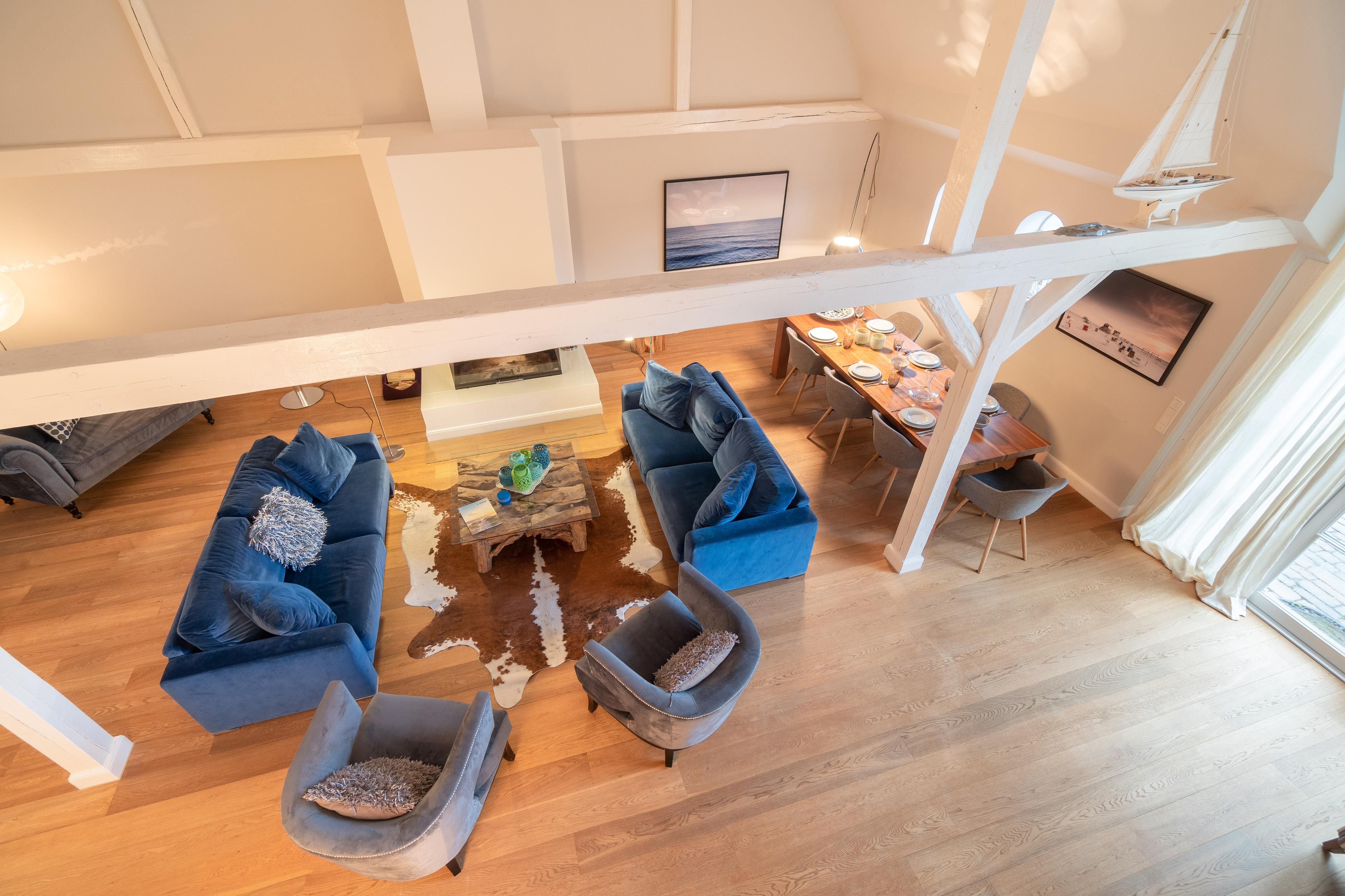 Im Obergeschoss sind die vier Schlafzimmer - jeweils mit einem Doppelbett ausgestattet -, ein Vollbad und ein Duschbad sowie ein TV- und Spielbereich gelegen. Aus dem Spielbereich haben Sie einen Ausblick in den großzügigen Wohn- und Essbereich im Erdgeschoss.