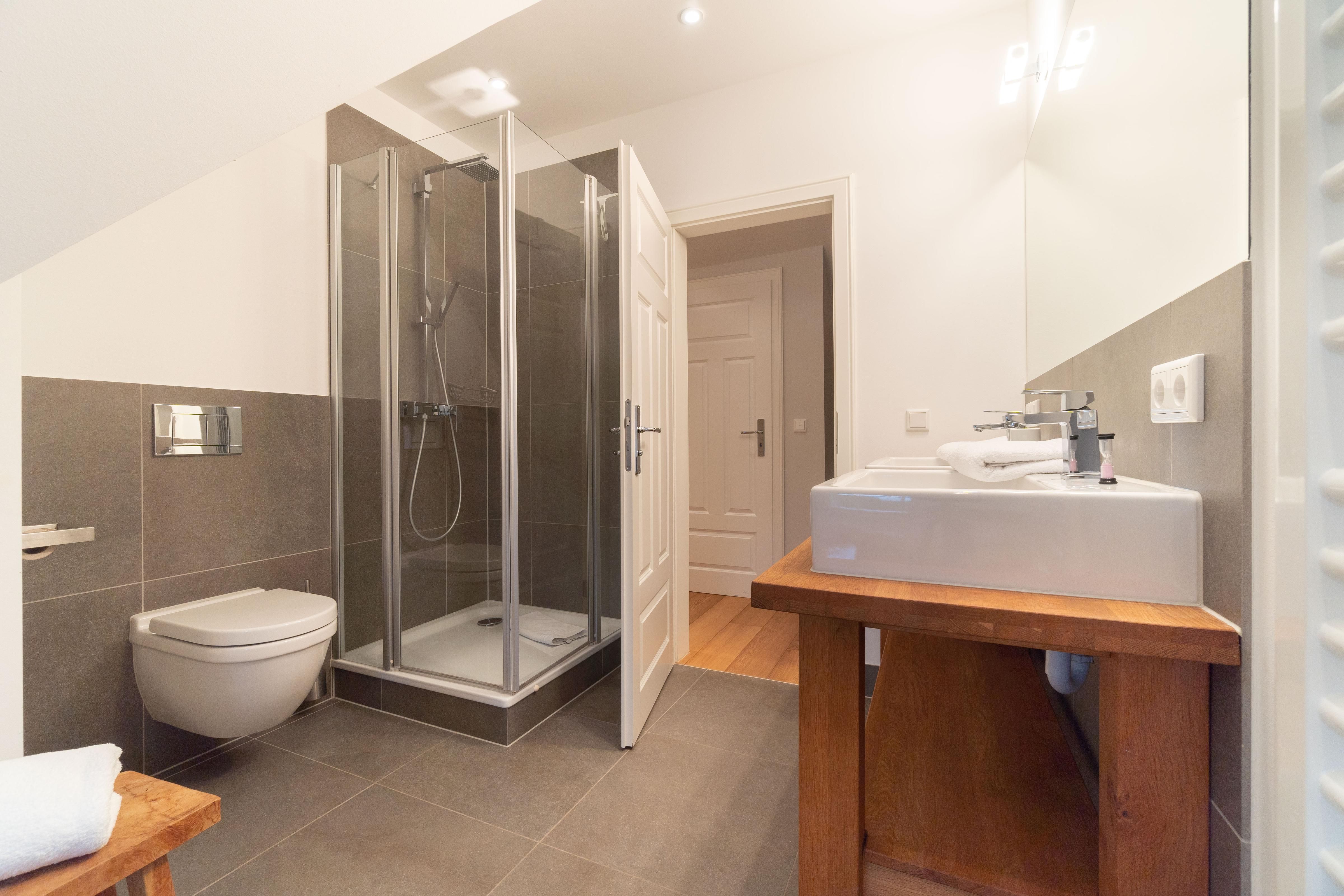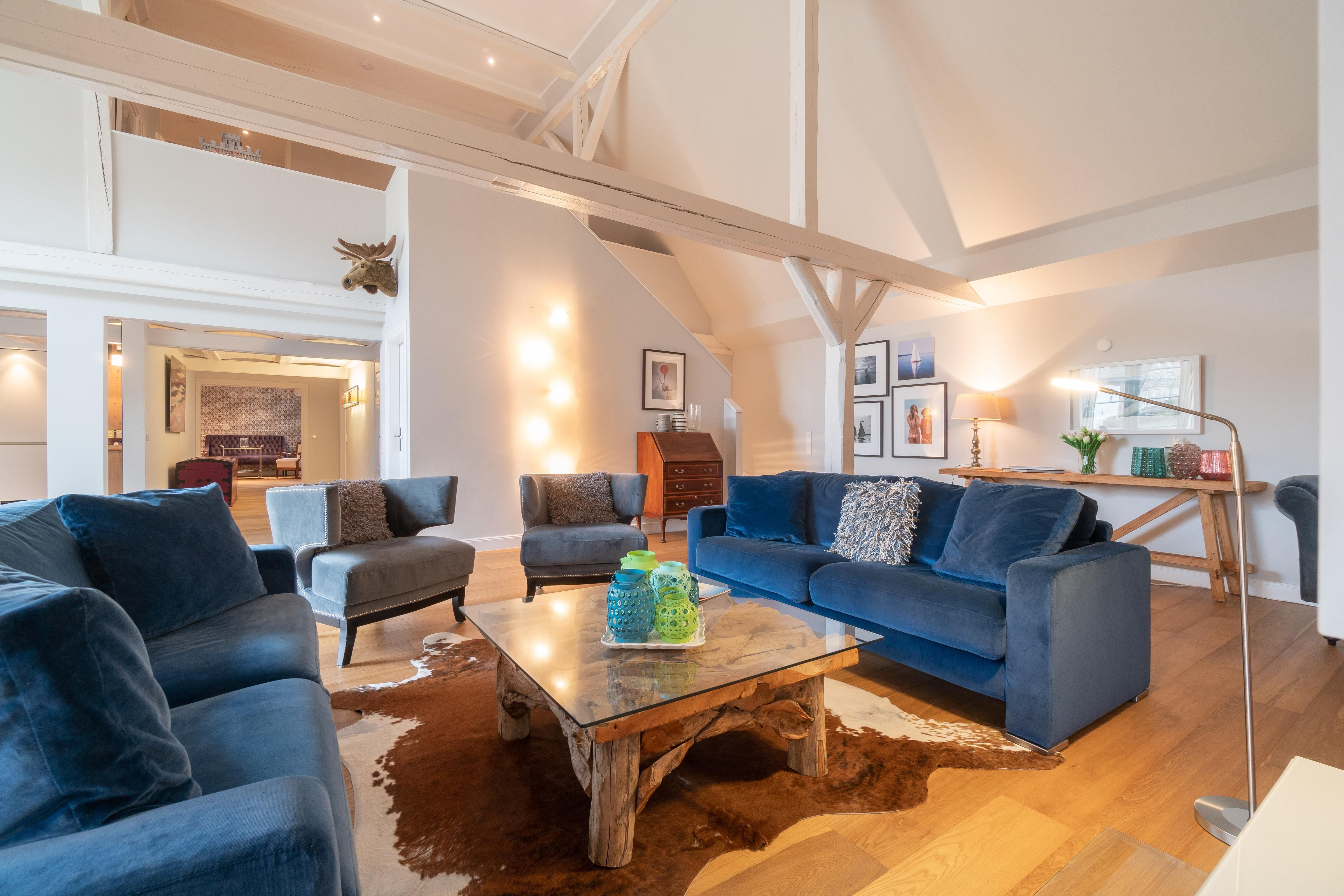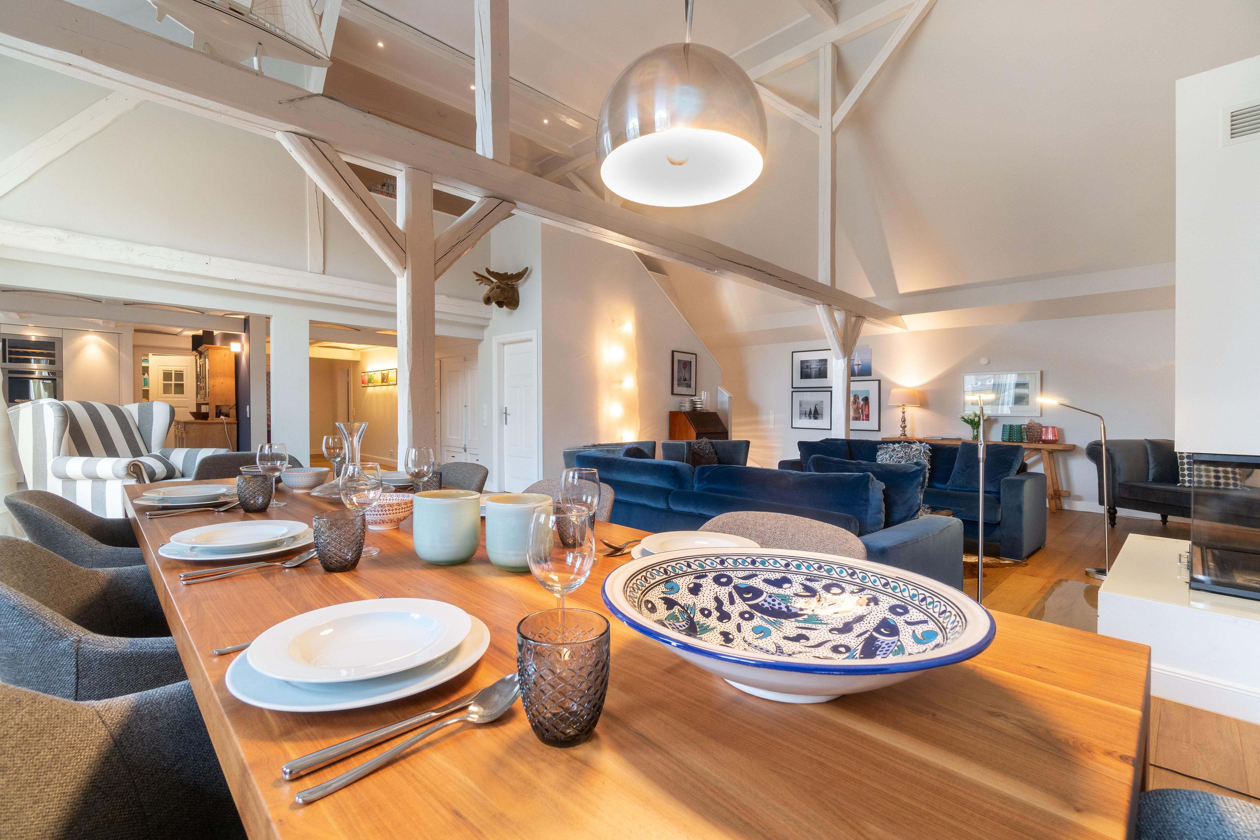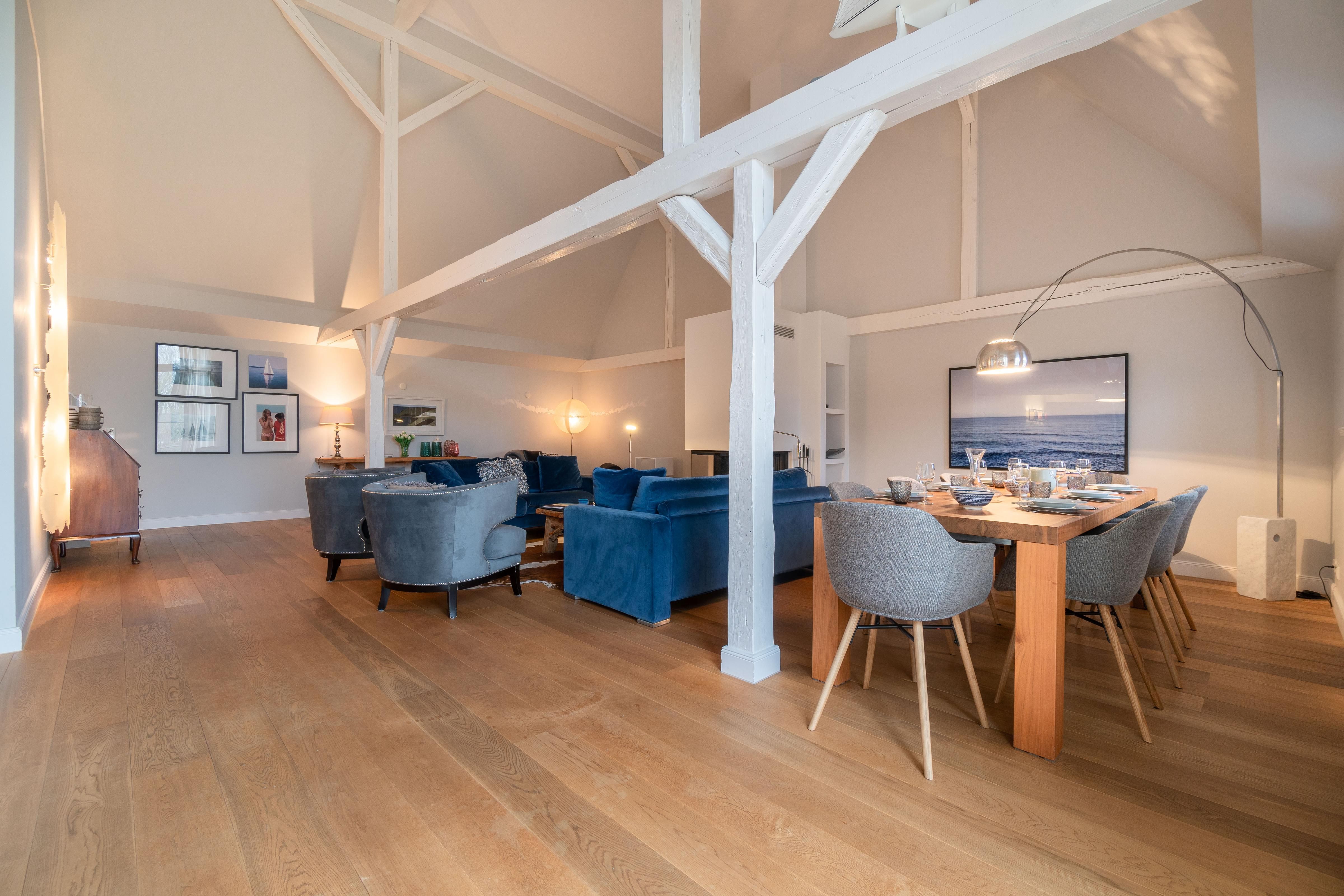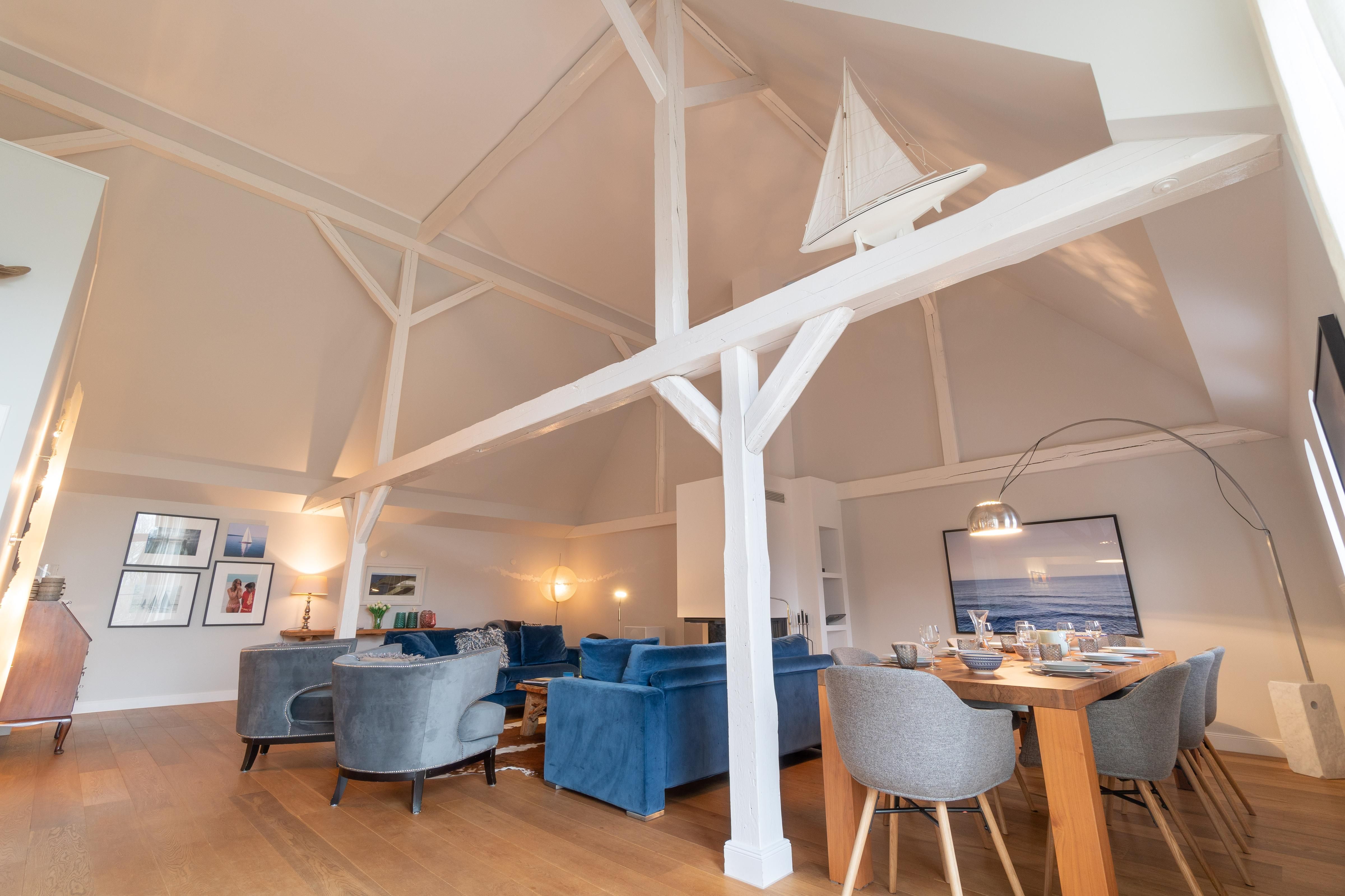 Im Obergeschoss sind die vier Schlafzimmer - jeweils mit einem Doppelbett ausgestattet -, ein Vollbad und ein Duschbad sowie ein TV- und Spielbereich gelegen. Aus dem Spielbereich haben Sie einen Ausblick in den großzügigen Wohn- und Essbereich im Erdgeschoss.