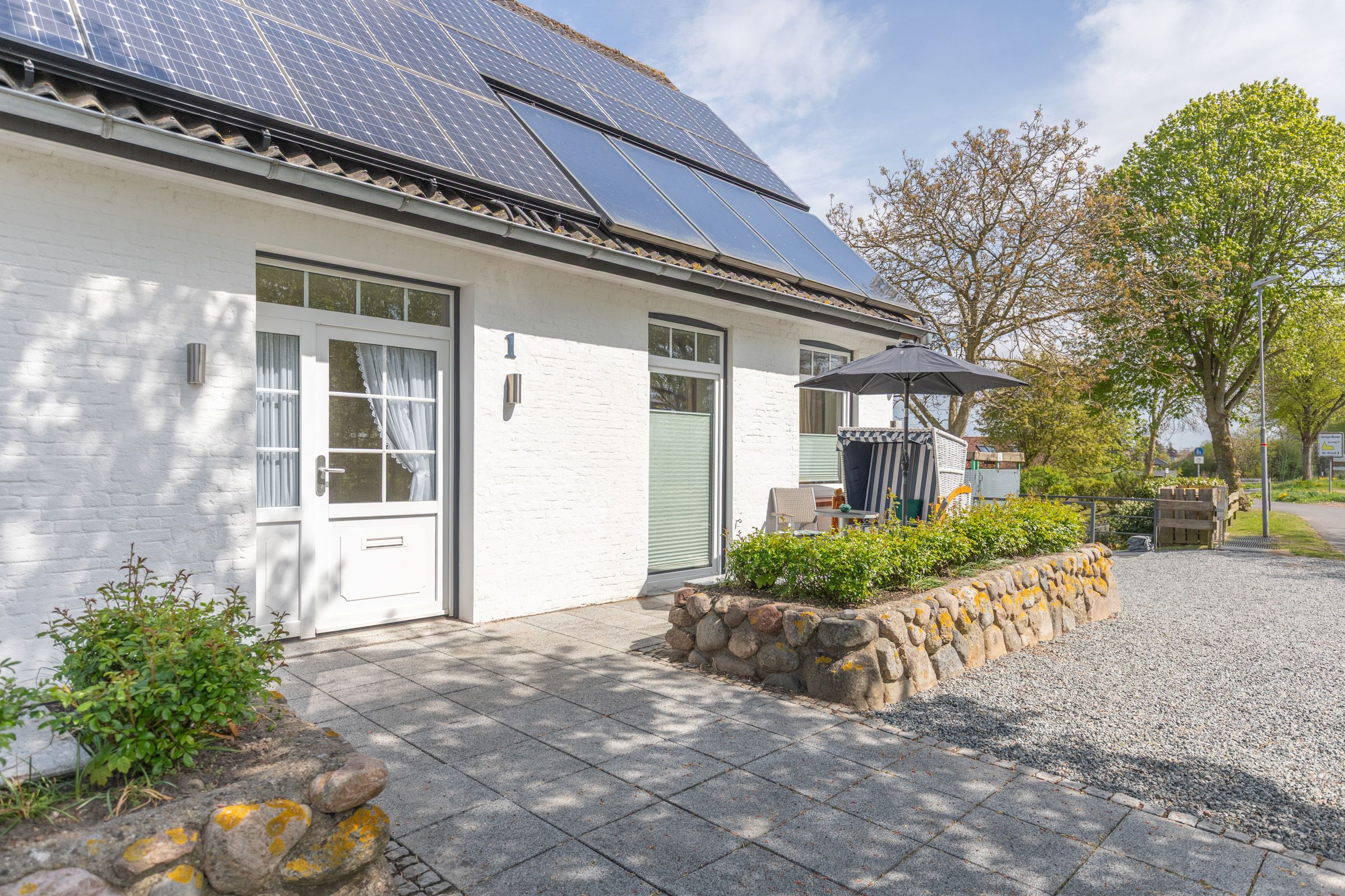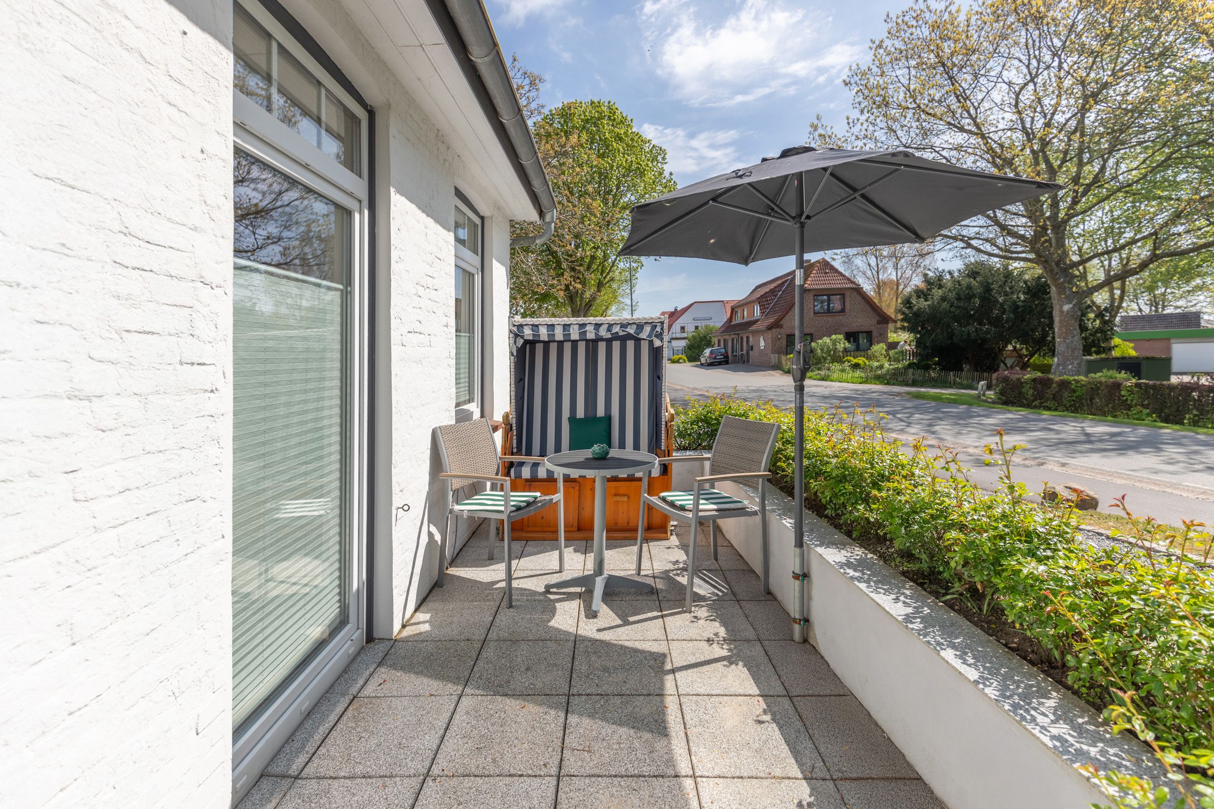 Für Ihre Erholung sorgt die großzügige Terrasse mit Gartenmöbeln und einem Strandkorb – der perfekte Ort, um den Tag bei einer Tasse Kaffee zu beginnen oder die frische Nordseeluft zu genießen. Im modernen Badezimmer erwartet Sie eine offene Dusche, und für längere Aufenthalte stehen eine gemeinschaftlich genutzte Waschmaschine und ein Trockner bereit.