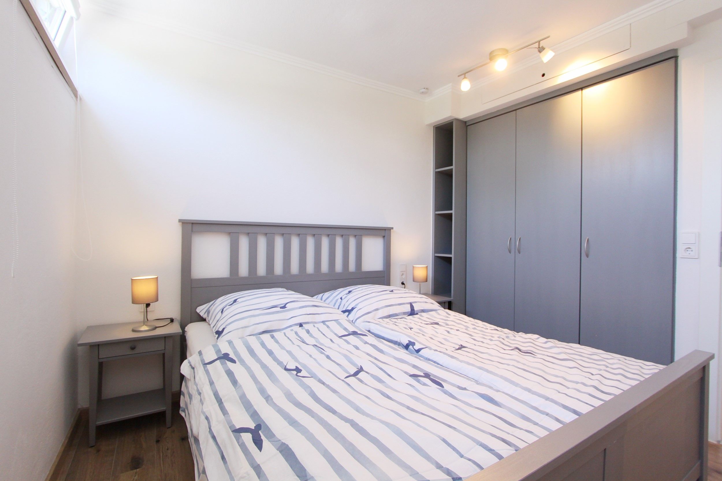 - Schlafzimmer: Doppelbett (2x 90x200), Lattenrost manuell verstellbar, Verdunkelungsrollos, Kleiderschrank, Flach TV