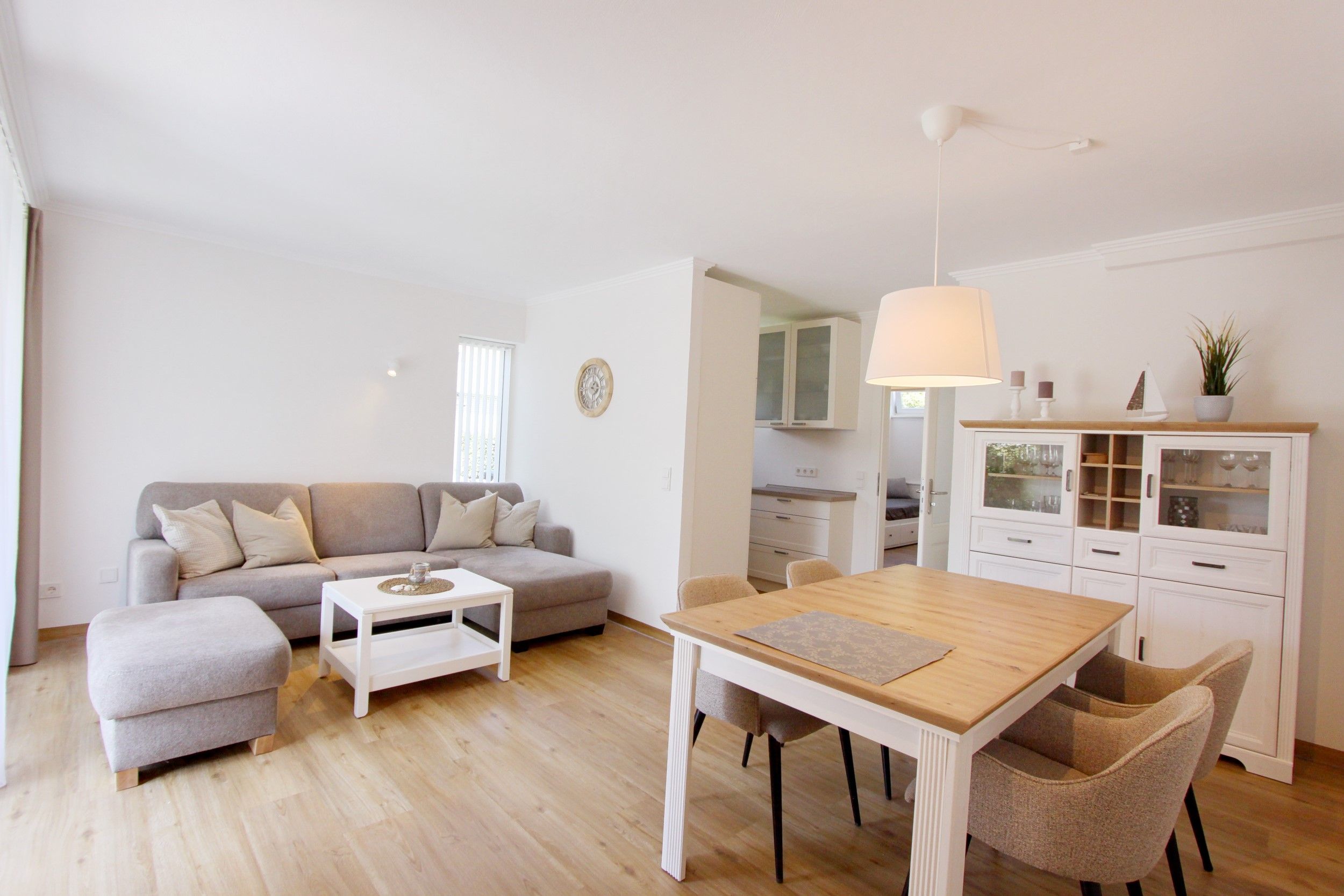 - Wohnzimmer: Eckcouch, Flat TV mit Amazon-Fire TV Stick zum selbst einloggen, Stereoanlage, halb offene Küche