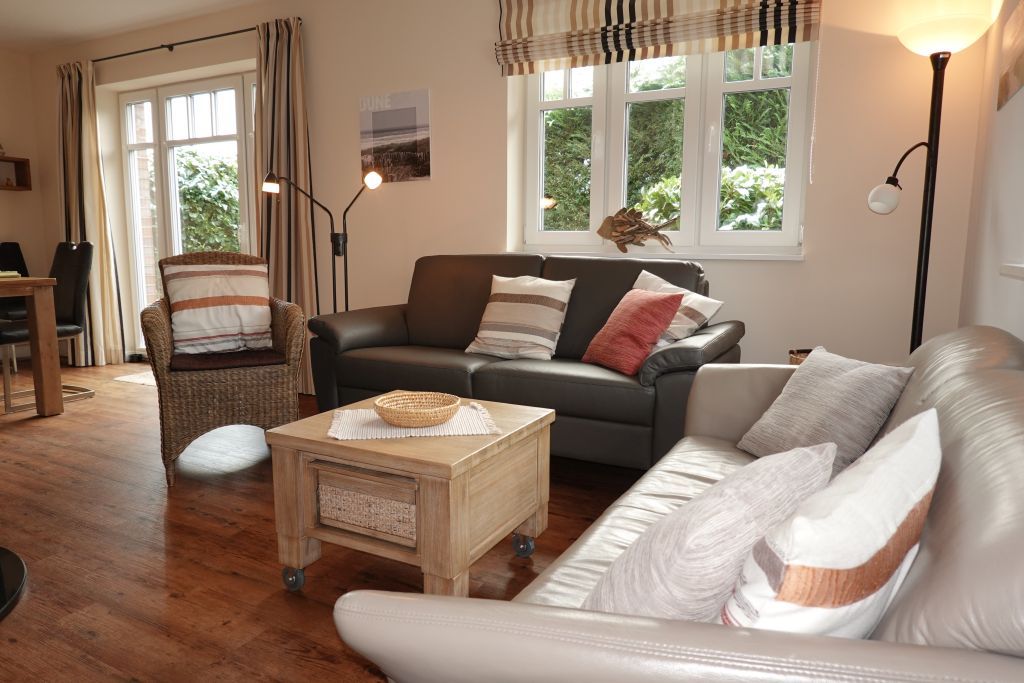 Die Innenausstattung von Haus Achtundzwanzig überzeugt durch eine Kombination aus stilvoller Geradlinigkeit und Funktionalität. Im Wohnzimmer, das mit einem wertigen Parkettboden ausgestattet ist, erwartet Sie ein Kaminofen, der insbesondere in den Abendstunden eine angenehme Atmosphäre schafft. Zwei komfortables Sofas, Sessel sowie ein moderner Fernseher (insgesamt verfügt das Haus über vier TV-Geräte mit digitalem Anschluss) und ein DVD- sowie CD-Spieler bieten unterschiedliche Möglichkeiten der Unterhaltung. Auch Bücher für gemütliche Lesestunden sind vorhanden.