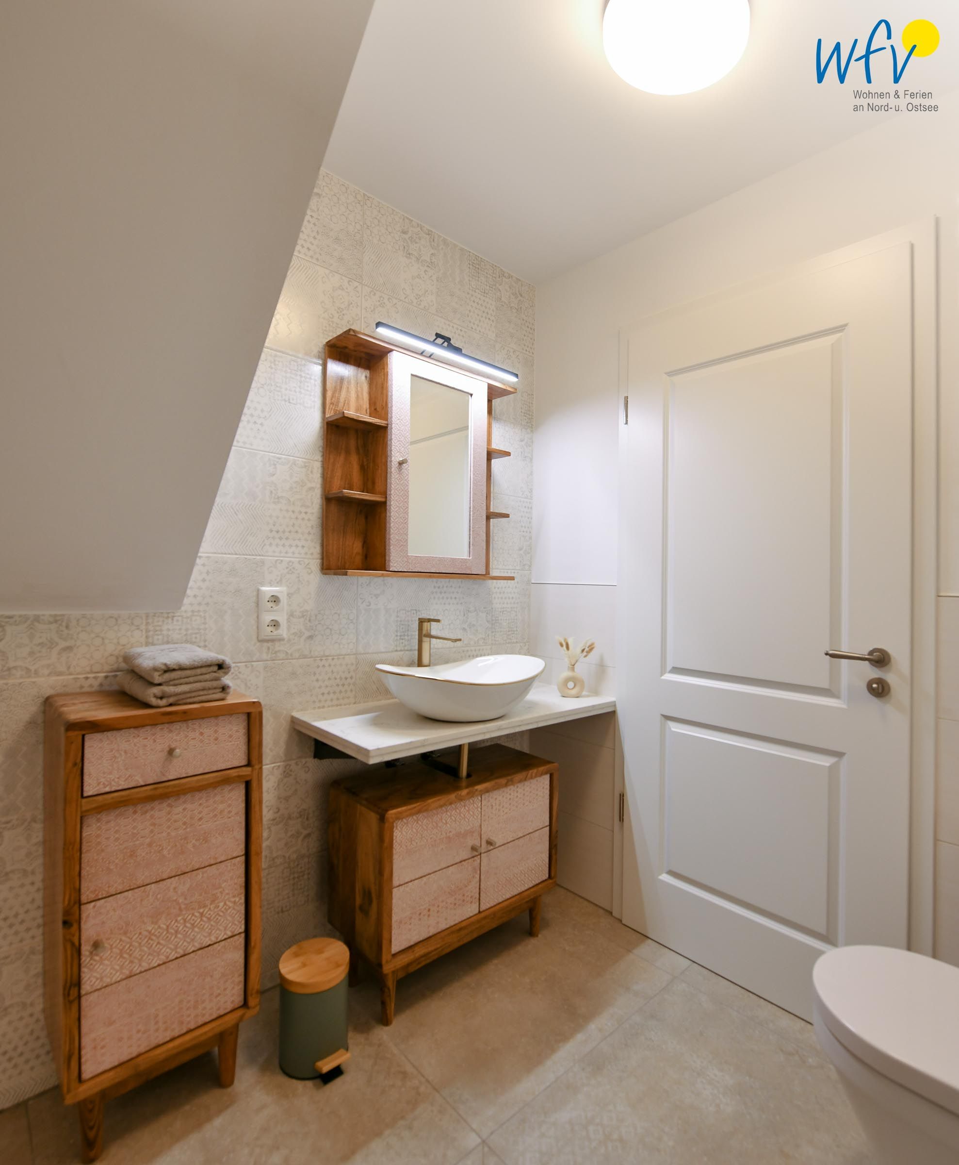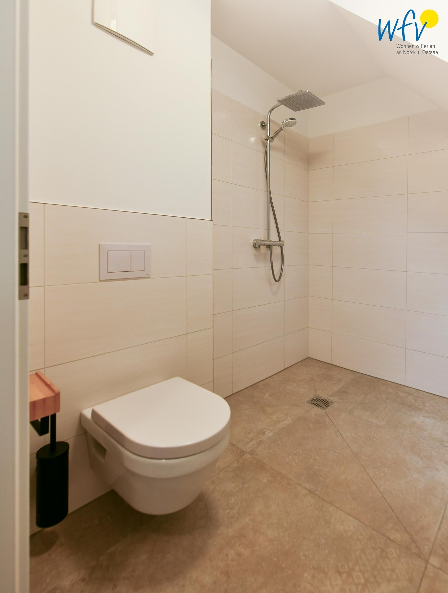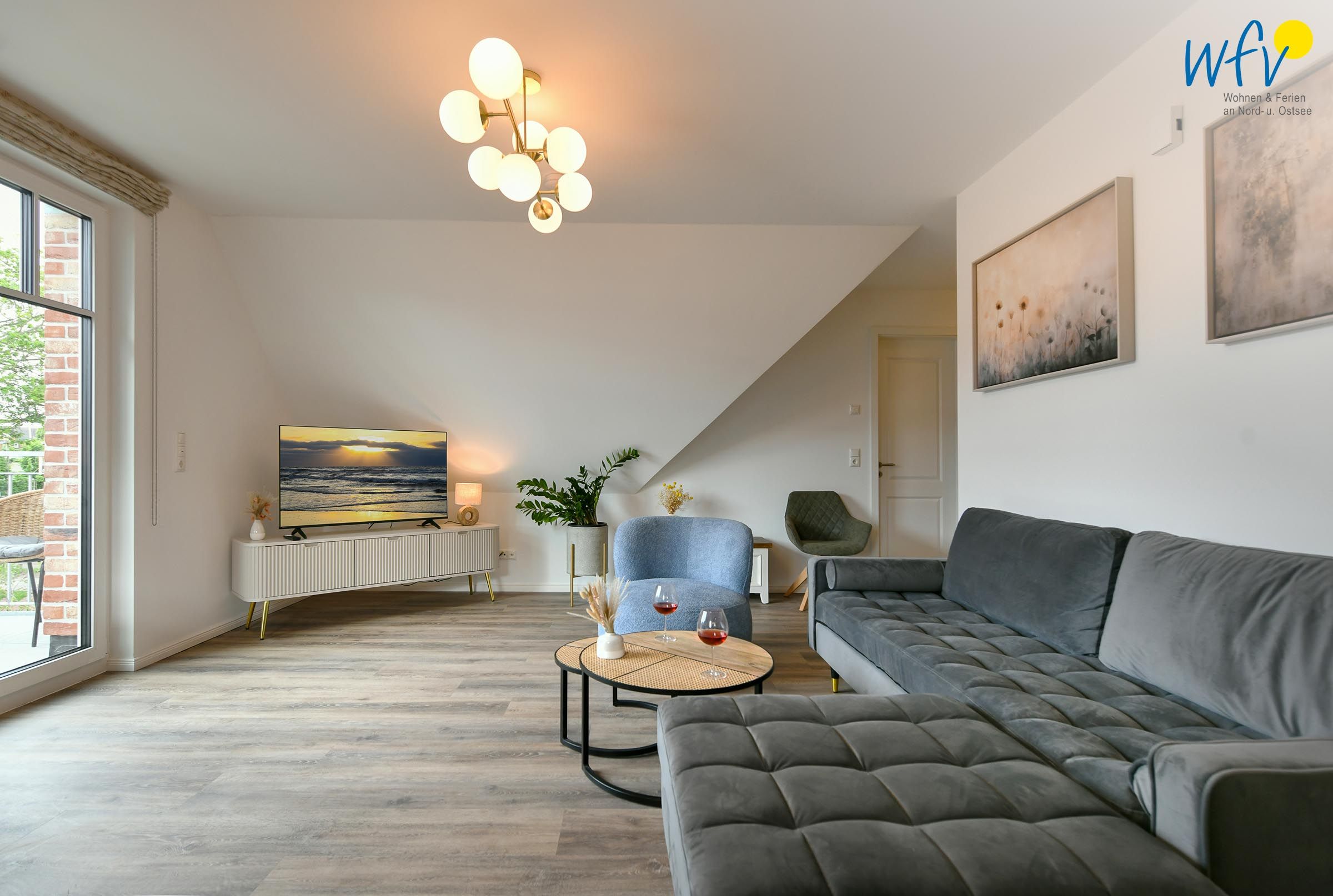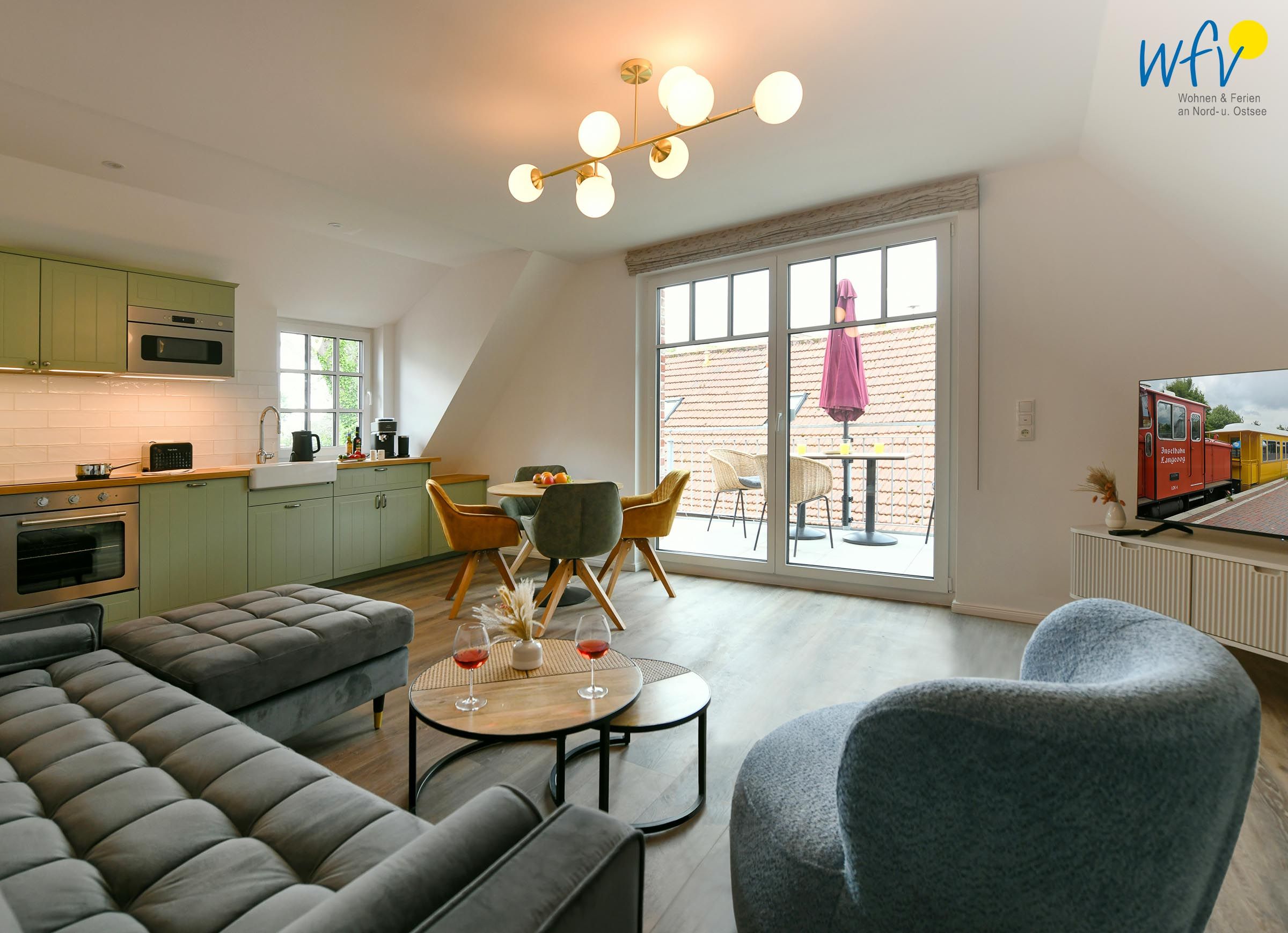 Die Maisonette-Ferienwohnung verfügt über ein modernes, offenes Wohnkonzept über zwei Etagen, das für ein weites Raumgefühl sorgt. Im Dachgeschoss sind Wohnbereich und Küche harmonisch miteinander verbunden, sodass Sie hier nach dem Strandtag oder der Fahrradtour gemütliche Abende auf dem bequemen Sofa verbringen, fernsehen und lesen können oder das gemeinsame Kochen genießen. Für kulinarische Erlebnisse ist die moderne Küche mit einem 4-Platten-Induktionsherd, einem Backofen, einer Mikrowelle, einem Kühlschrank mit Gefrierfach sowie einer Spülmaschine ausgestattet. Der angrenzende Wohnbereich lädt zu gemeinsamen Mahlzeiten ein.
