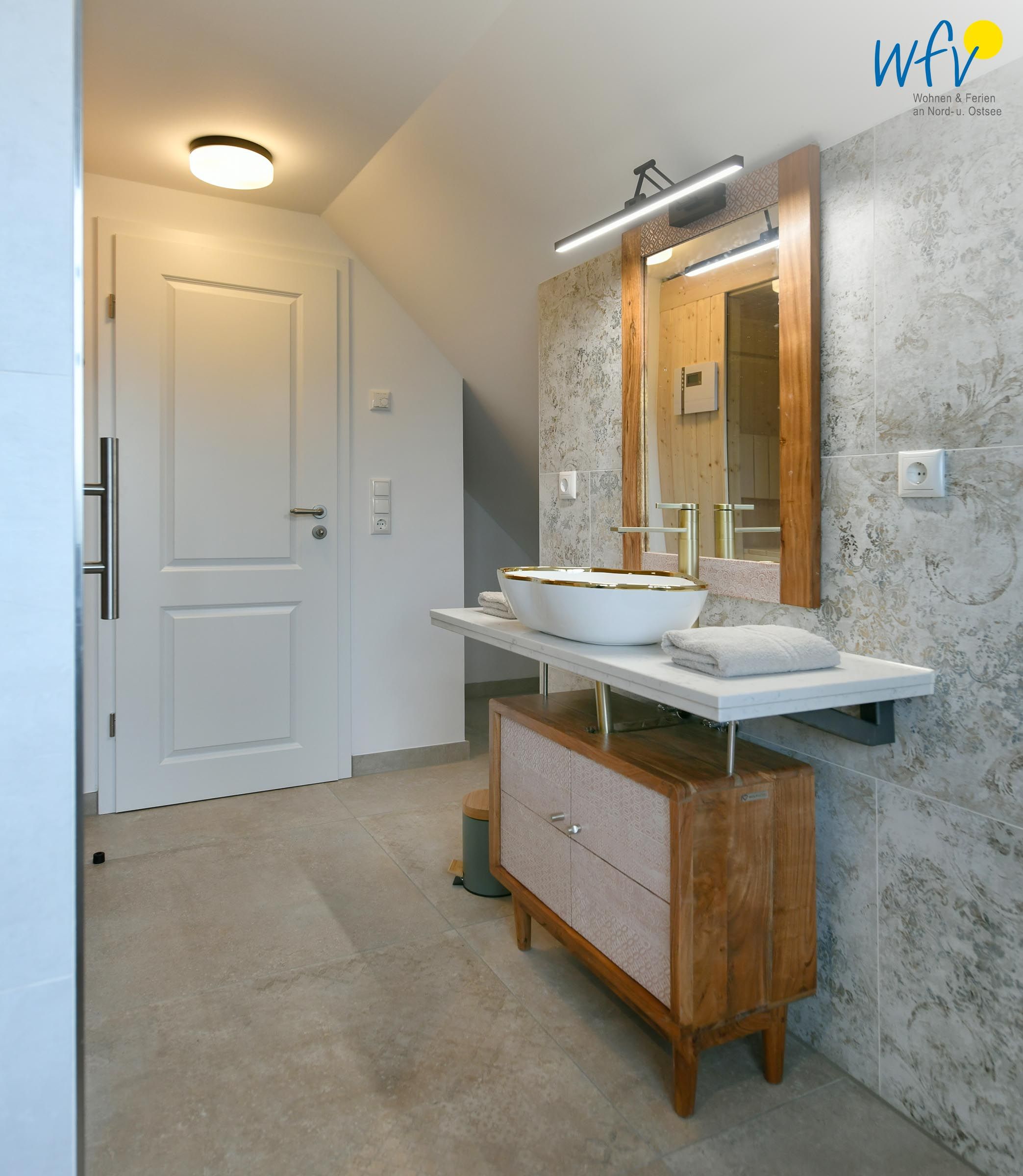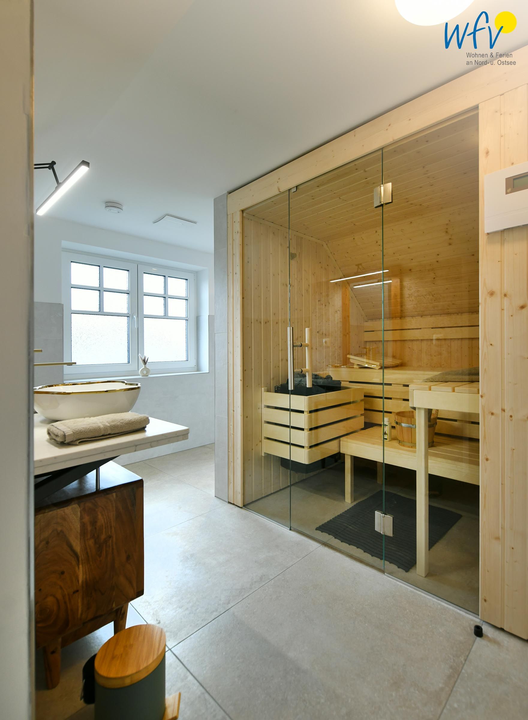 Ein Badezimmer im EG und ein elegantes Badezimmer im SP mit eigener Sauna und offenem Duschbereich sorgen für wohltuende Entspannungszeit und Ausweichmöglichkeiten.