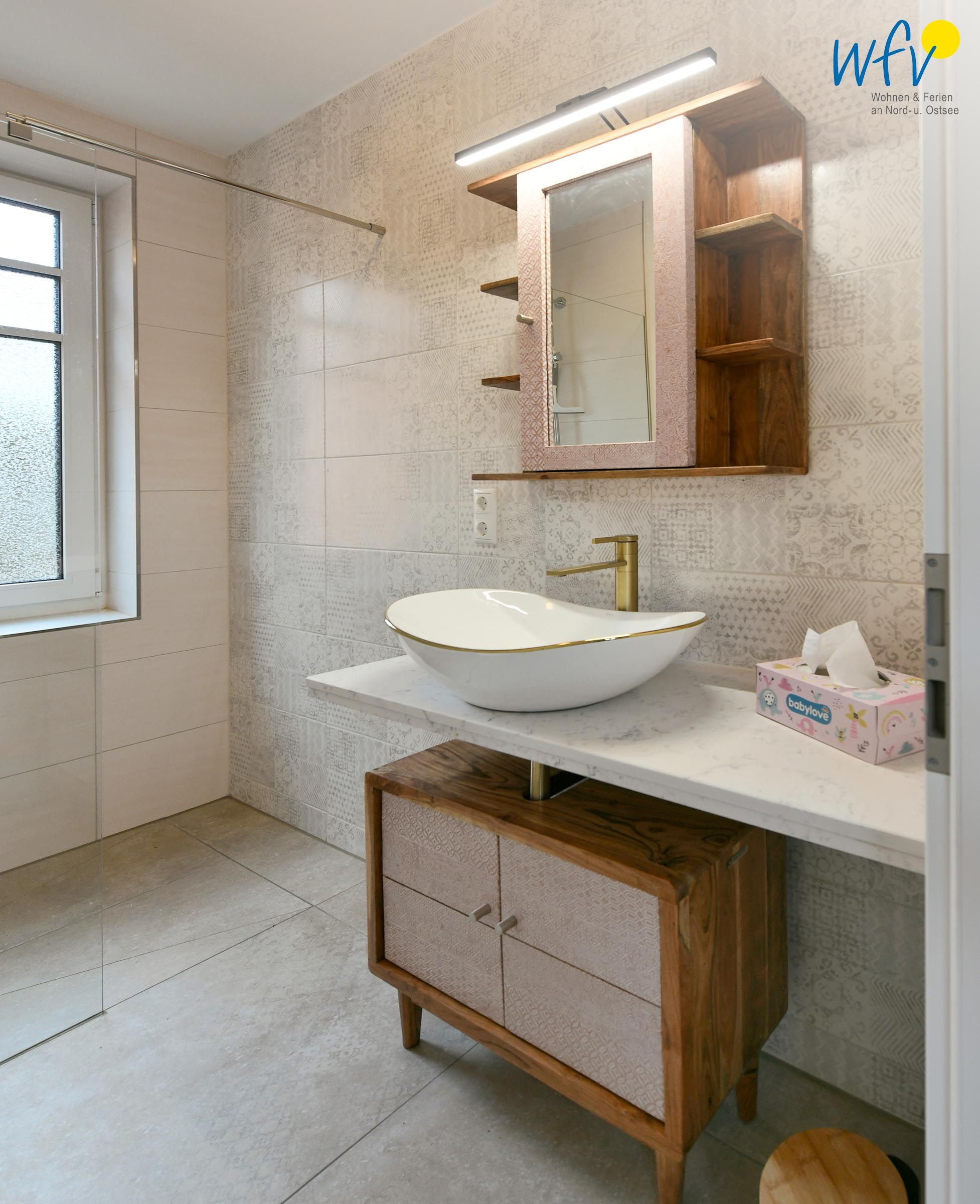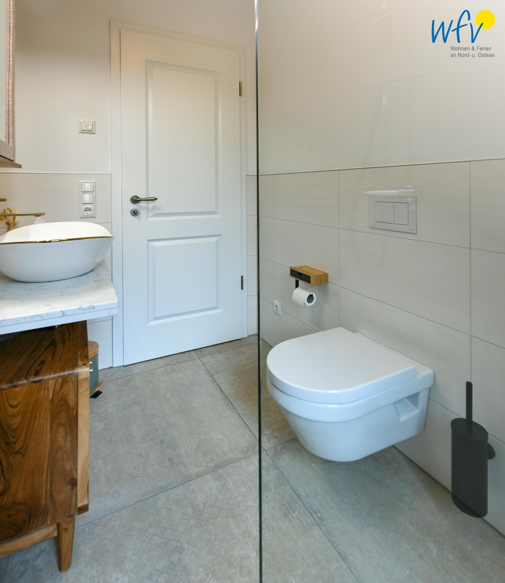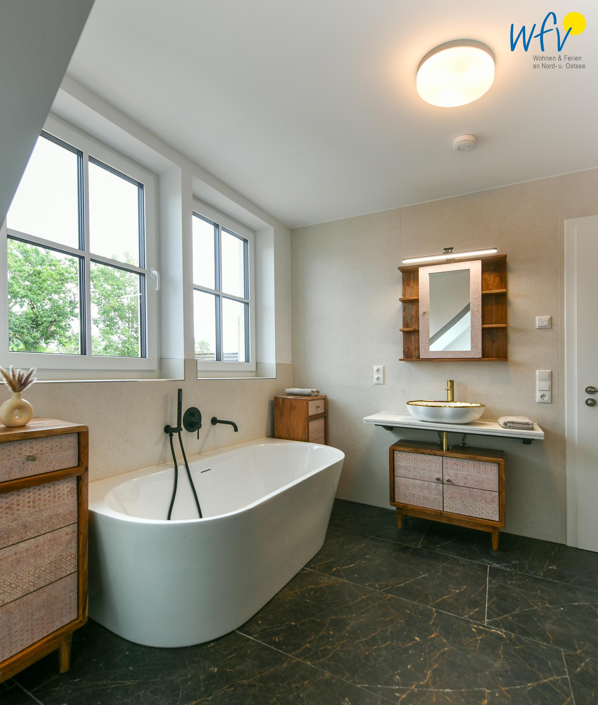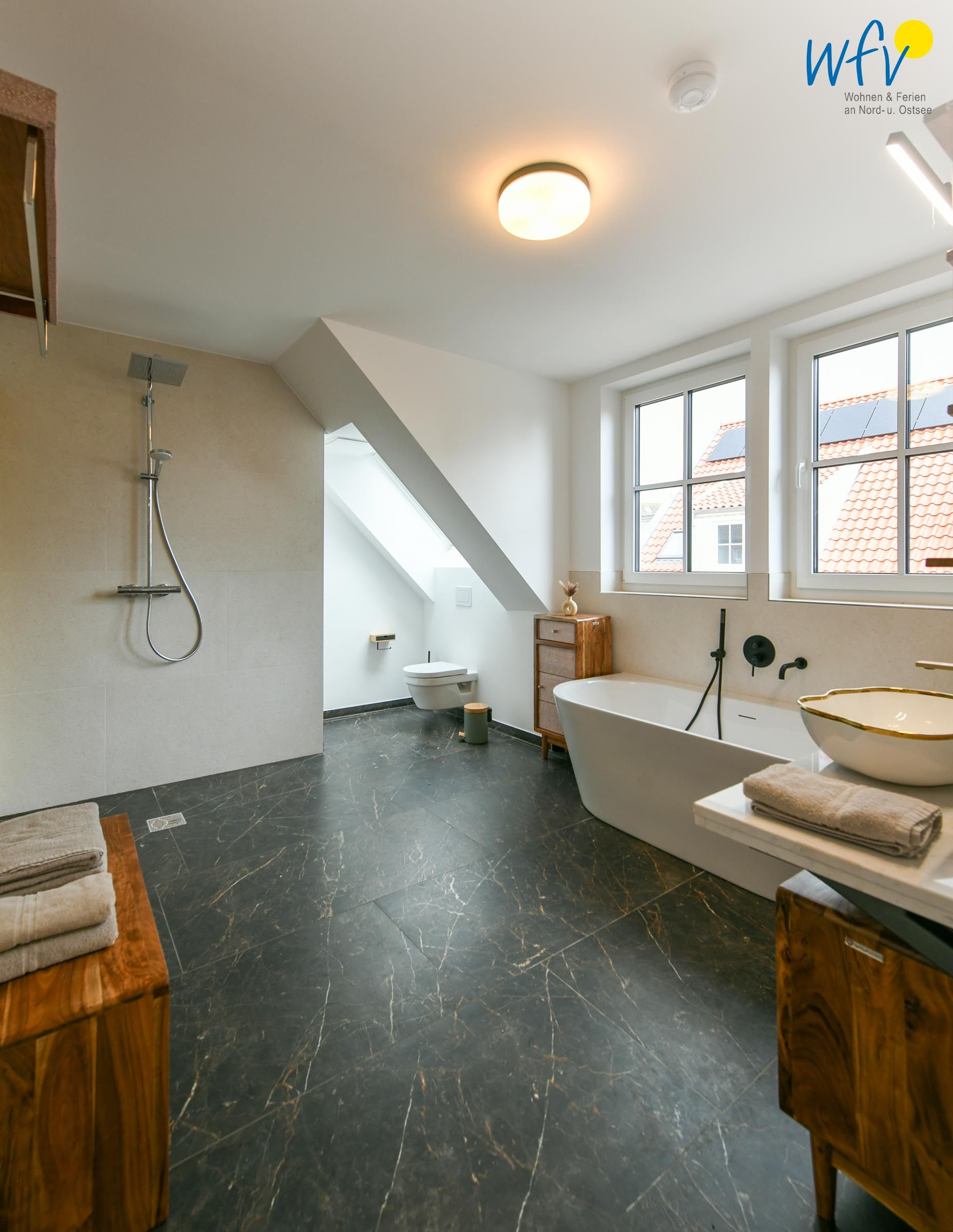 Zwei elegante Tageslichtbäder (EG + DG) sorgen für angenehme Ausweichmöglichkeiten. In dem Bad mit Dusche, Badewanne und eigener Sauna genießen Sie wohltuende Entspannungszeit.