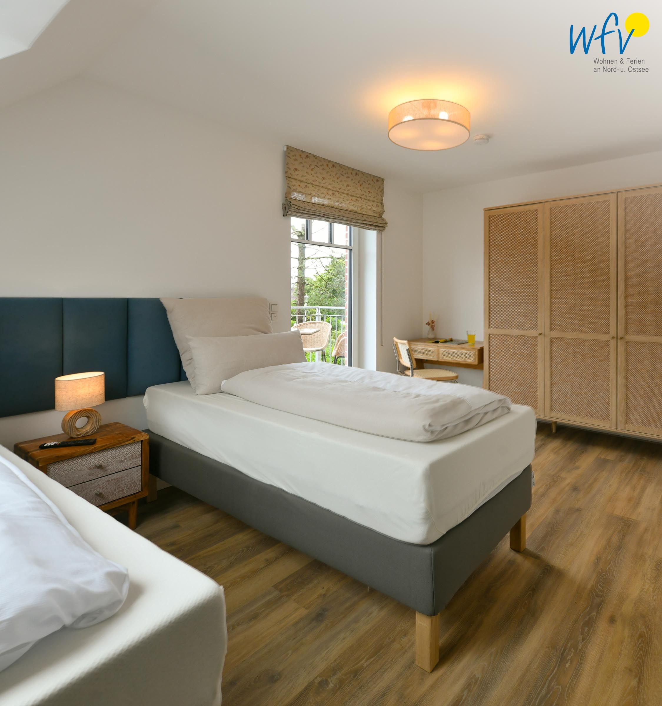 Die zwei separaten Schlafzimmer (EG + DG) bieten Ihnen sowohl Komfort, als auch Privatsphäre. Ein Schlafzimmer ist mit einem komfortablen Kingsize-Boxspringbett ausgestattet, das zweite Schlafzimmer beinhaltet zwei Einzelbetten, die bei Bedarf auch zusammengeschoben werden können.