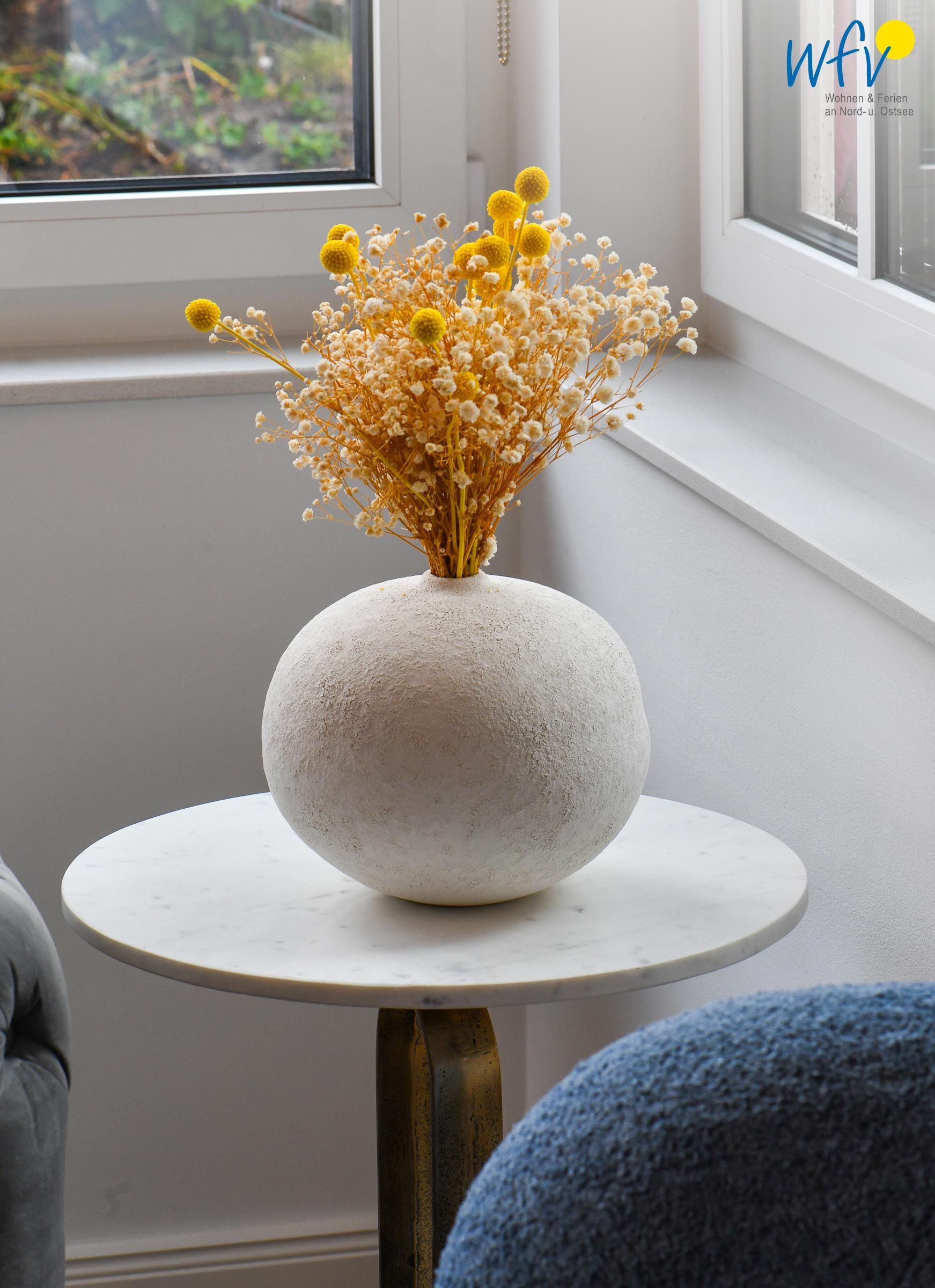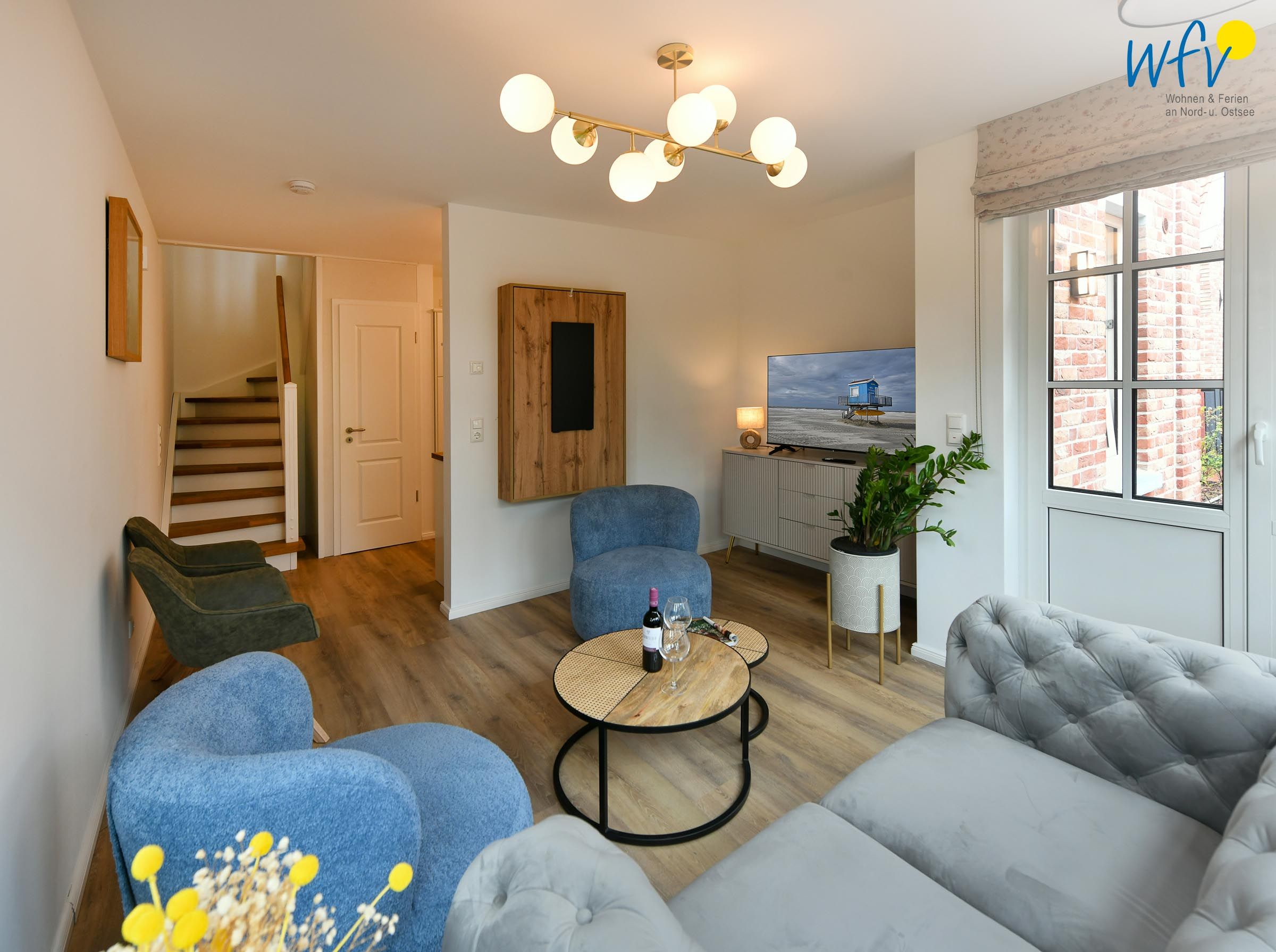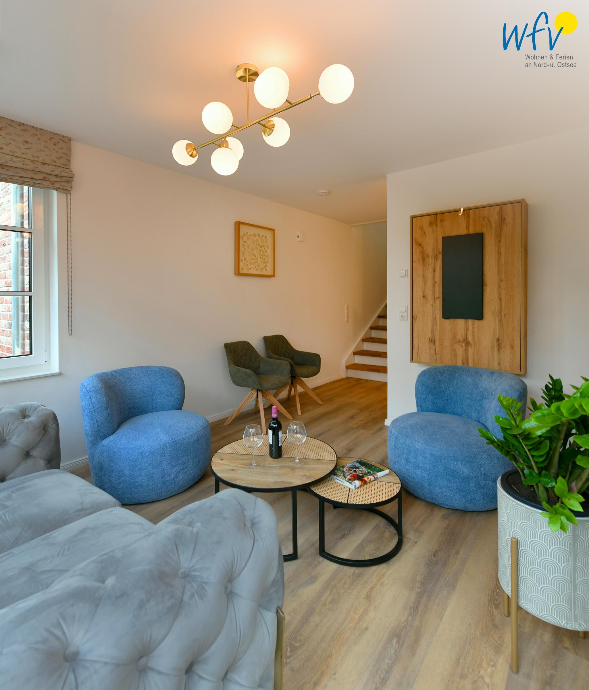 Die Maisonette-Ferienwohnung verfügt über ein modernes, offenes Wohnkonzept über zwei Etagen. Im Erdgeschoss sind Wohnbereich und Küche harmonisch miteinander verbunden und eine breite Fensterfront mit schönem Lichteinfall sorgt für ein weites Raumgefühl. Hier können Sie nach dem Strandtag oder der Fahrradtour gemütliche Abende auf dem bequemen Sofa verbringen, fernsehen, lesen oder einfach die angenehme Atmosphäre des Raumes genießen. Für kulinarische Erlebnisse ist die moderne Küche mit einem 4-Platten-Induktionsherd, einem Backofen, einer Mikrowelle, einem Kühlschrank mit Gefrierfach sowie einer Spülmaschine ausgestattet. Der angrenzende Wohnbereich lädt zu gemeinsamen Mahlzeiten ein.