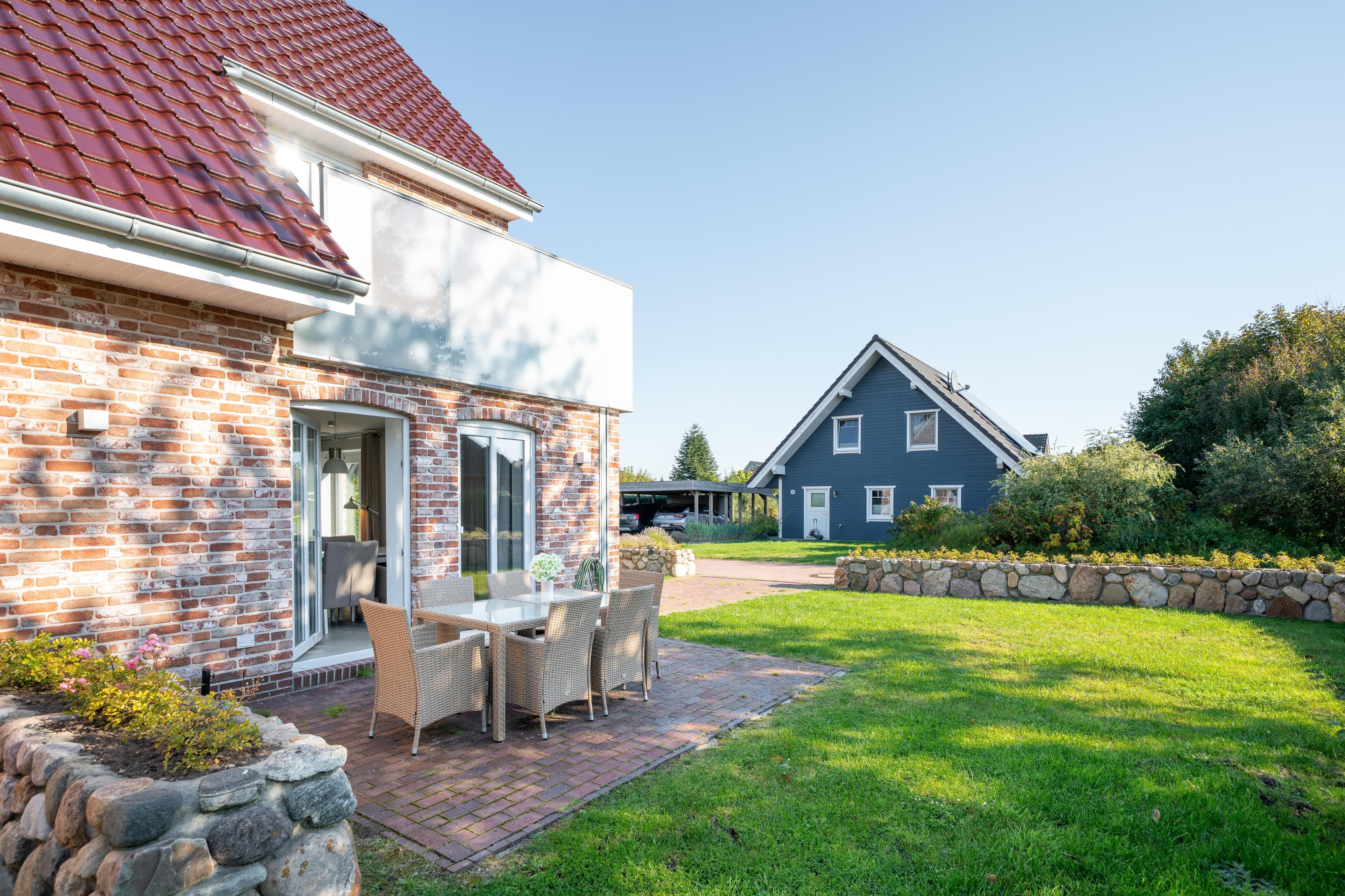 Das Erdgeschoss öffnet sich zur überdachten Terrasse mit Grill. Im weitläufigen Garten mit Liegewiese, Gartenmöbeln und eigenem Strandkorb genießen Sie entspannte Stunden an der frischen Nordseeluft. Auch ein Balkon mit Blick ins Grüne sorgt für erholsame Momente. Für Autos steht ein privater, kostenfreier Parkplatz direkt am Haus bereit.