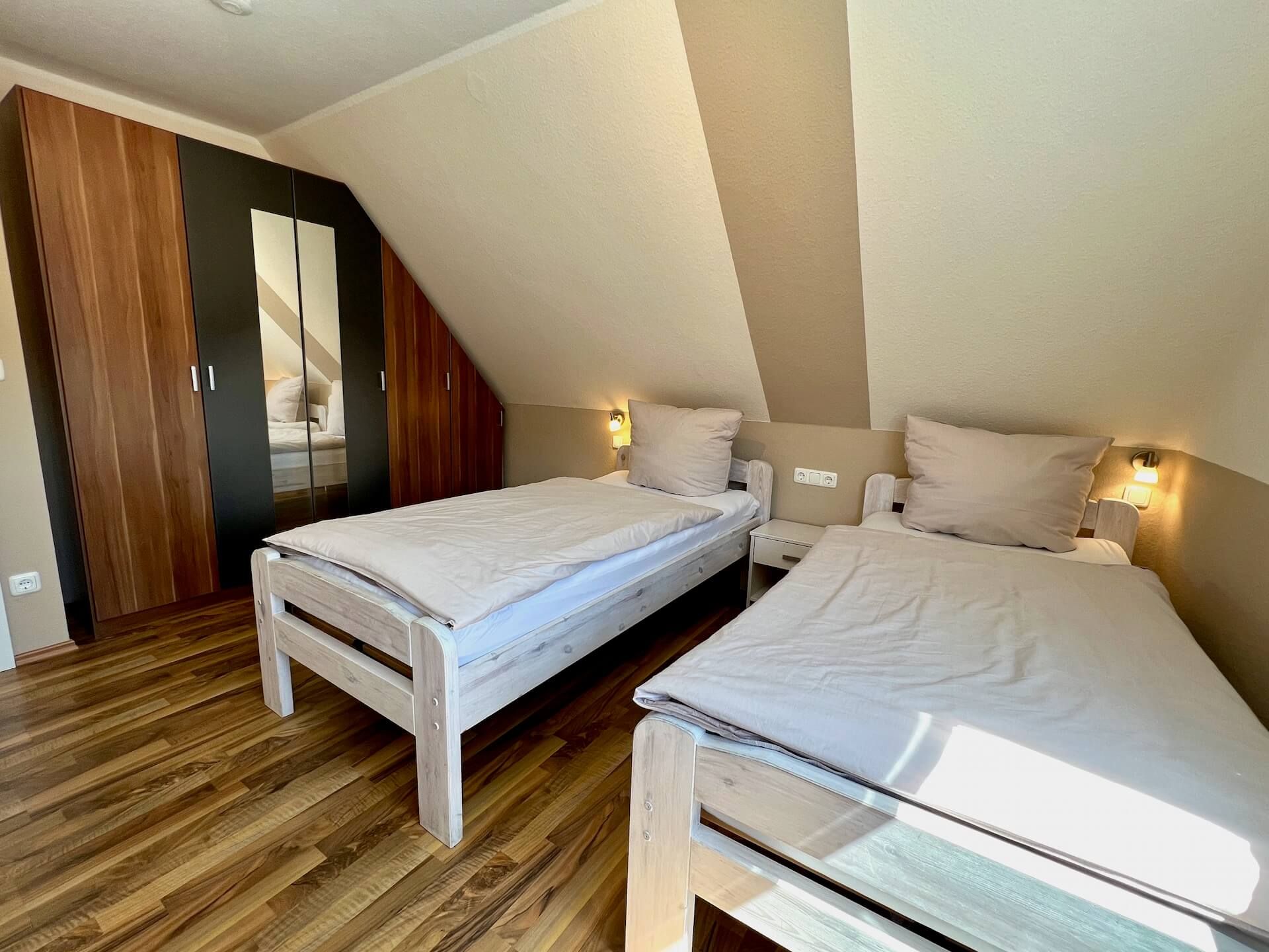 - ein Schlafzimmer mit zwei Einzelbetten und Kleiderschrank