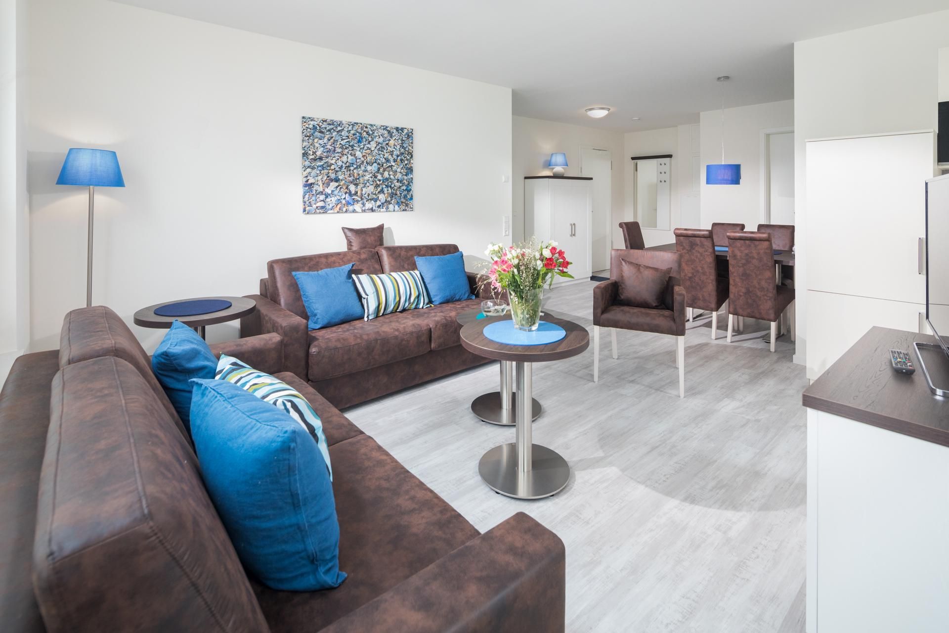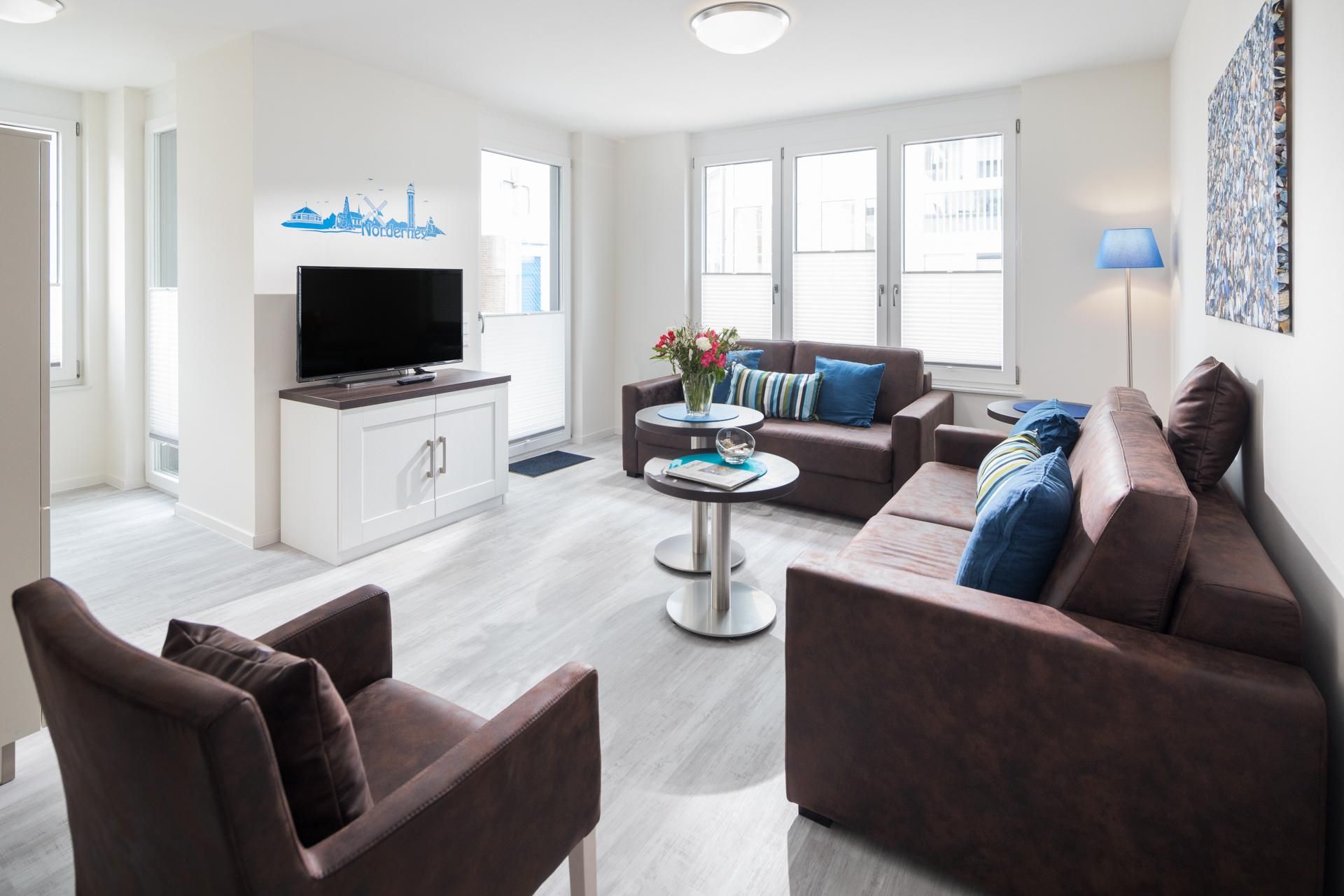 In der Wohnung stehen insgesamt 3 Schlafzimmer zur Verfügung: Zwei der Schlafzimmer sind mit Doppelbetten ausgestattet, während das dritte Schlafzimmer über ein Einzelbett verfügt. Dadurch eignet sich die Wohnung ideal für Familien oder Gruppen. Zudem sind zwei Badezimmer in der Wohnung vorhanden. Eine Besonderheit der Ferienwohnung ist die kleine Loggia, die eine Fläche von 5 Quadratmetern aufweist. Diese Loggia ist nach Süd-Westen ausgerichtet. Ein weiterer Pluspunkt des Aufenthalts im Haus Insulaner ist der angebotene Frühstücksservice. Gäste können ein Frühstück im Hotel Friese genießen, das sich schräg gegenüber befindet. Kosten und Buchung müssen von den Gästen direkt mit dem Hotel abgesprochen werden. Auch Hunde sind hier erlaubt, maximal ein Hund (Höhe maximal kniehoch). Die Hundewiese befindet sich in der Nähe des Fährhafens (kein Leinenzwang).
