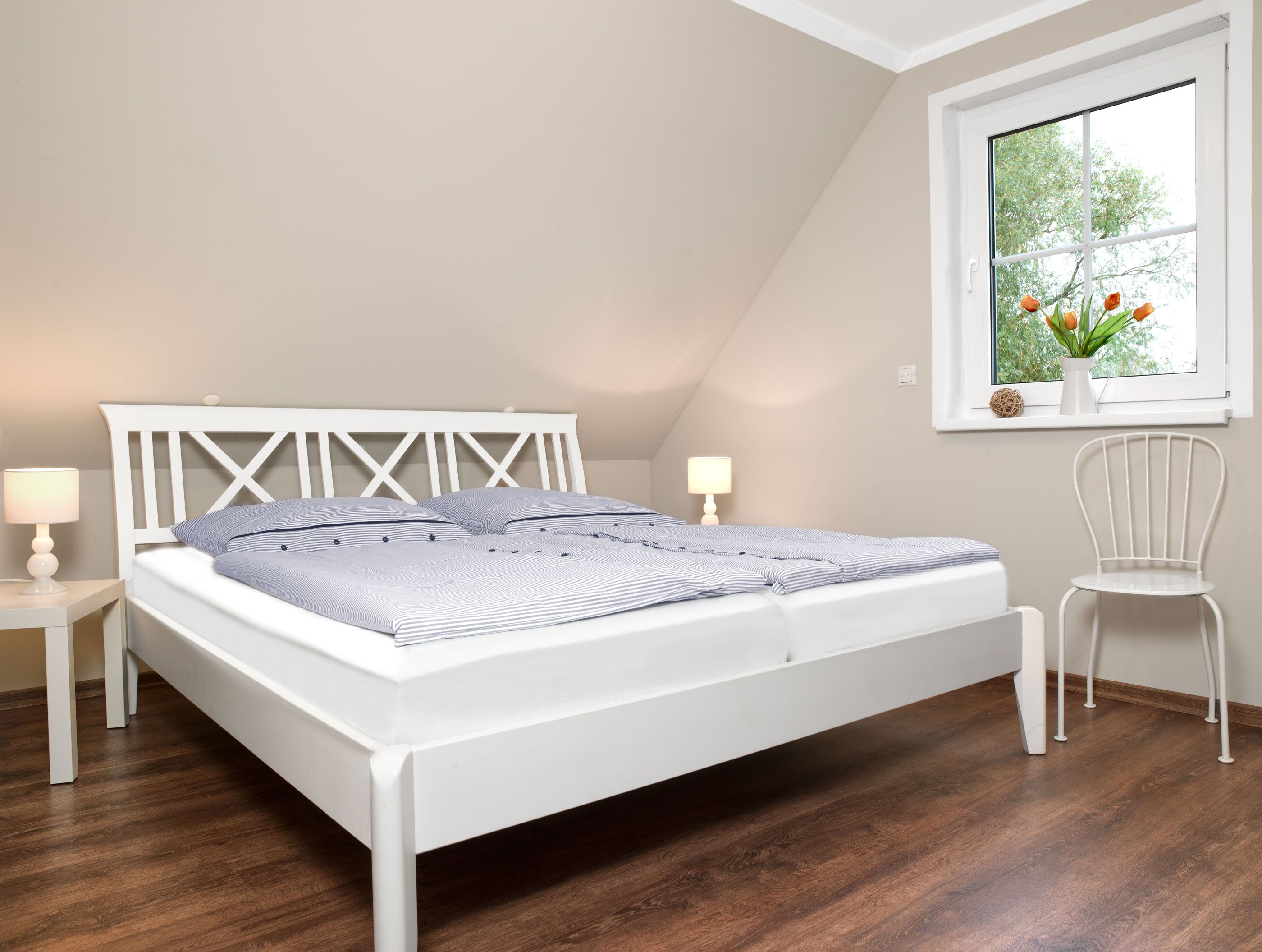 Im Obergeschoss gibt es zwei weitere Schlafzimmer, eines davon mit zusätzlichem TV ausgestattet.