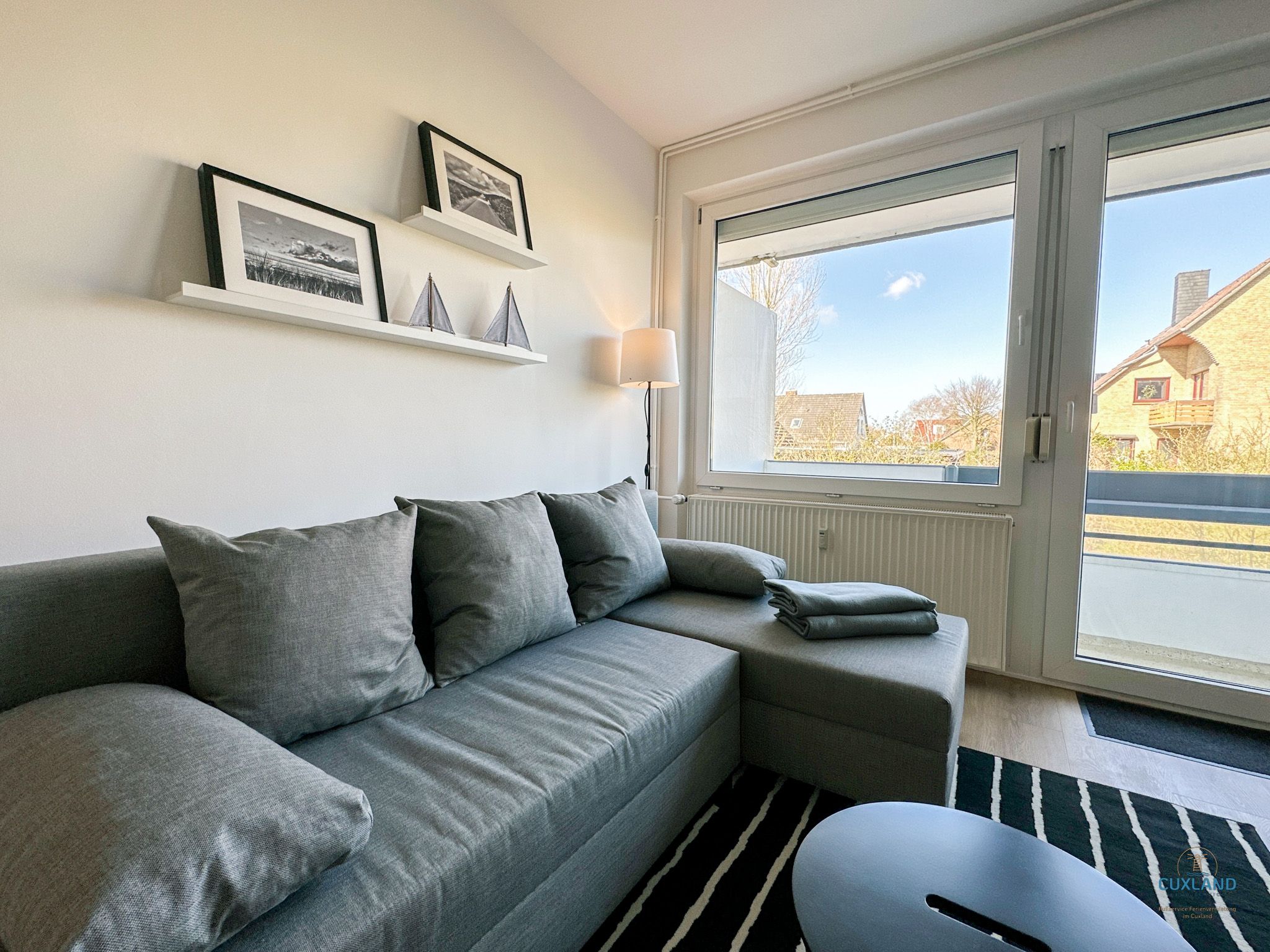 hellen Wohnbereich mit einer praktischen Schlafcouch. Die offene Küche lädt zum