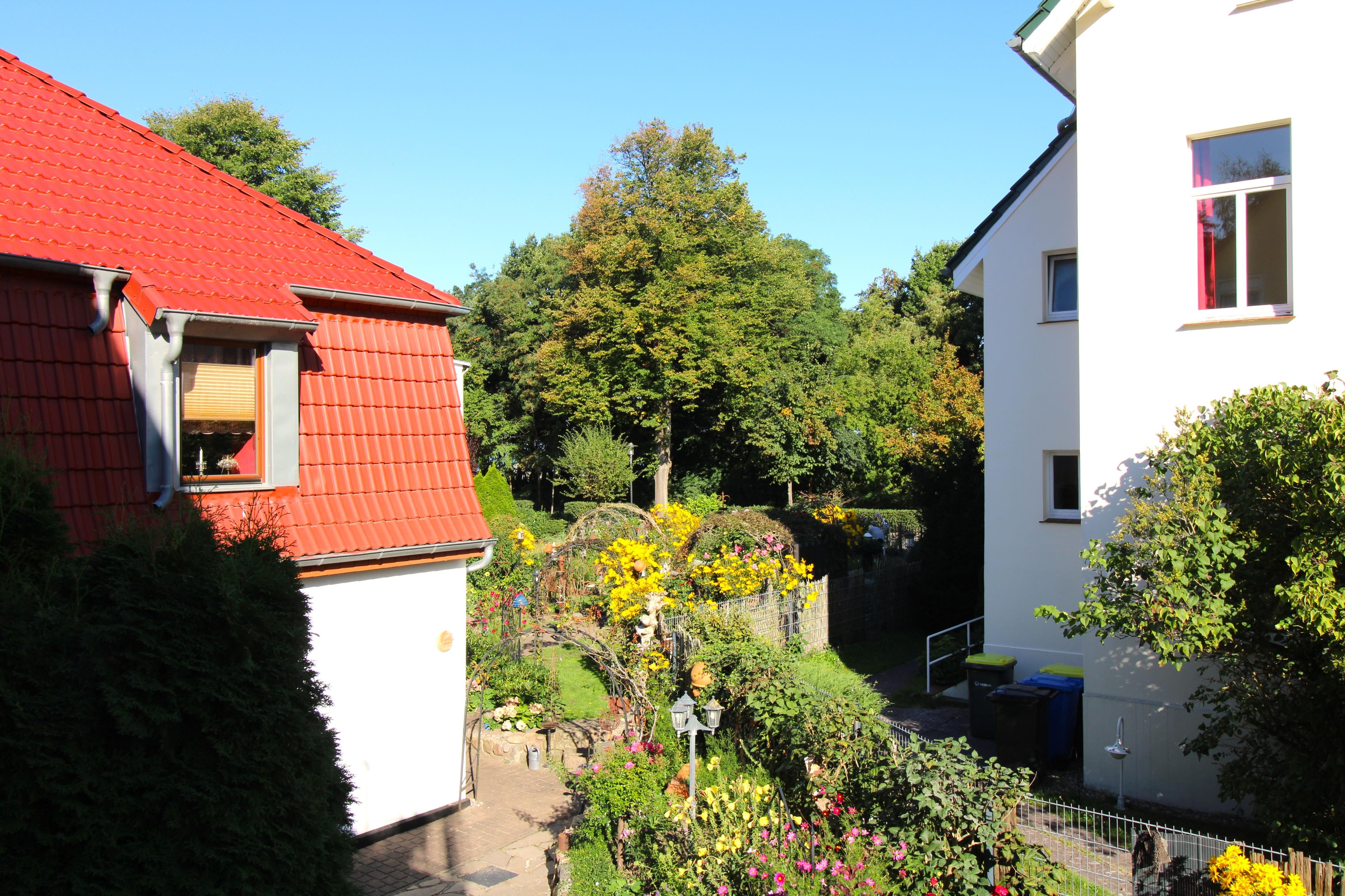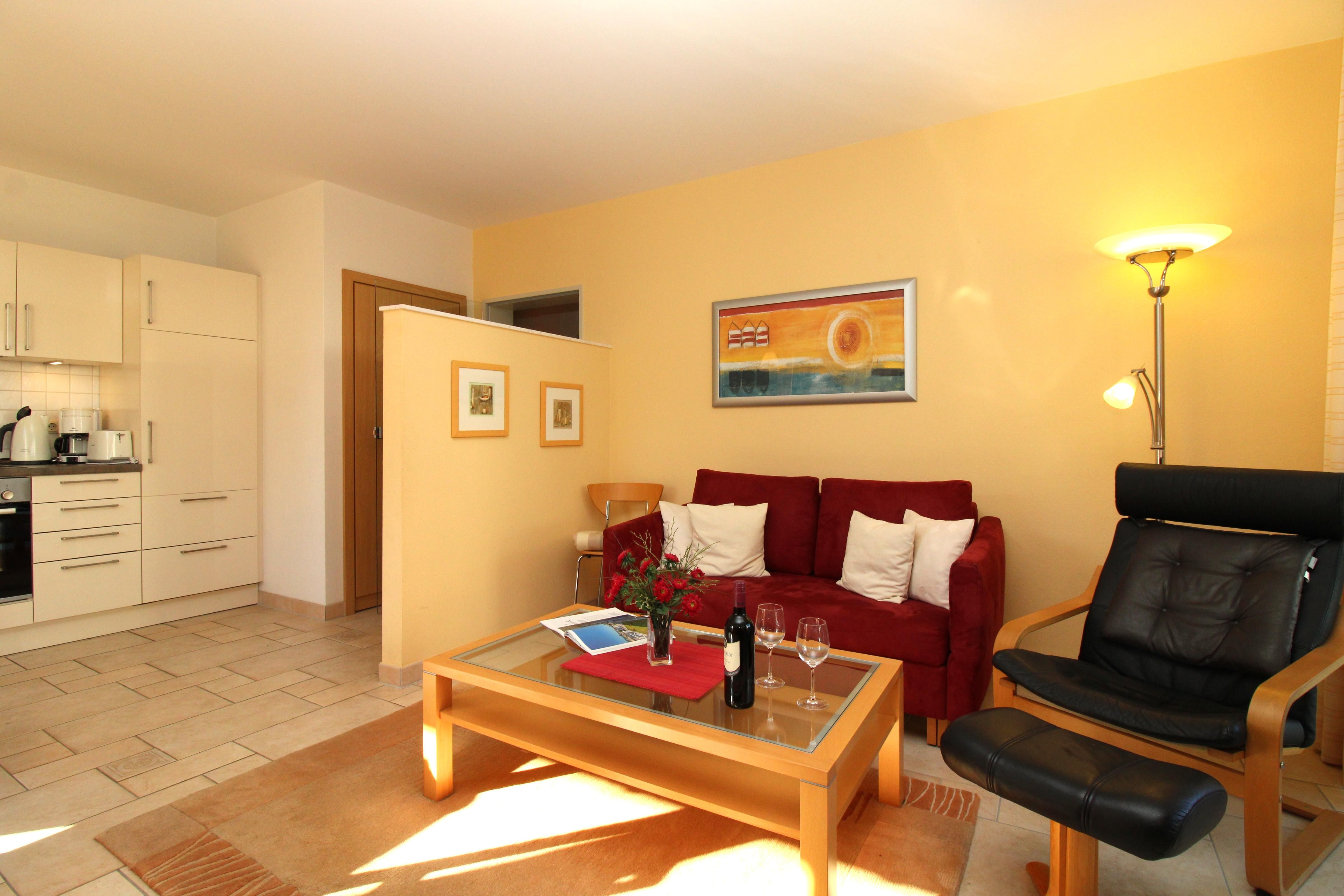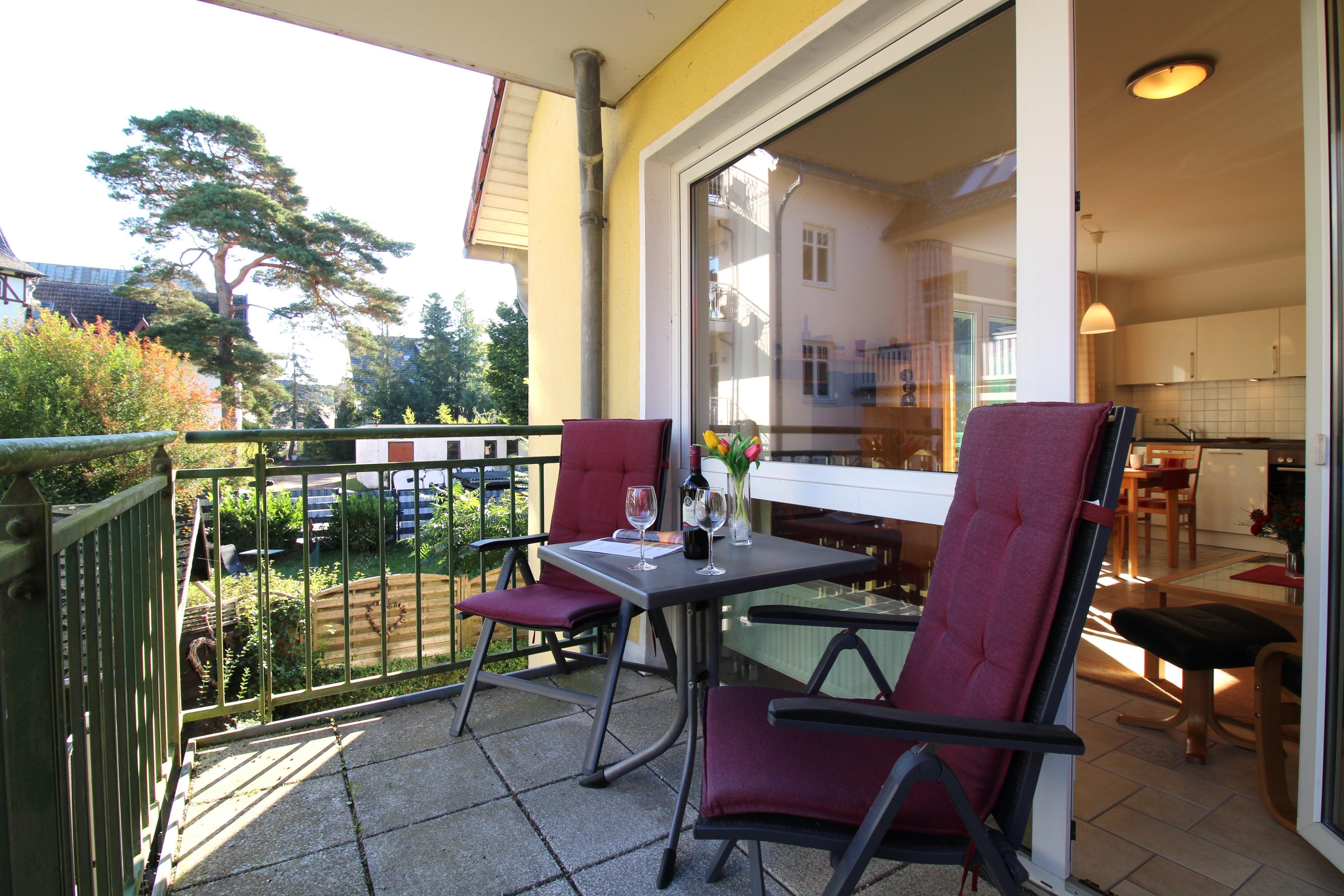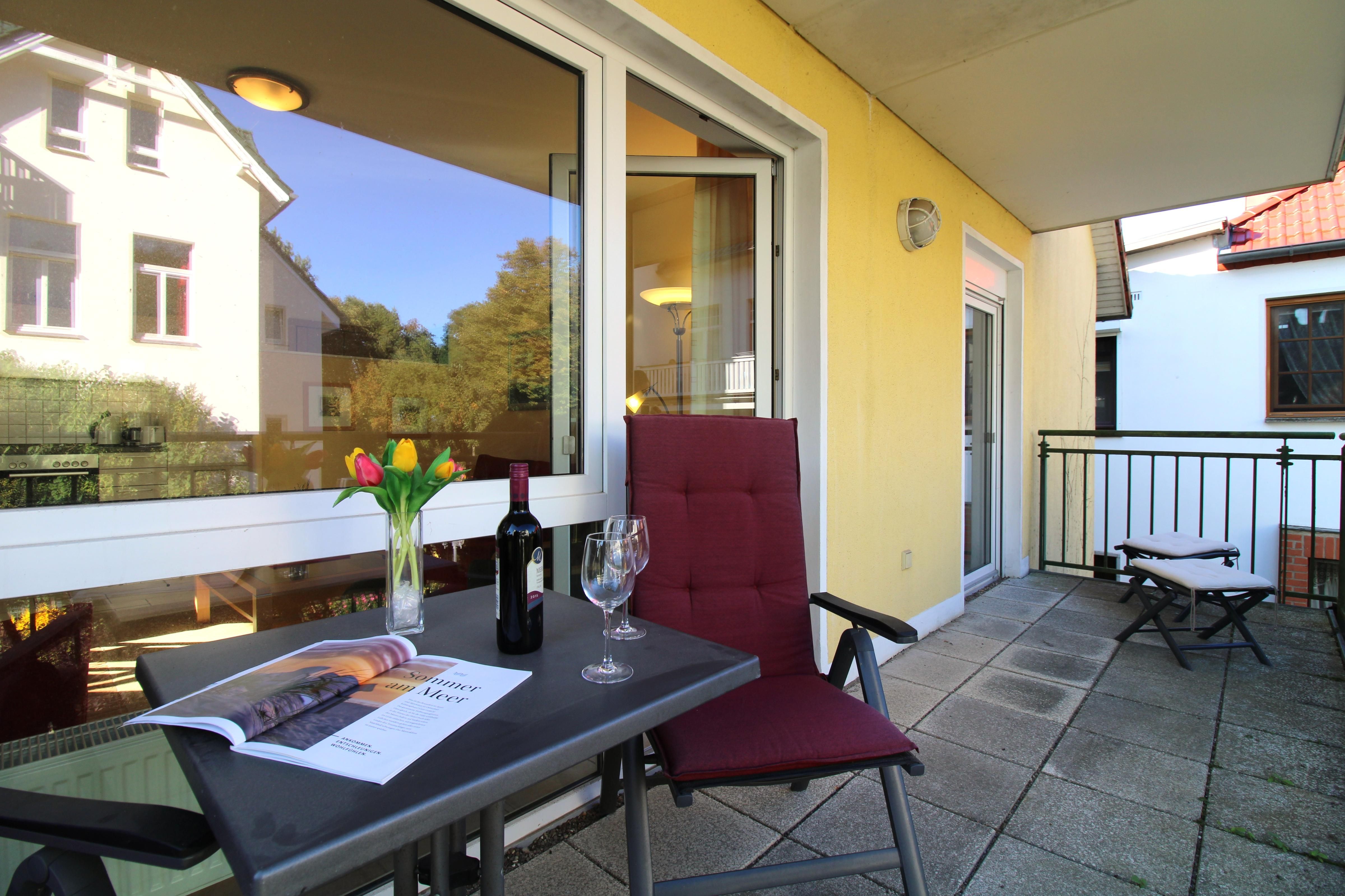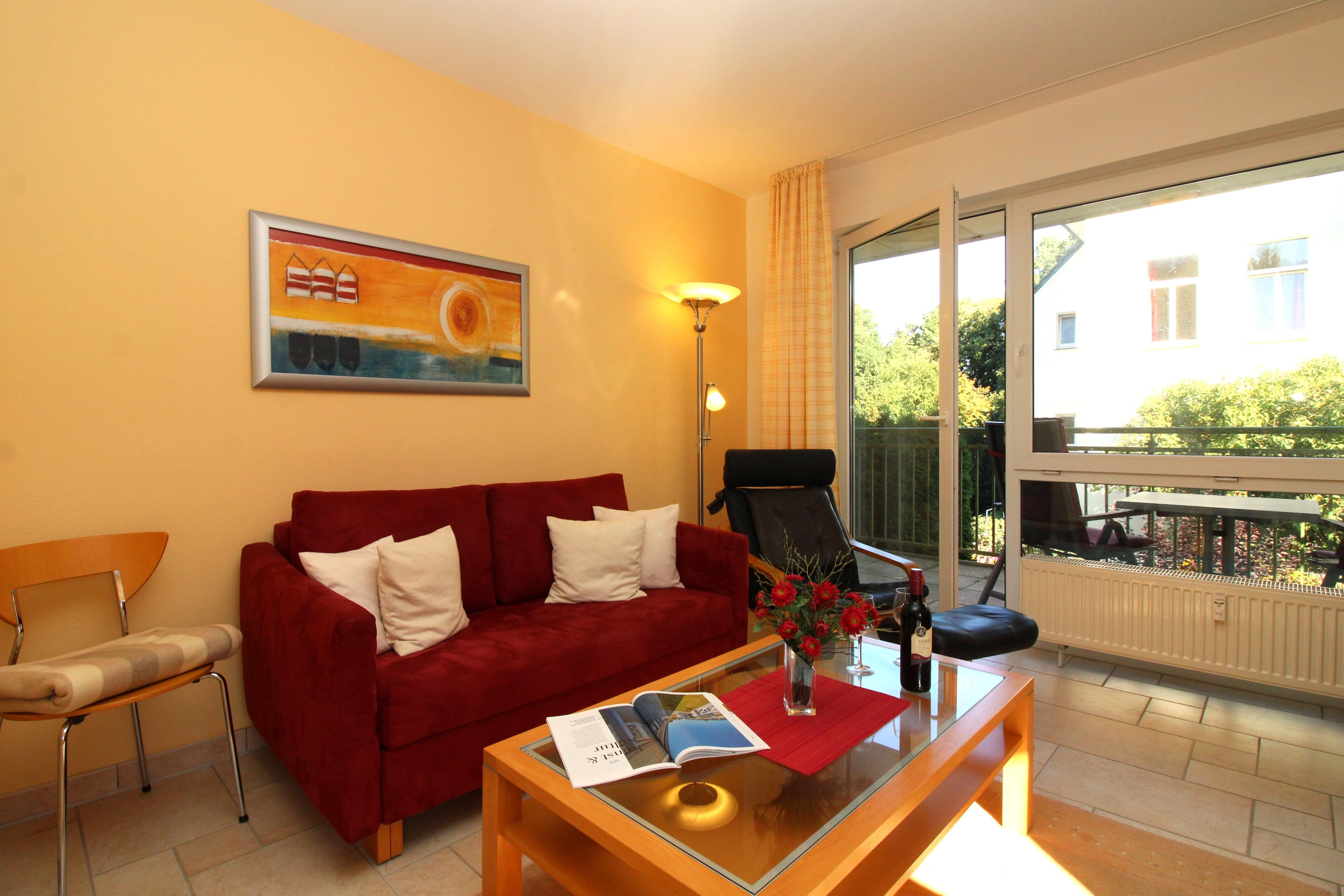 Das freundliche und lichtdurchflutete Wohn-/Esszimmer verfügt über eine separate Sitzgruppe mit bequemer Couch, 2 Sesseln und Couchtisch, einen separaten Esstisch mit 4 Stühlen sowie eine Wohnwand mit verschiedenen Schränken und Regalen. Vom Wohnzimmer aus haben Sie direkten Zugang zu dem ca. 10 m² großen und teilweise überdachten Balkon mit Balkonmöbeln. Hier sitzen Sie entspannt und gemütlich im Grünen und können abends bei einem guten Glas Wein in Ruhe die lauen Sommernächte genießen! Saisonabhängig haben Sie von hier durch den (unbelaubten) kleinen Küstenwaldstreifen auch seitlichen Ostseeblick.