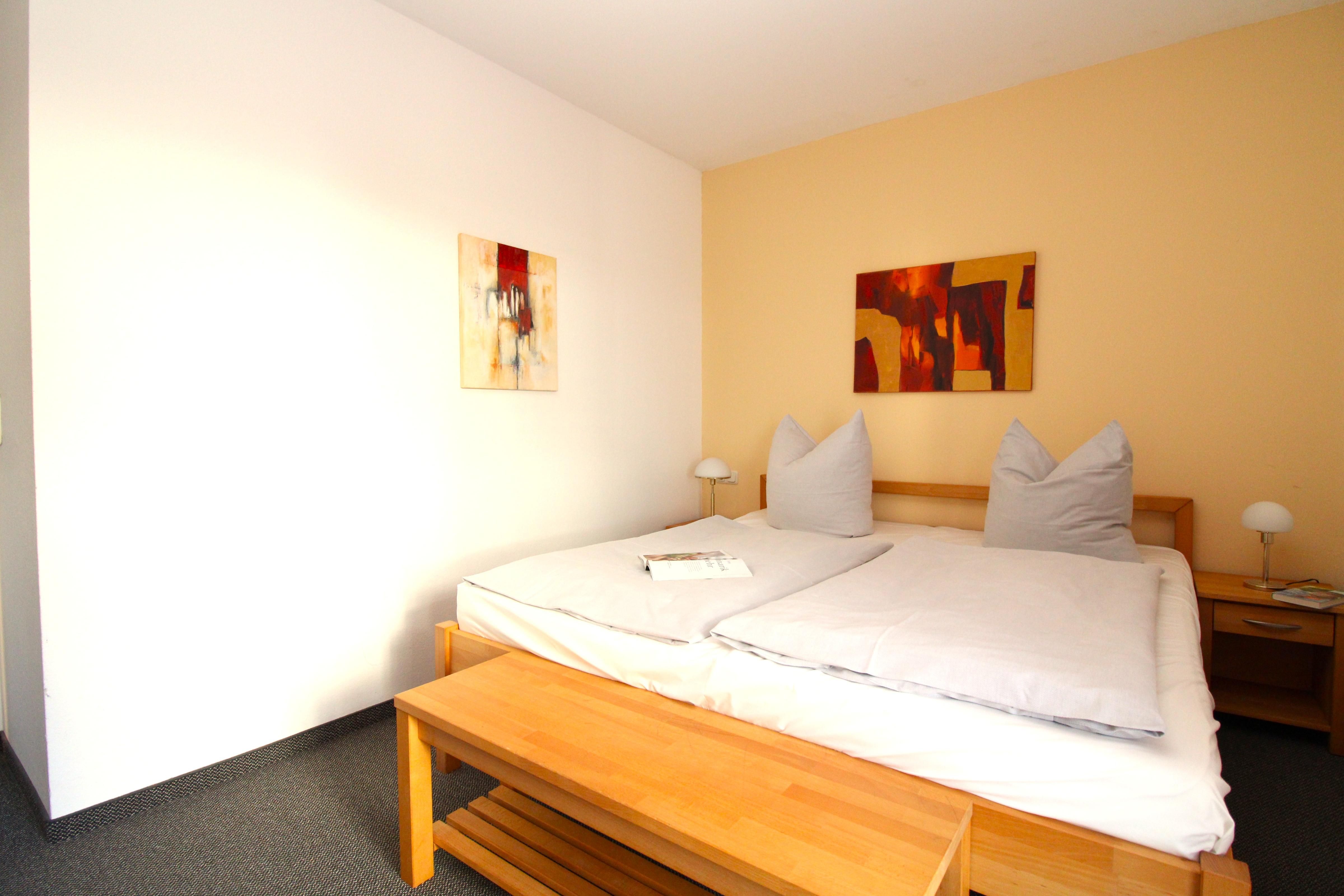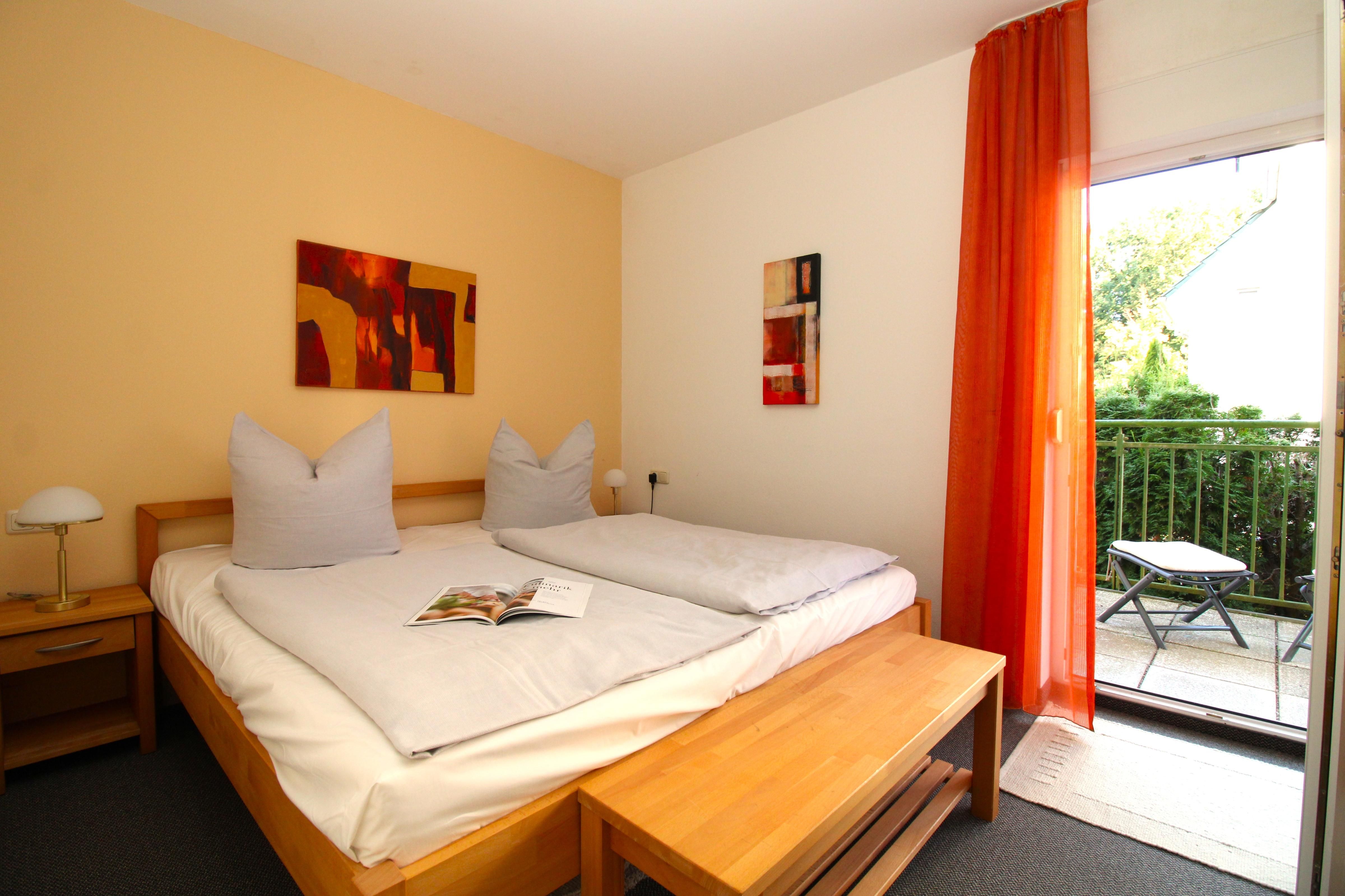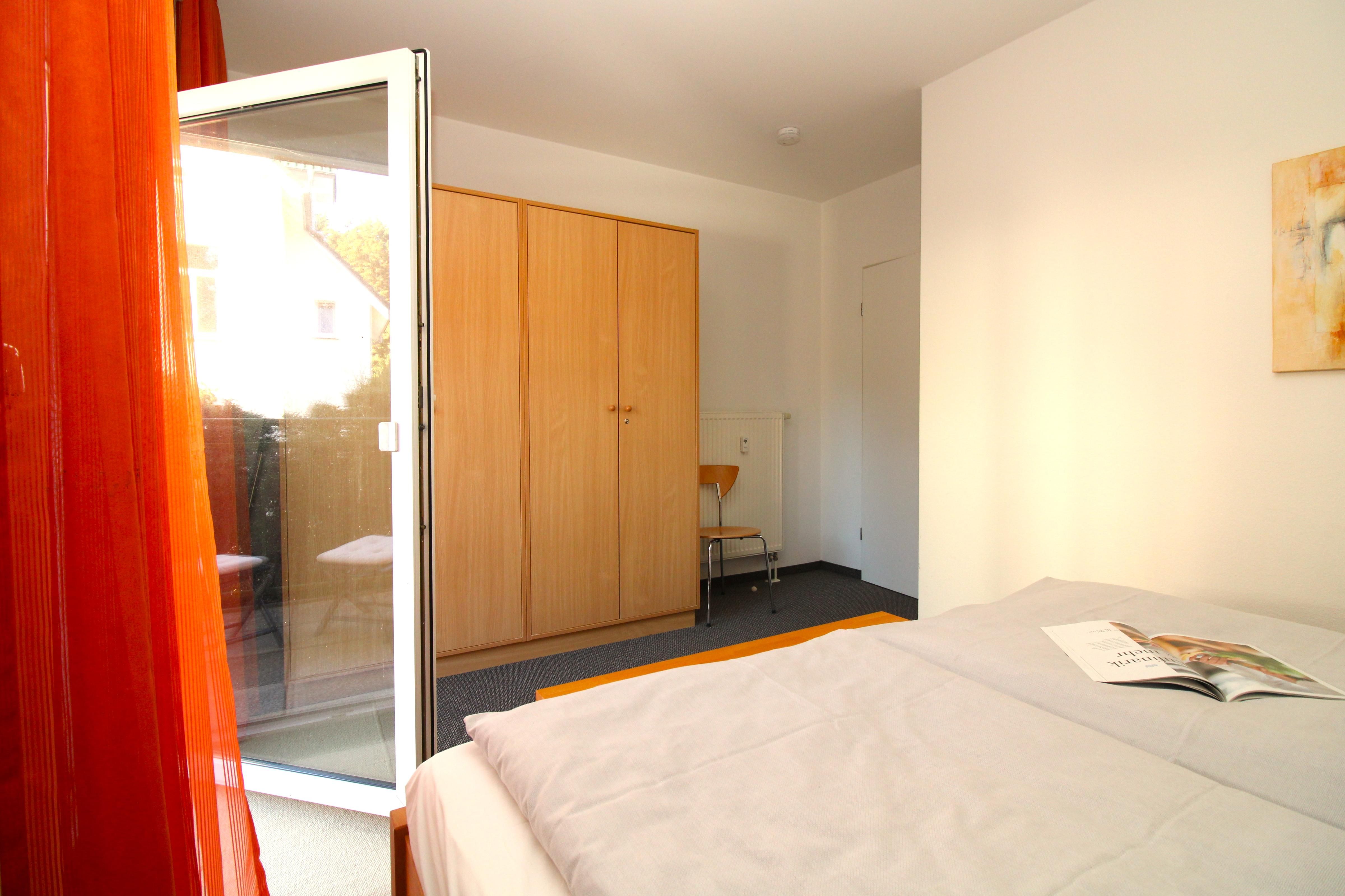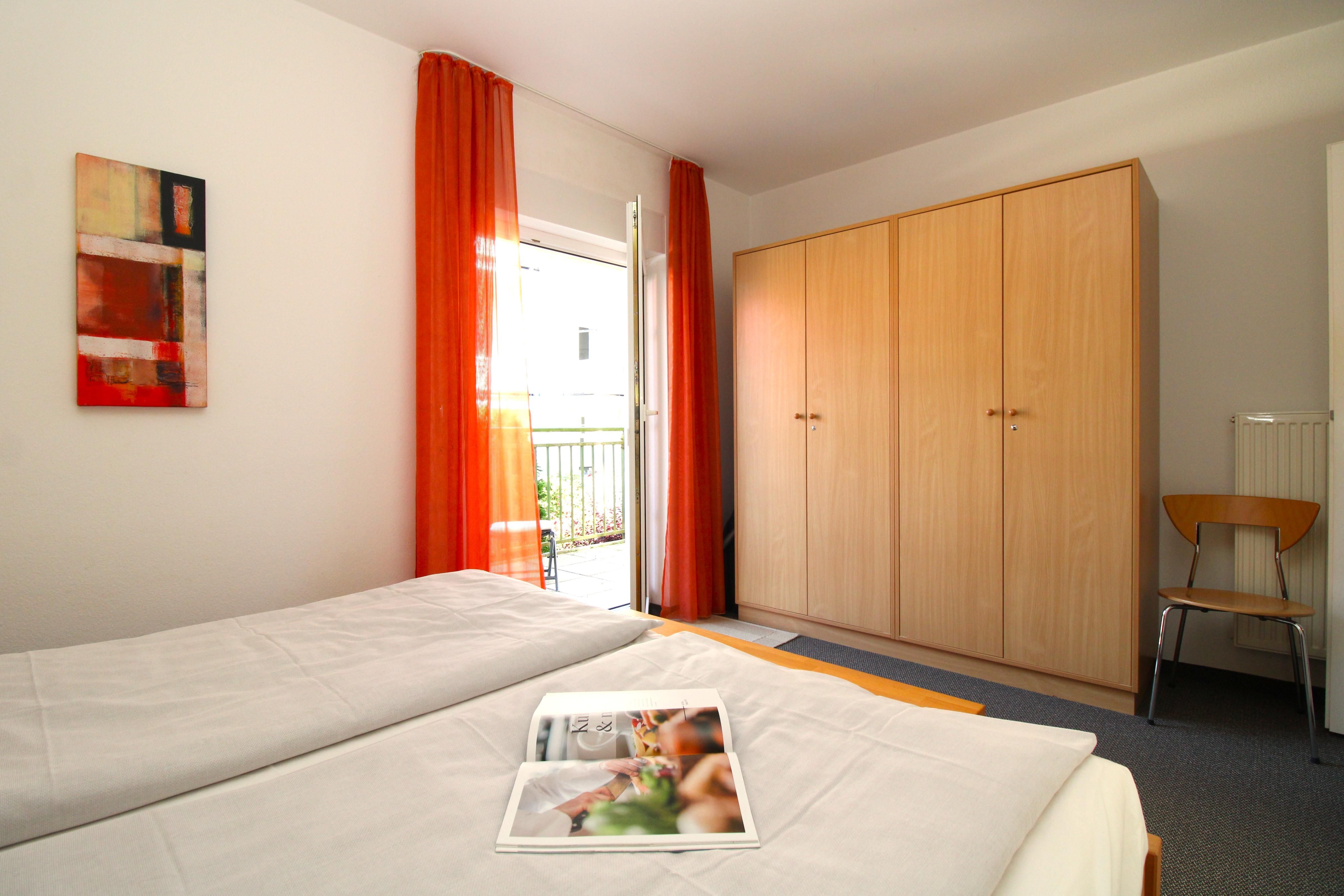 Das großzügige 1. Schlafzimmer ist mit einem bequemen Doppelbett (2 x 90 cm x 200 cm), Nachttischen mit Nachttischlampen, einem geräumigen Kleiderschrank, einer Sitzbank sowie einem Stuhl eingerichtet und bietet ebenfalls direkten Zugang zum Balkon.