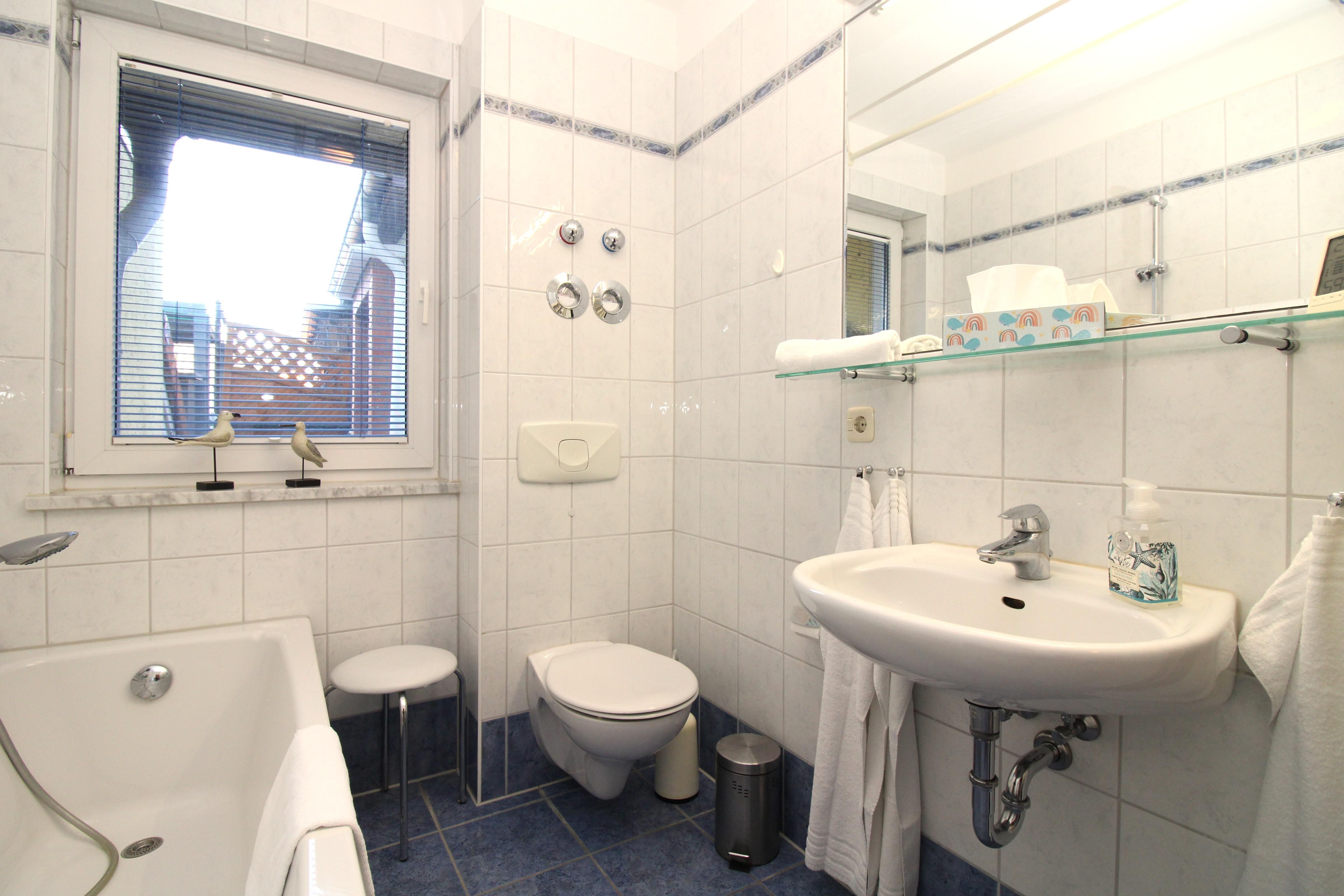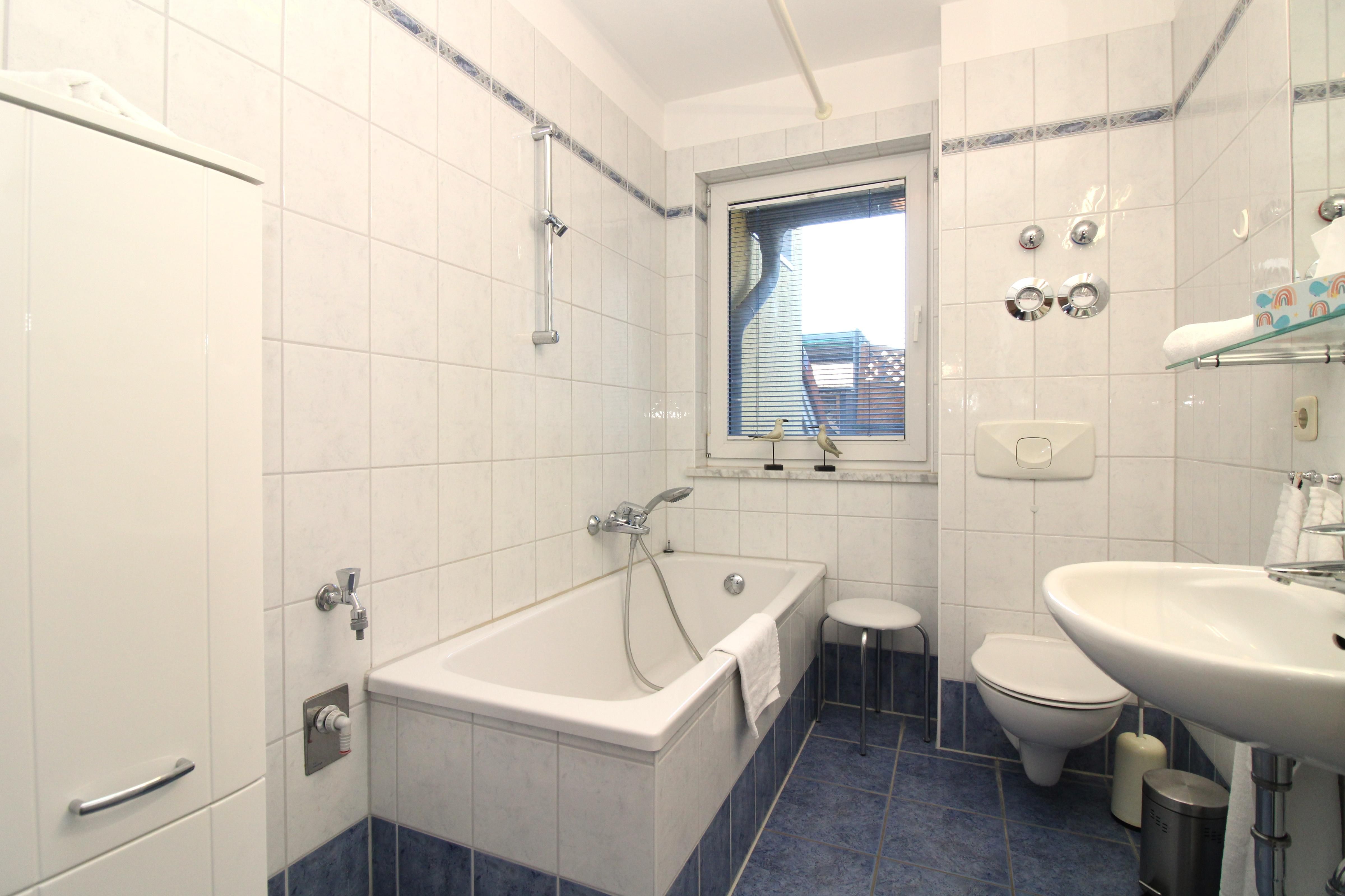 Das freundliche und geräumige Badezimmer (mit Tageslicht / Fenster) verfügt über eine Badewanne, Waschbecken und WC, einen Badezimmerschrank, Föhn, Hocker, Handtuch-Heizkörper sowie ausreichend Ablagemöglichkeiten.