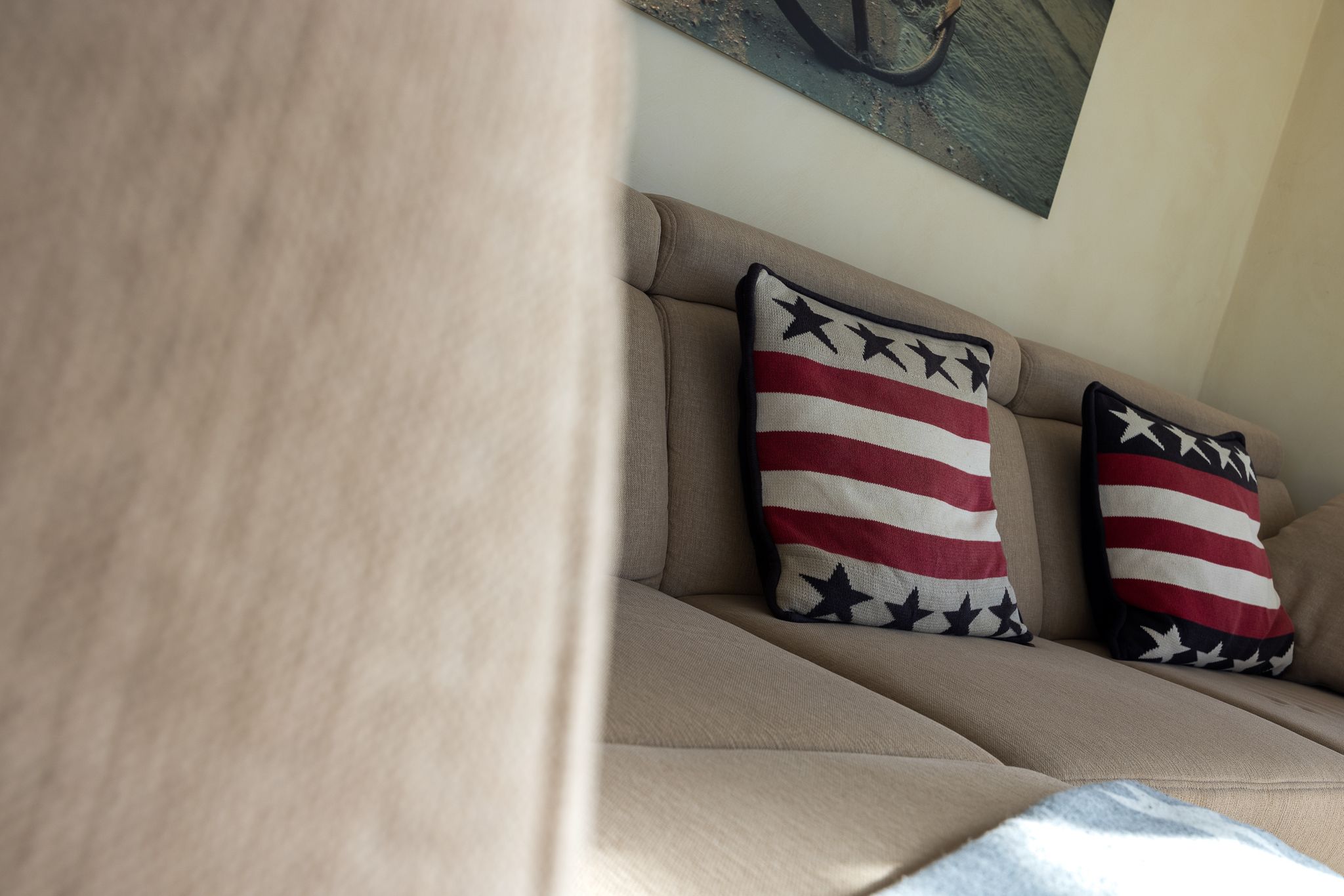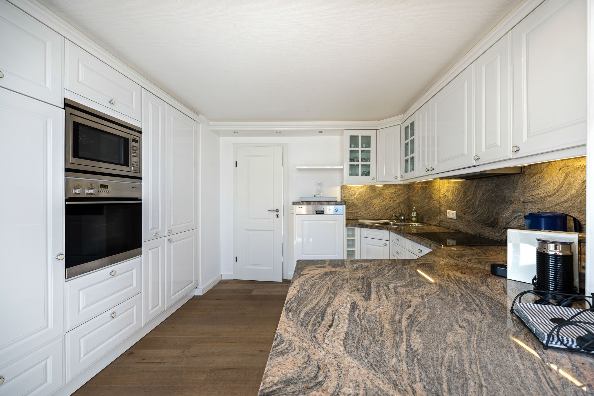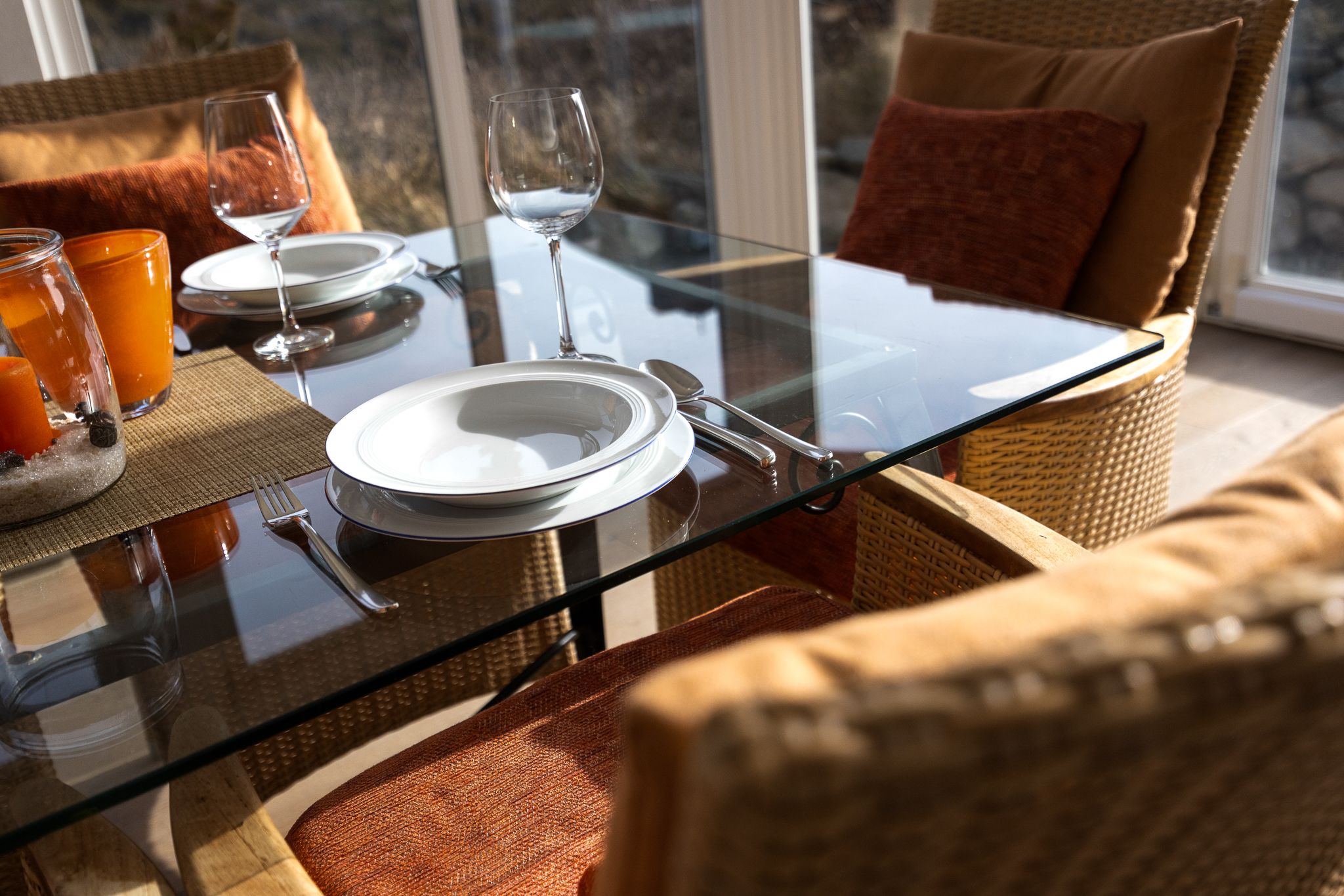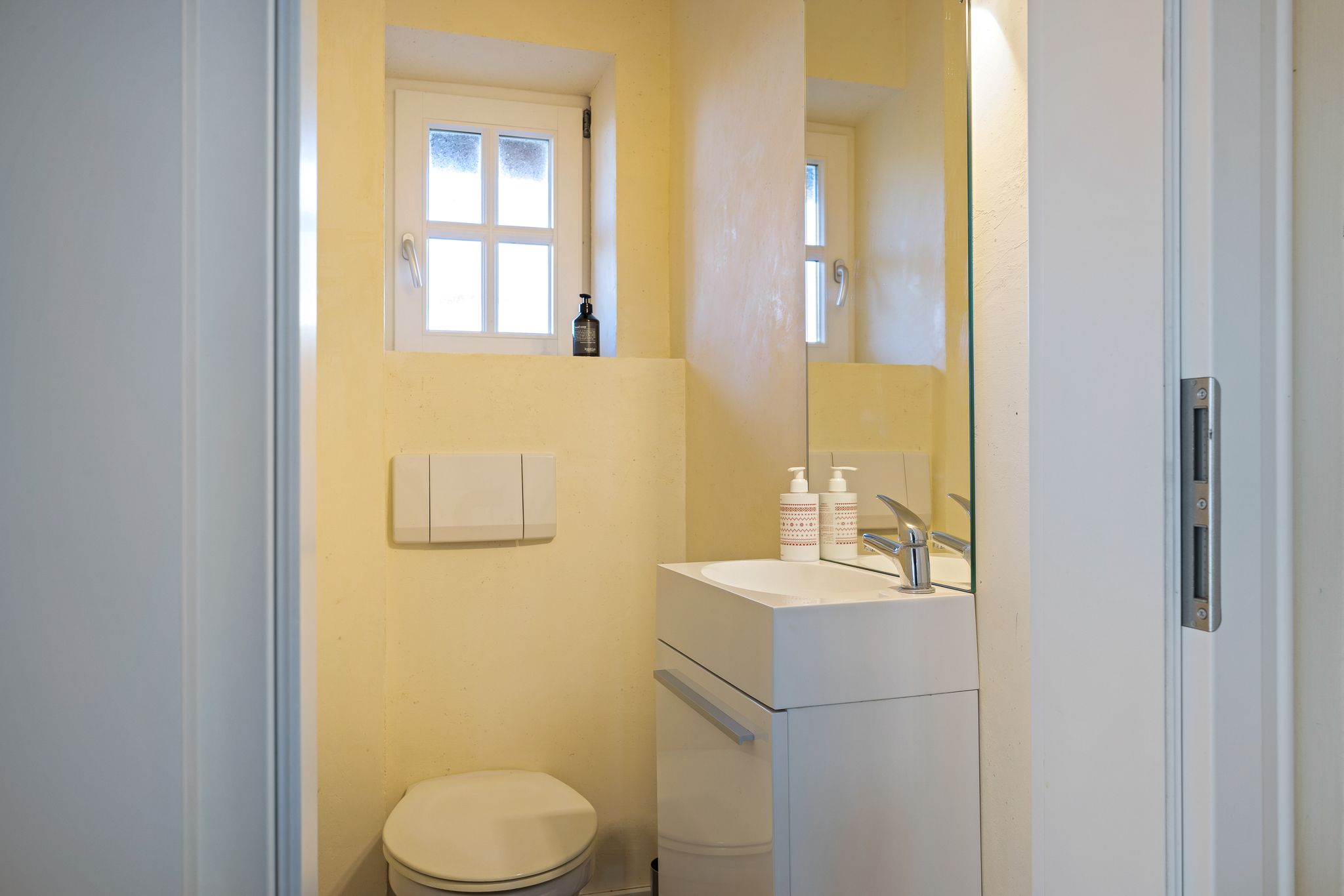 Im Erdgeschoss erwartet Sie ein großes, lichtdurchflutetes Wohnzimmer, das mit zwei zusätzlichen Sesseln zum Verweilen und Entspannen einlädt. Die angrenzende, voll ausgestattete Küche verfügt über einen großzügigen Essbereich für bis zu 6 Personen – ideal für gesellige Abende mit Familie und Freunden. Ein Gäste-WC im Erdgeschoss rundet das Raumangebot ab.