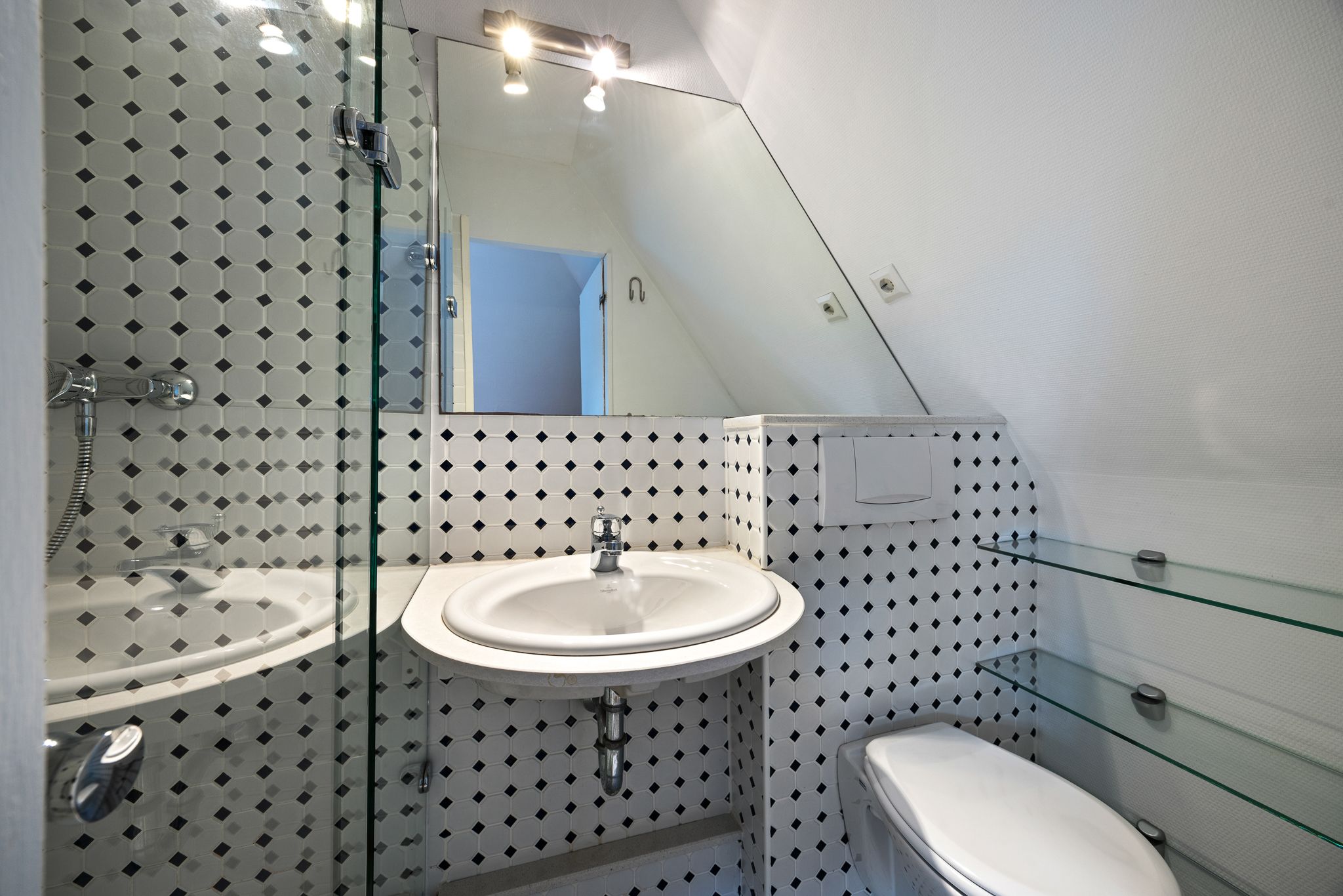 Im Obergeschoss befinden sich das Hauptbadezimmer, das mit einer modernen Dusche und einer Badewanne ausgestattet ist – perfekt für entspannende Stunden. Das Schlafzimmer, nach Westen ausgerichtet, bietet einen fantastischen Meerblick und sorgt für erholsame Nächte. Ein weiteres Schlafzimmer mit eigenem, kleinen En-Suite-Bad, das mit einer Dusche ausgestattet ist, bietet zusätzlich Privatsphäre und Komfort.