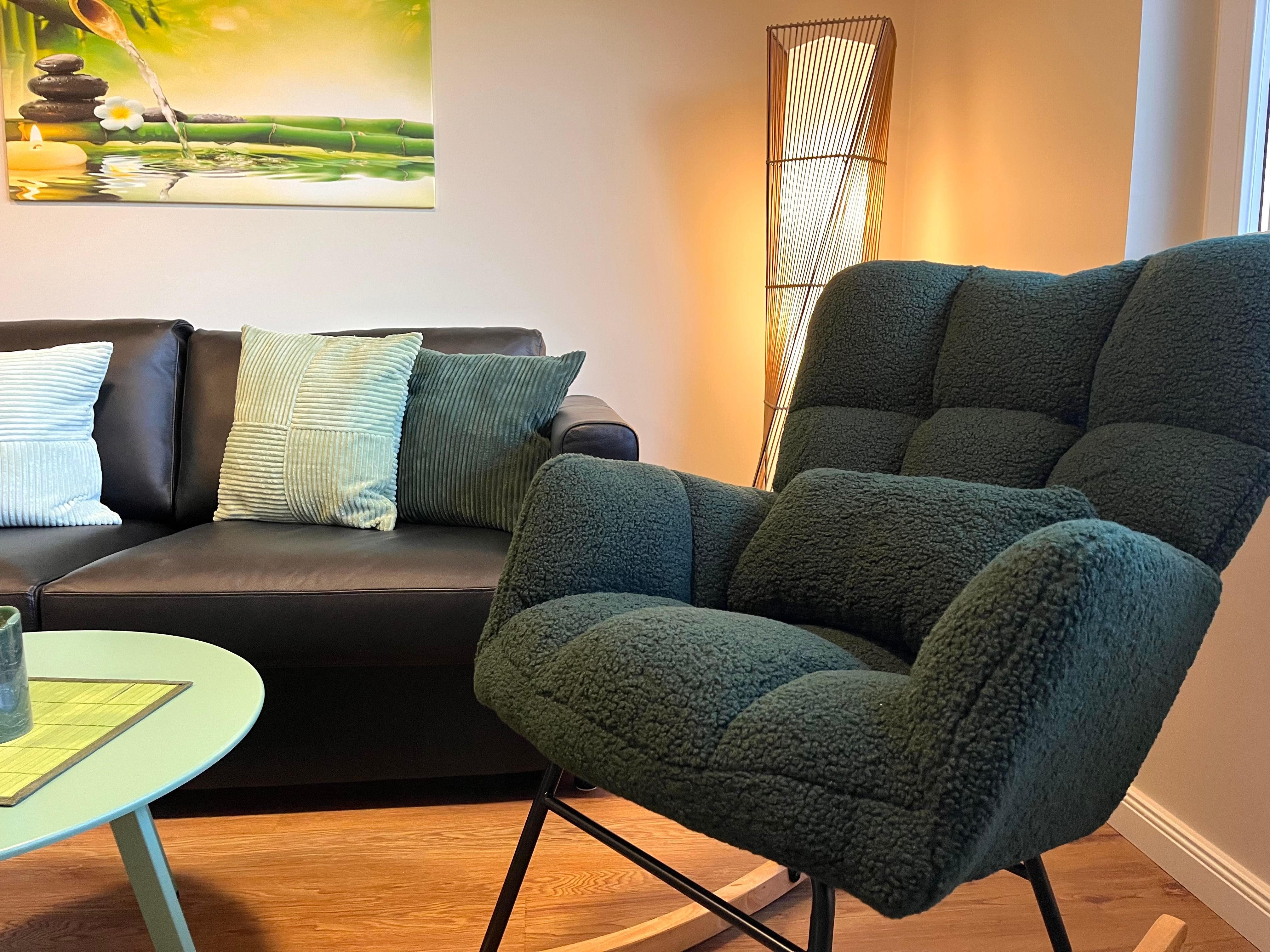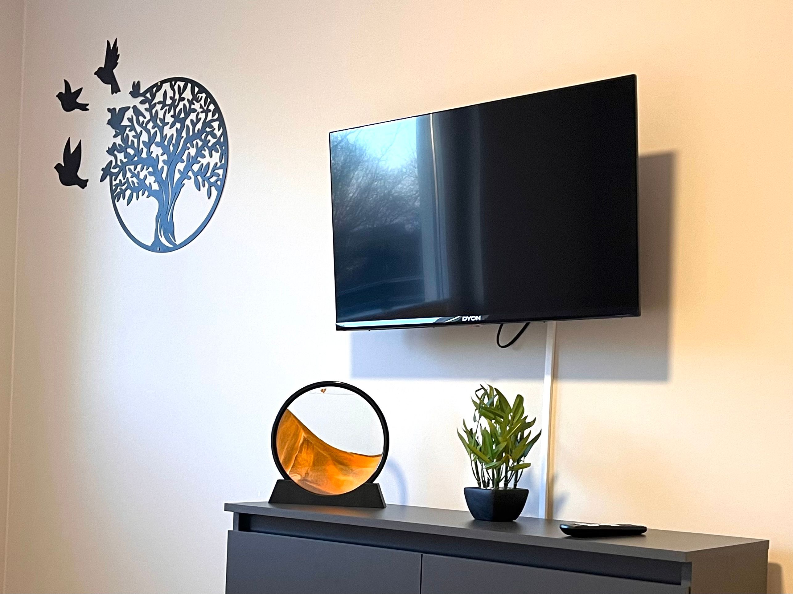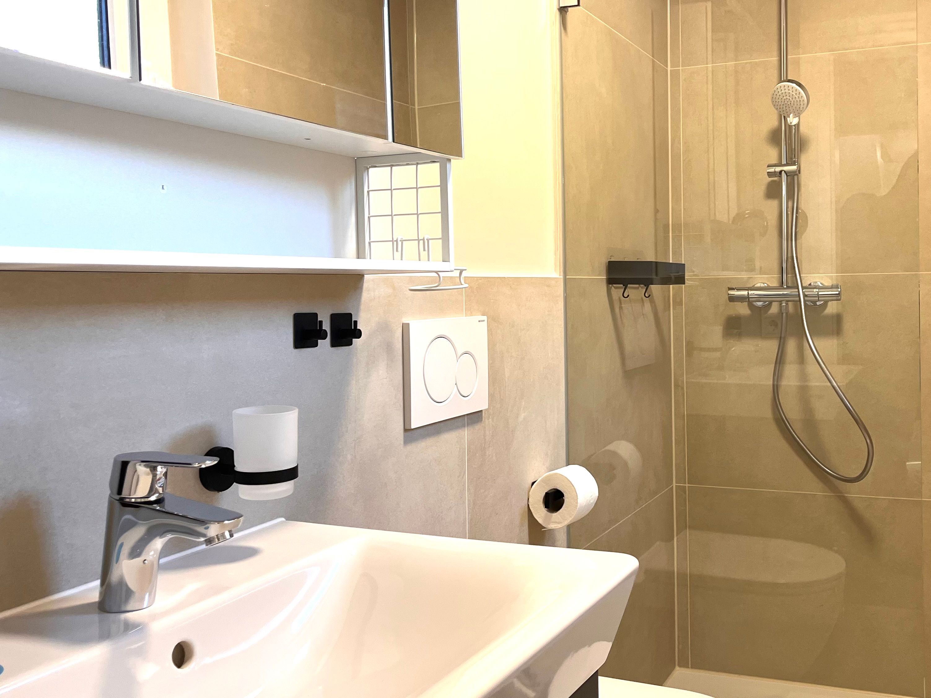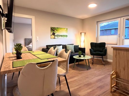 Das Appartement präsentiert sich modern und hochwertig ausgestattet. Die offene Küche geht nahtlos in das helle Wohnzimmer über und ist mit sämtlichen wichtigen Küchenutensilien ausgestattet. Dazu zählen ein Herd mit zwei Platten, Mikrowelle, Kühlschrank mit Gefrierfach, Kaffeemaschine, Wasserkocher, Toaster sowie Geschirr und Besteck. Für den Komfort auch im Alltag stehen ein Esstisch, ein gemütliches Sofa und eine Kommode zur Verfügung. Im Badezimmer erwartet Sie eine mit Wanne ausgestattete Dusche, ergänzt durch Waschbecken, Spiegel und einen Haartrockner.