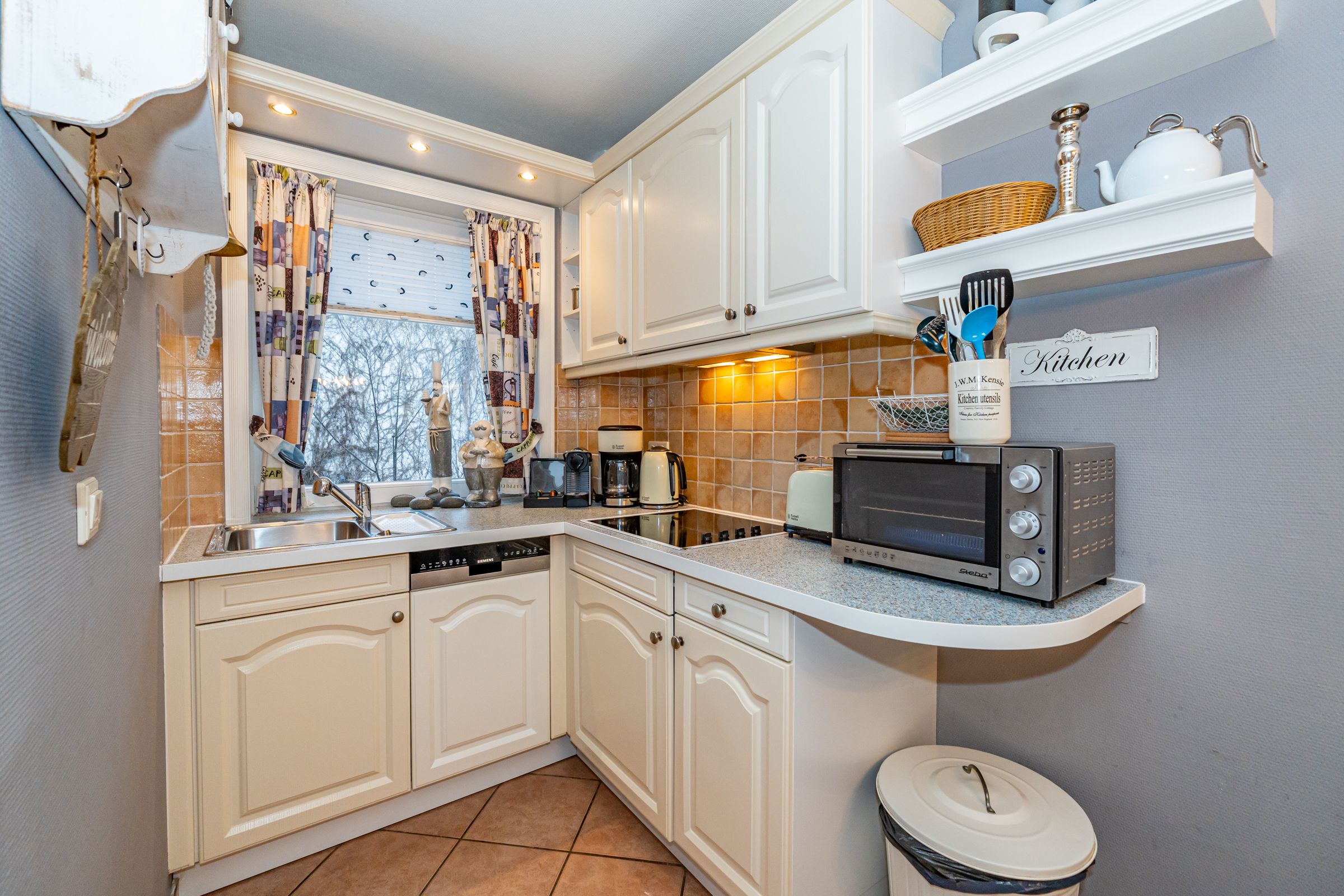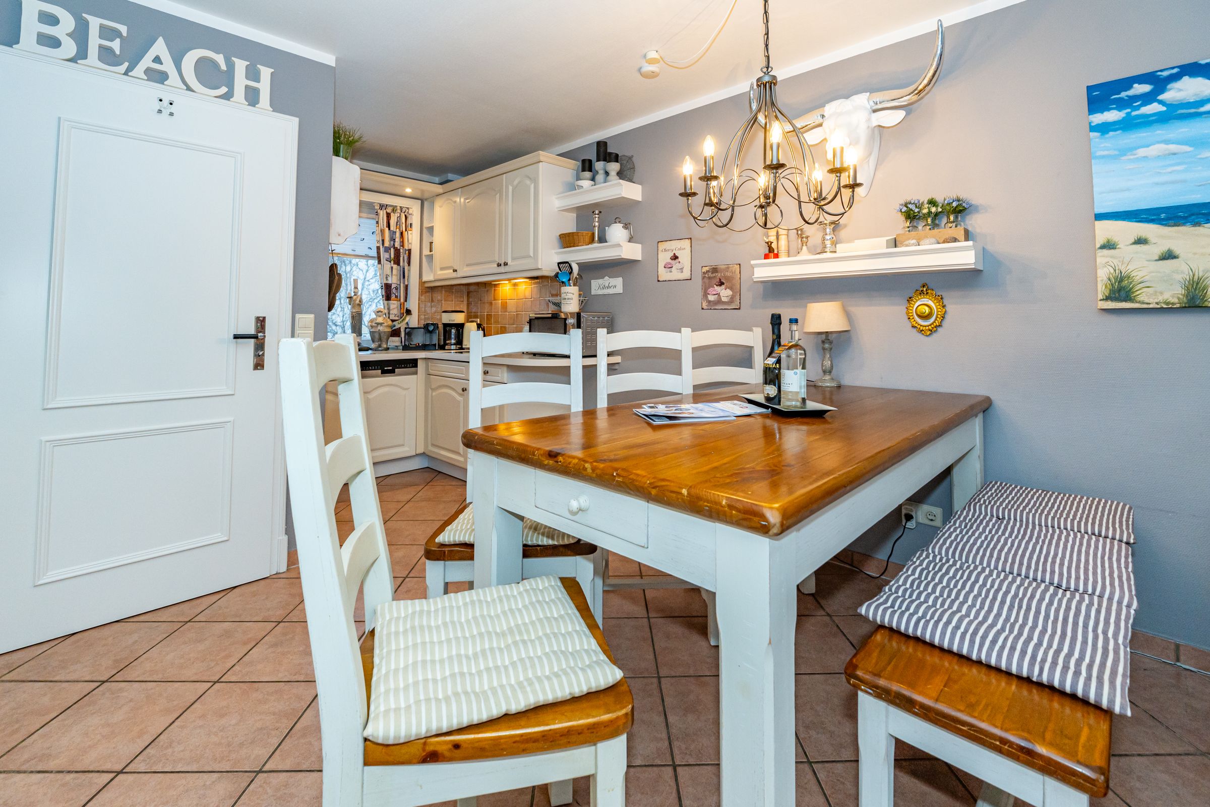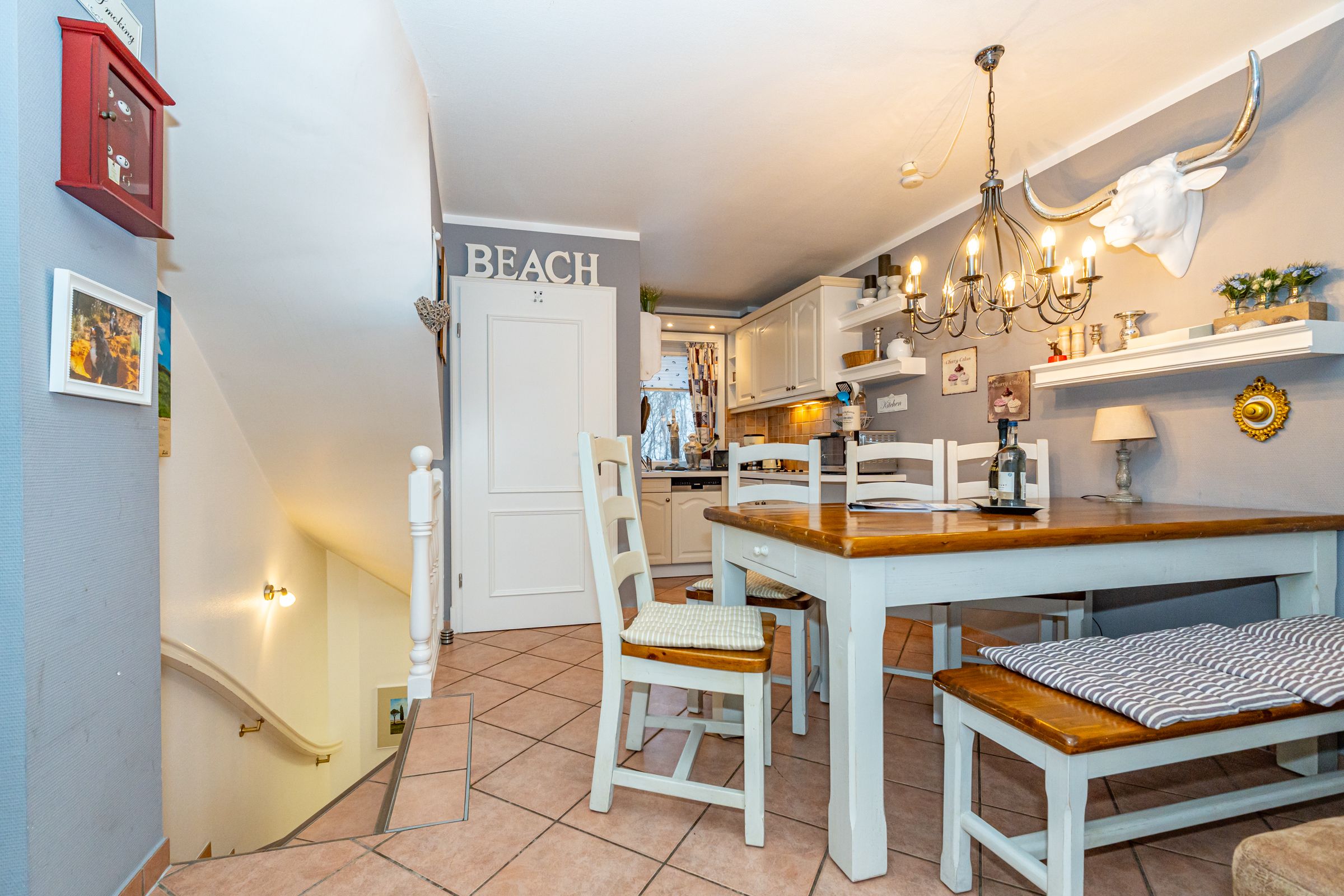 Der gesamte Fußboden des Ferienhauses ist gefliest bzw. mit hochwertigem PVC ausgelegt. Im Erdgeschoss befinden sich der Wohn/ Essbereich mit neuer Couch, und eine offene Küche mit Nespressomaschine, Minibackofen und Spülmaschine. Hier hat man den Zugang zur Südterrasse mit eingezäuntem Gartenanteil.