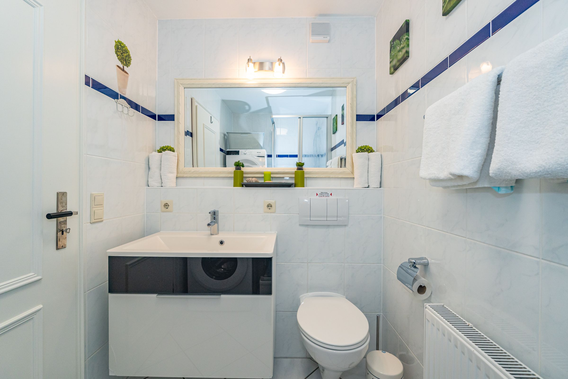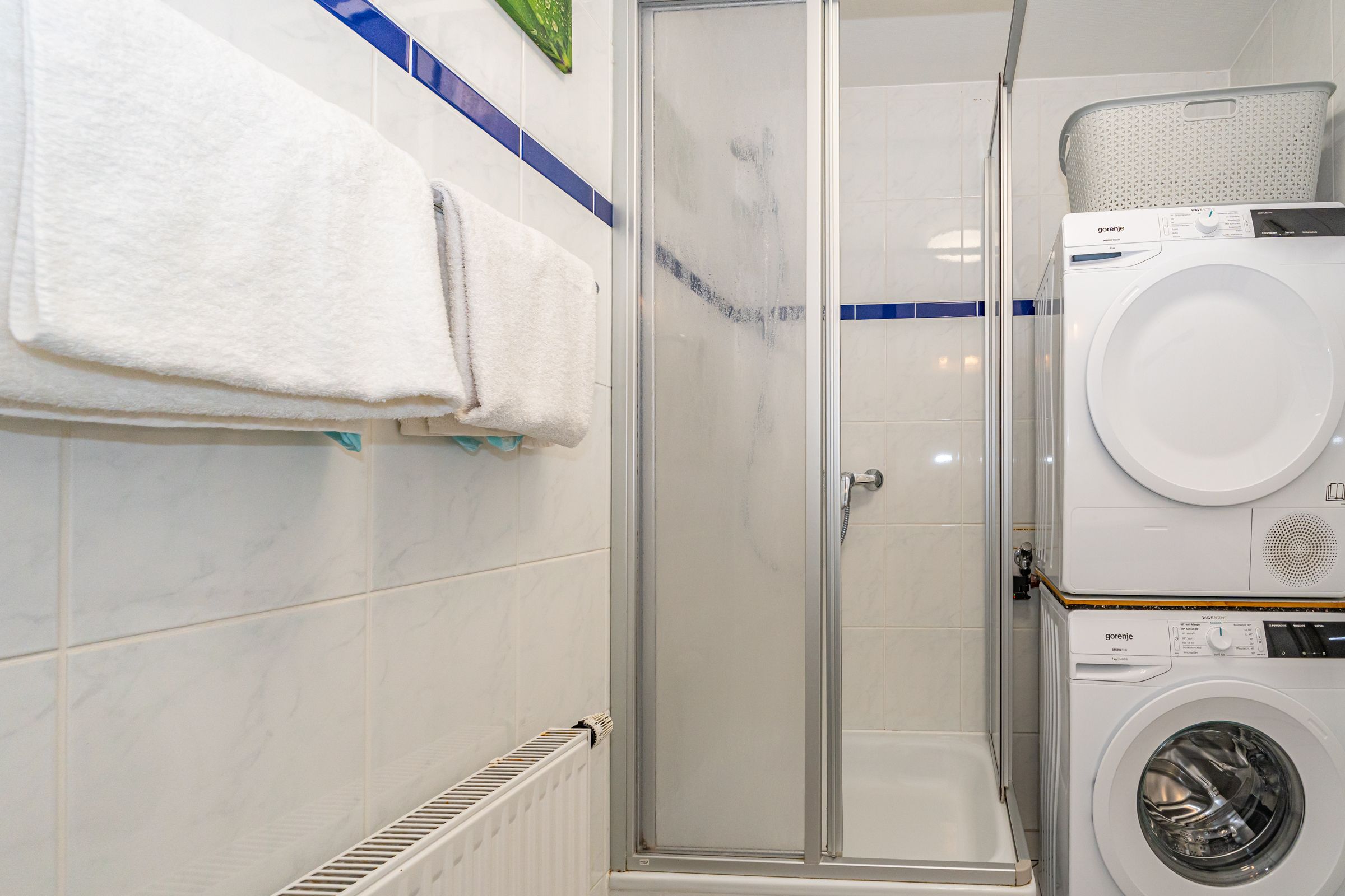 Der Garten verfügt über einen großen Grill, einer gemütlichen Sitzecke und 2 Sonnenliegen. Im Untergeschoss finden Sie ein Schlafzimmer mit Doppelbett und weißen Schränken. Im angrenzenden Duschbad sind Waschmaschine und Trockner vorhanden - ebenso wie Bügelbrett und Bügeleisen.