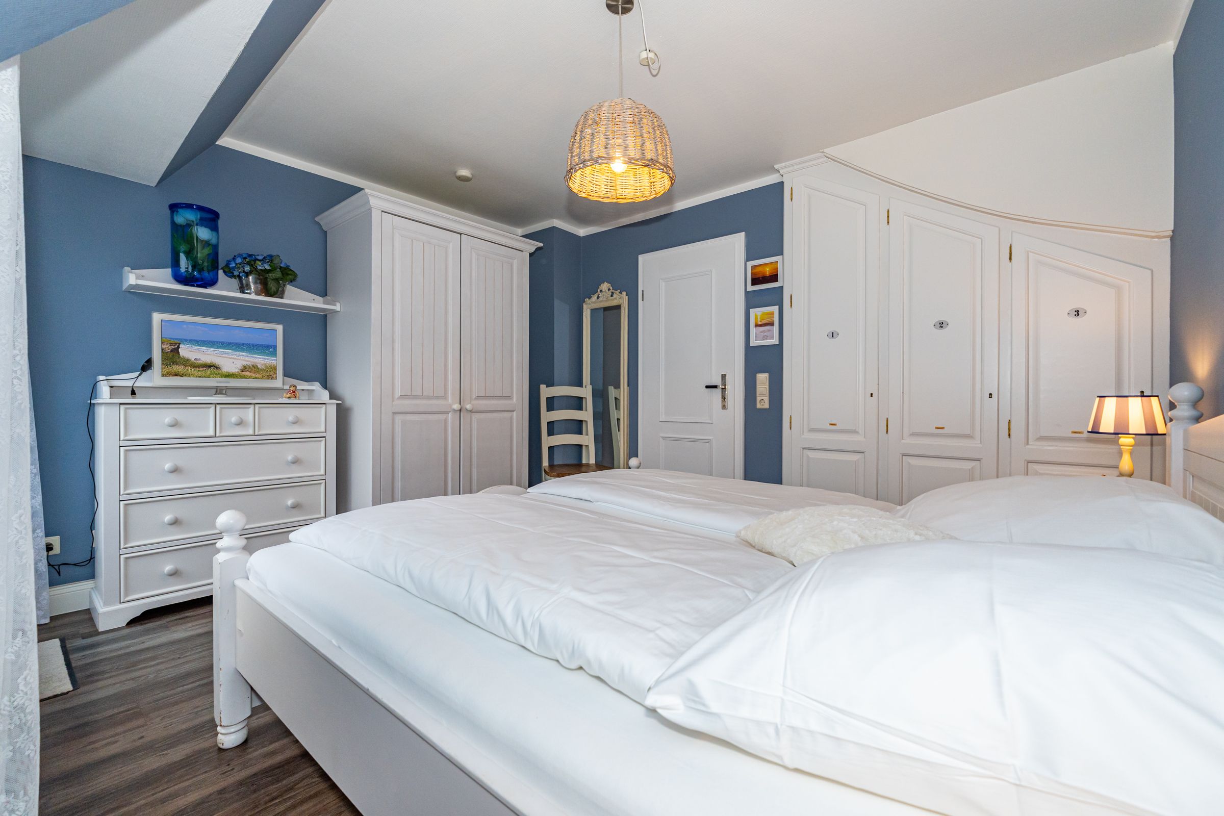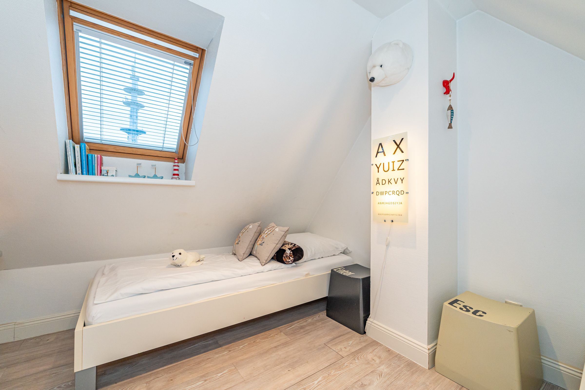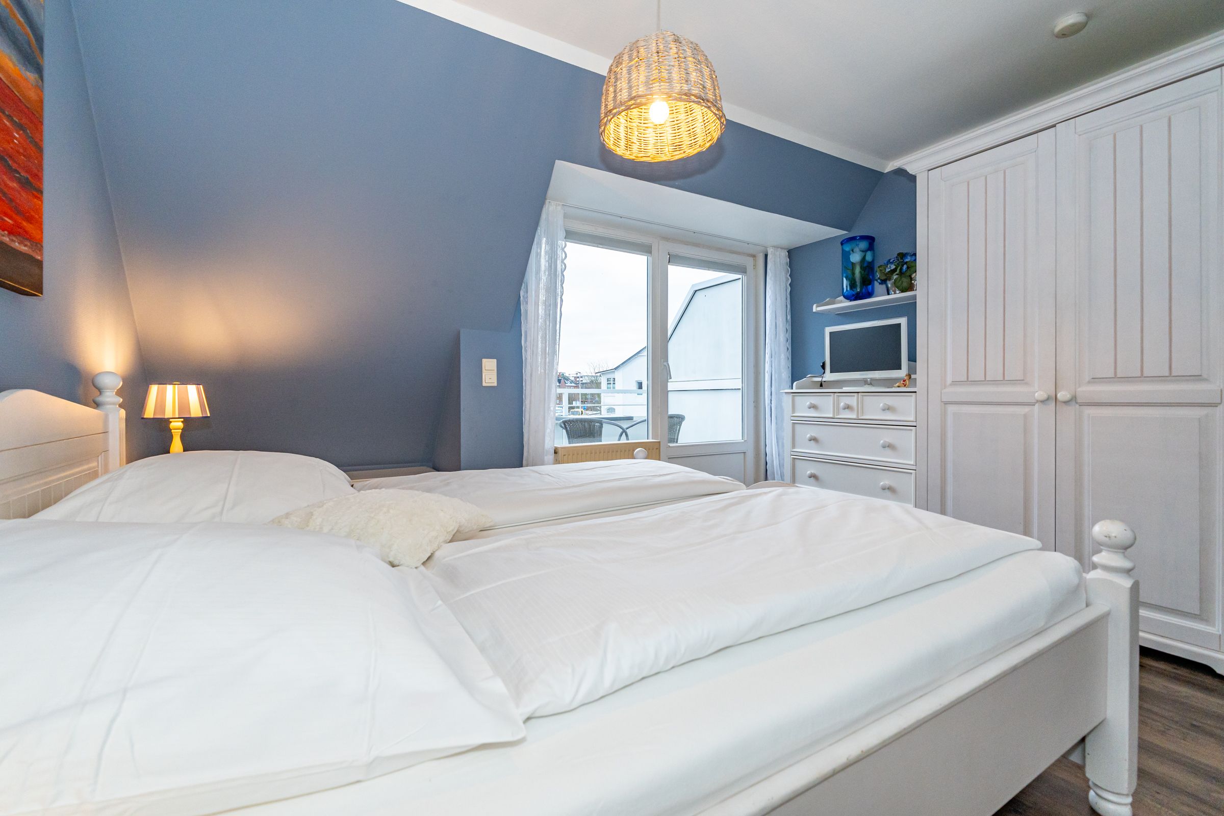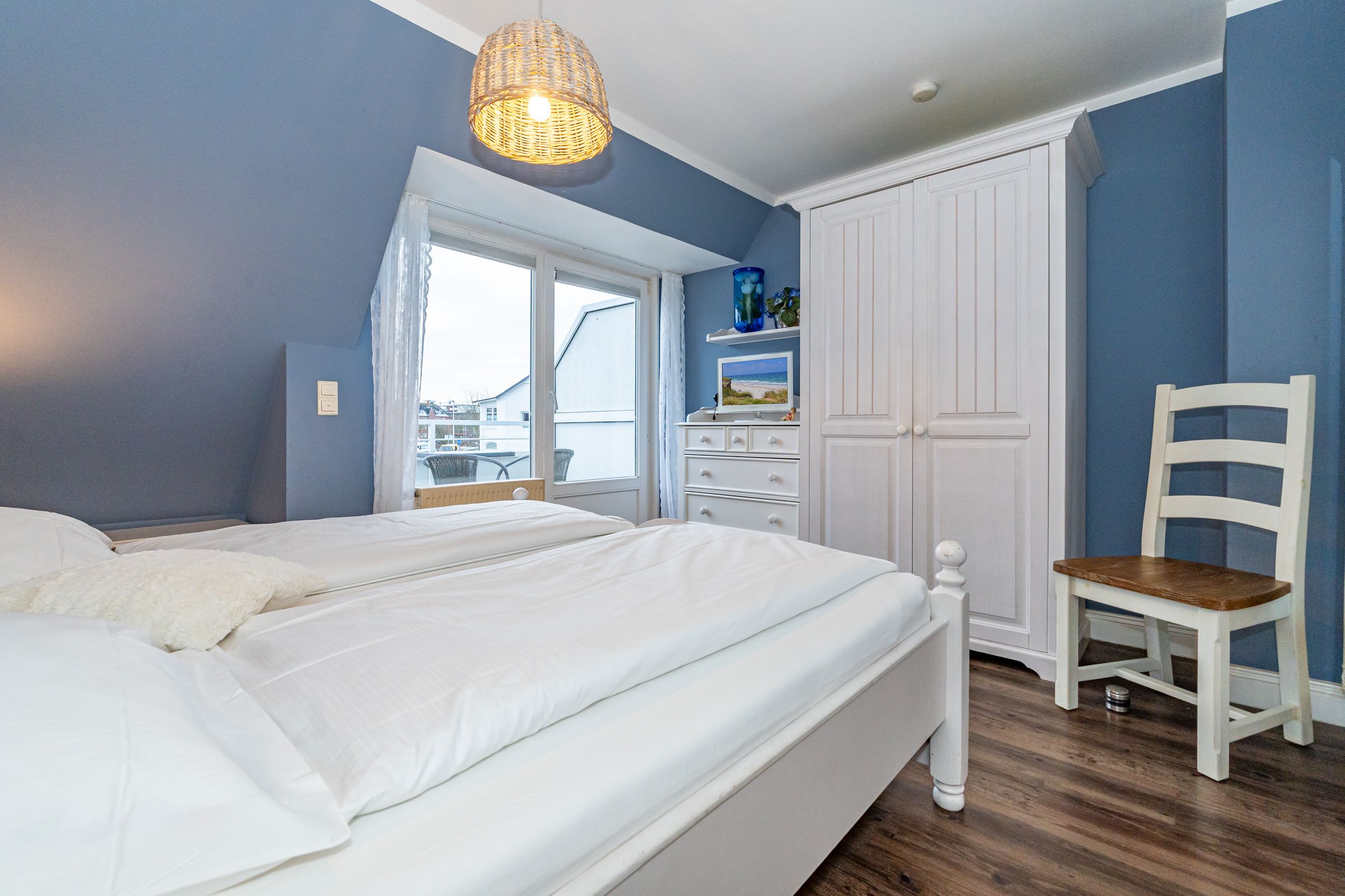 Das Schlafzimmer im Obergeschoss verfügt über ein weiteres Doppelbett und einen Südbalkon mit kleiner Sitzgelegenheit. Auf dieser Etage ist das zweite Bad mit Duschbadewanne. Das Dachgeschoss ist mit zwei Einzelbetten und einem kleinen CD-Player mit Radio ausgestattet. Dieser offene Raum kann ideal als Kinderzimmer genutzt werden.