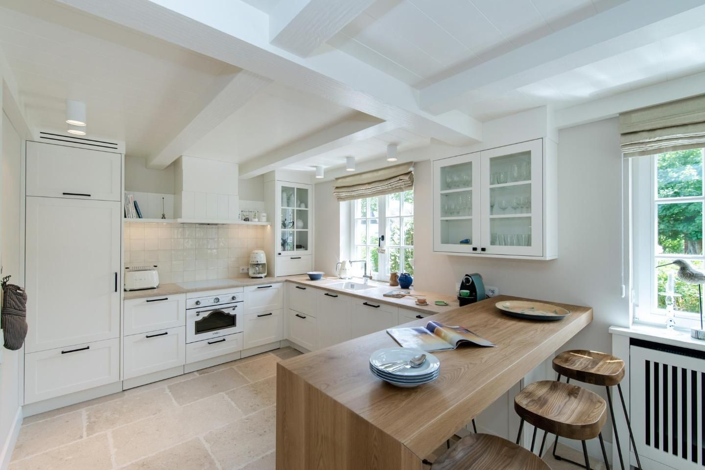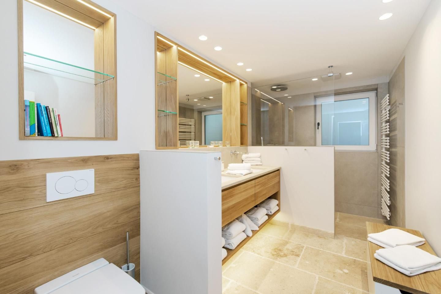 Oberflächen aus französischem Naturstein und Eichen-Schlossdielen, Fußbodenheizung, schöne Holzsprossen-Fenster, hochwertige Tischlereinbauten, Designer Möbel sowie harmonisch abgestimmte Farben und Stoffe erzeugen ein angenehmes und stimmiges Wohngefühl. Die Beleuchtungskreise sind separat schalt- und dimmbar und sorgen damit für die perfekte individuelle Belichtung und eine gemütliche Atmosphäre.