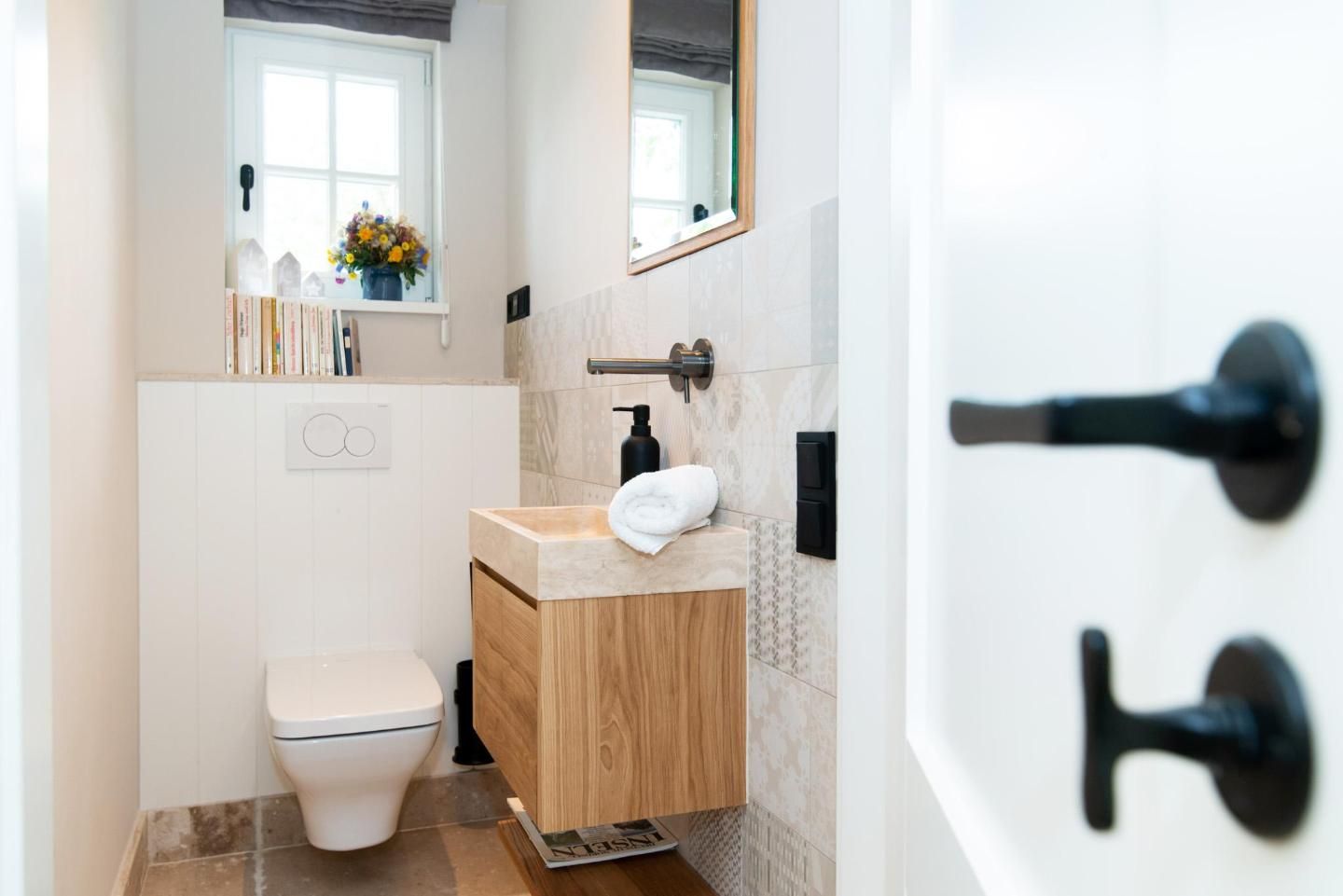 • Durch die großen Holzsprossen-Fenster der beiden Zimmer kommt viel Licht und Sonnenschein in das Souterrain und man blickt auf einen schönen Friesenwall