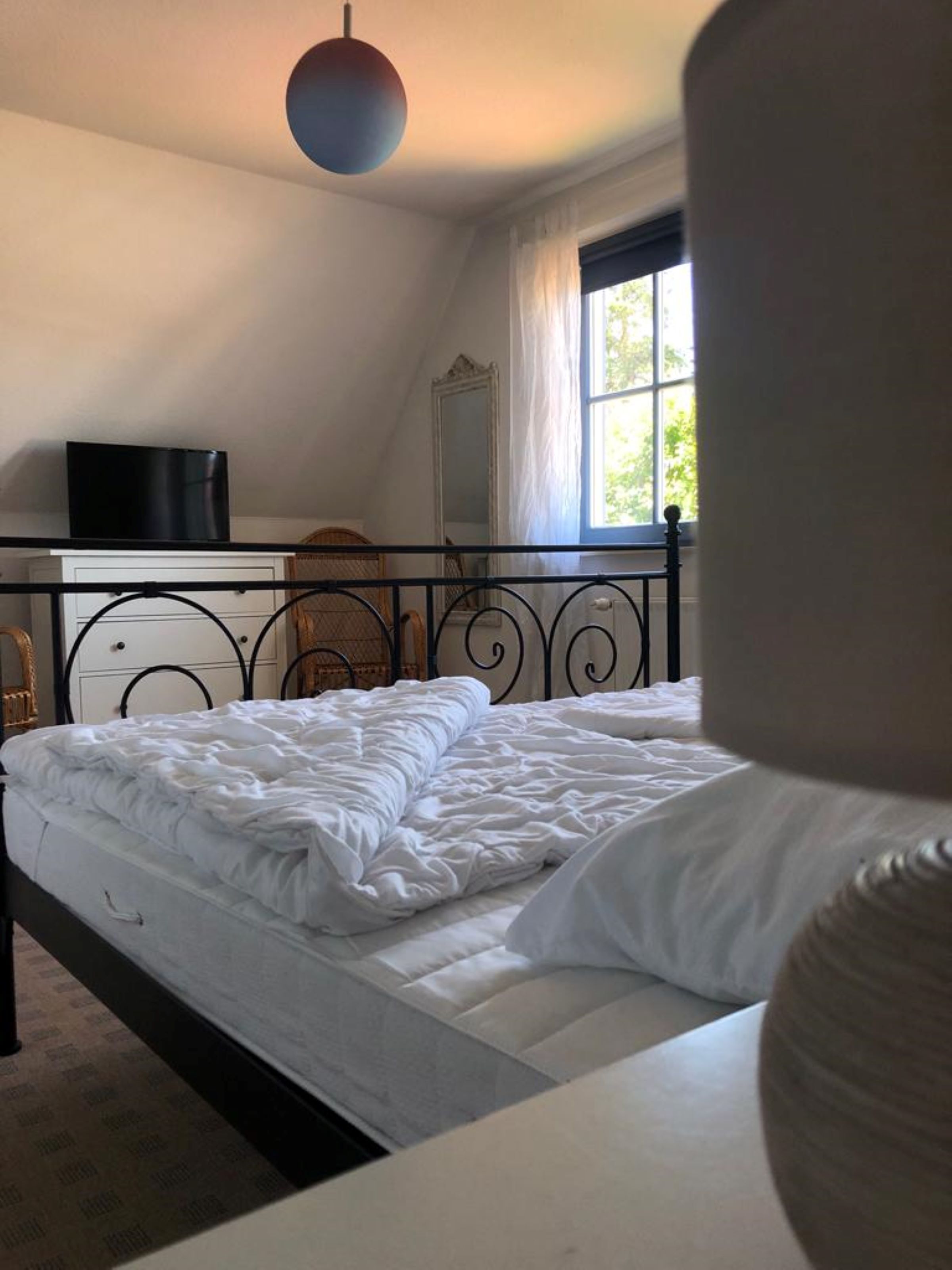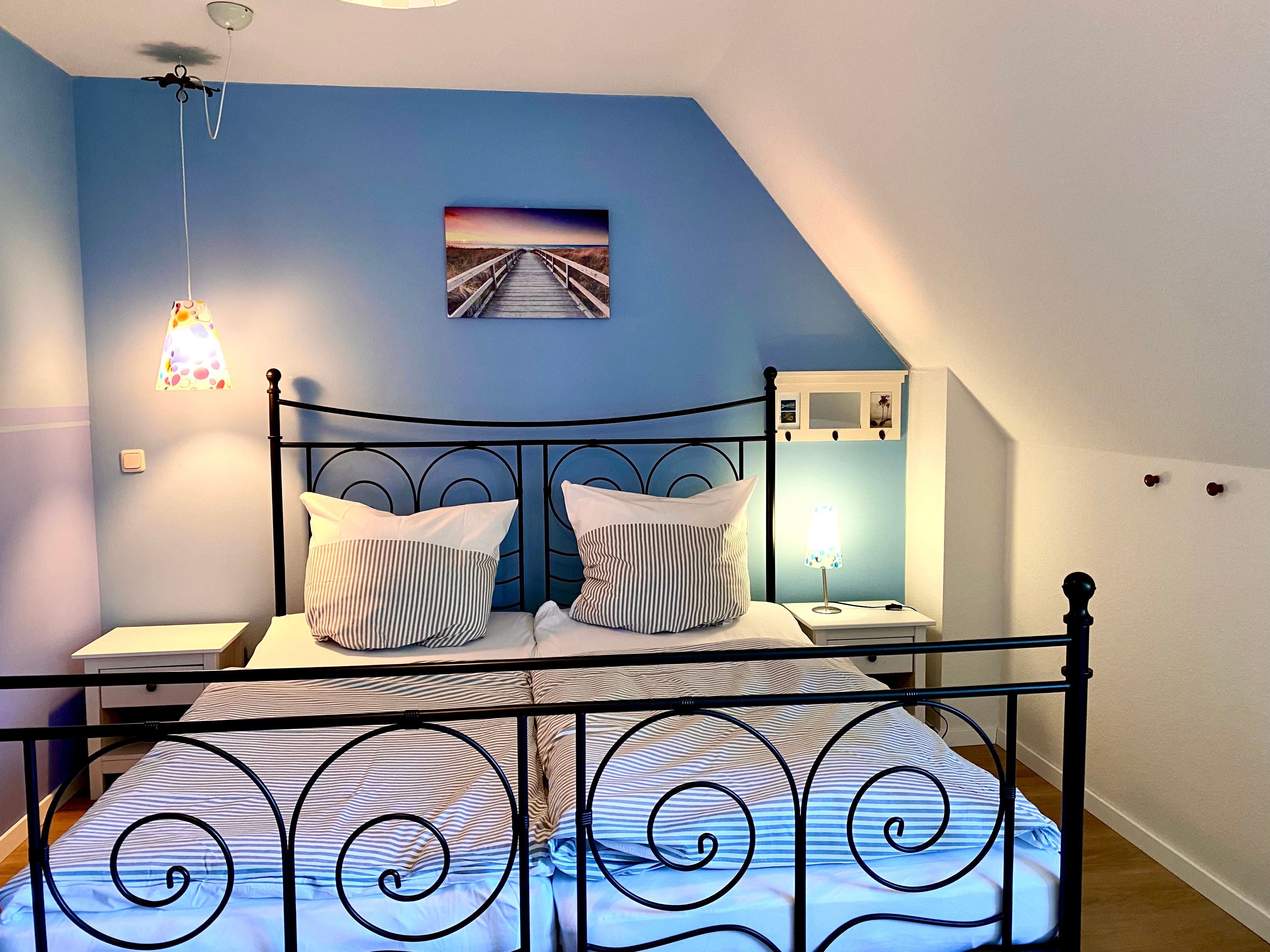 Die 110 qm große Doppelhaushälfte kann mit bis zu 6 Erwachsene oder 4 Erwachsenen und 3 Kindern + 1 Kleinkind angemietet werden. Die Wohnfläche verteilt sich auf drei Etagen. Im Erdgeschoss befindet sich der Wohnbereich mit Panoramakaminofen und integrierter Küche sowie die Essecke und der Zugang zur Terrasse mit Garten. Im unteren Bereich sind Waschmaschine/Trockner und ein Bad mit Dusche zu finden, in der 1. Etage sind zwei Schlafzimmer mit Doppelbett sowie ein Bad mit Wanne und Dusche untergebracht. Auf der offenen Galerie befinden sich Einzelbetten. In unmittelbarer Nähe des Ferienhauses (8 Minute zu Fuß entfernt) befindet sich das Wellness-Camp Düne 6 welches eine Schwimmhalle, Saunalandschaft und Fitnessbereich ausgestattet ist.