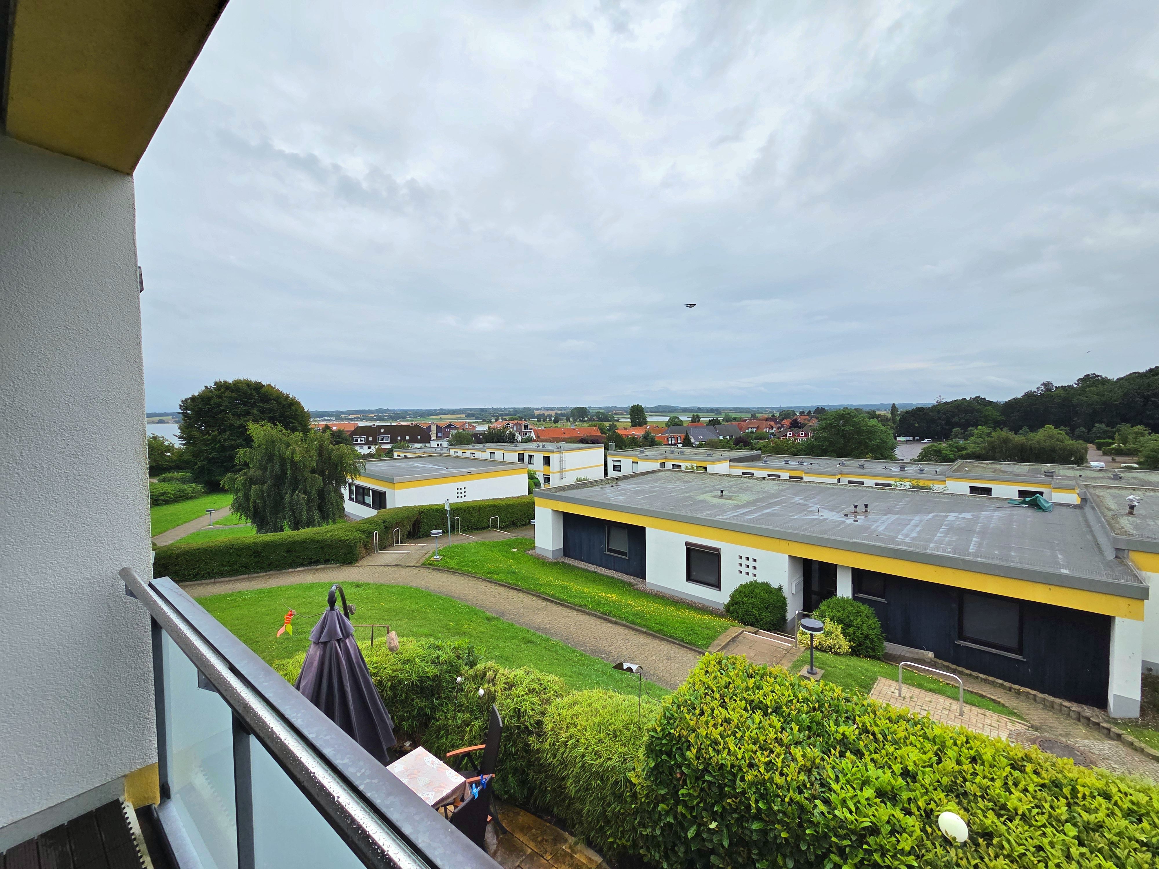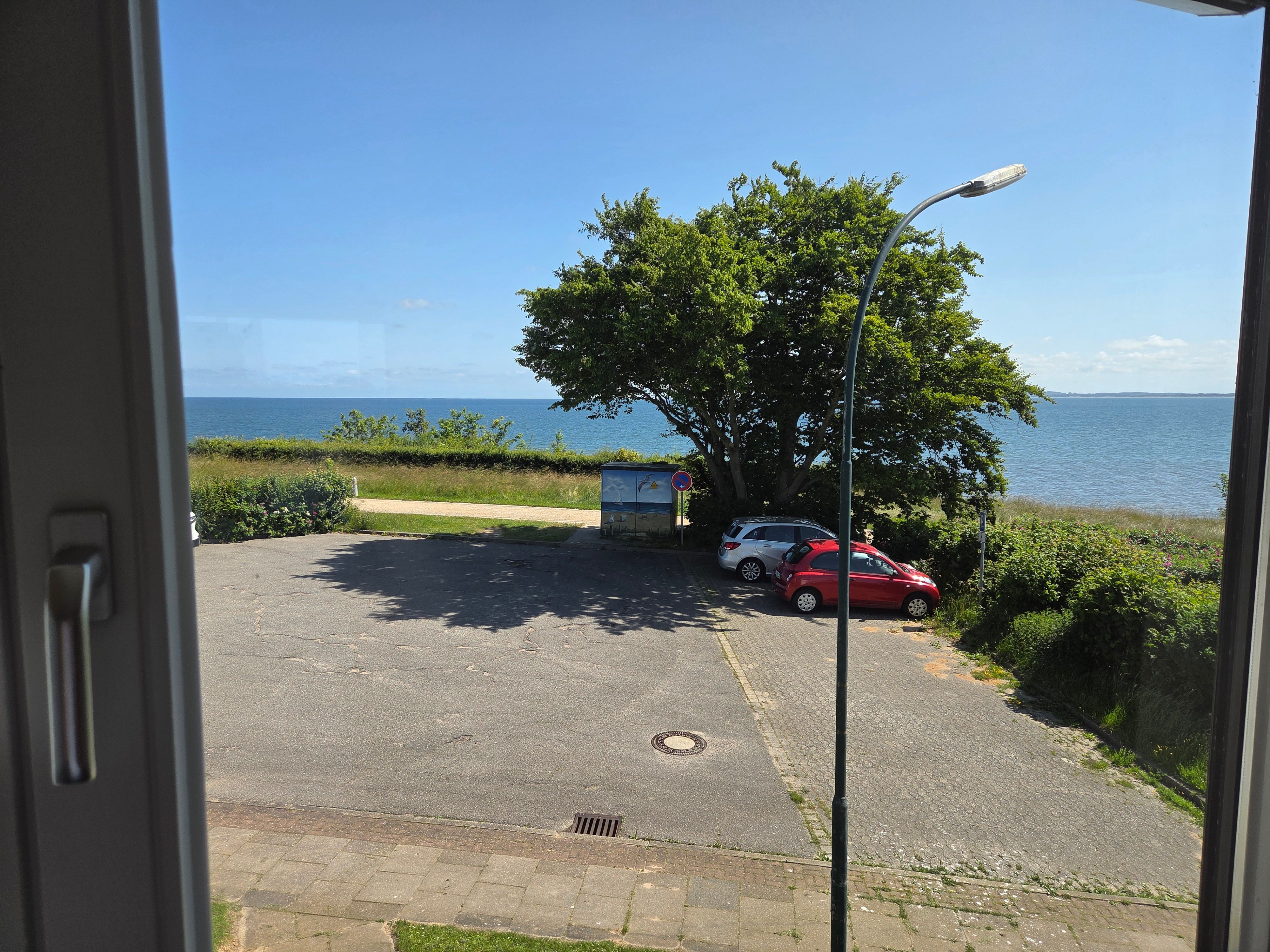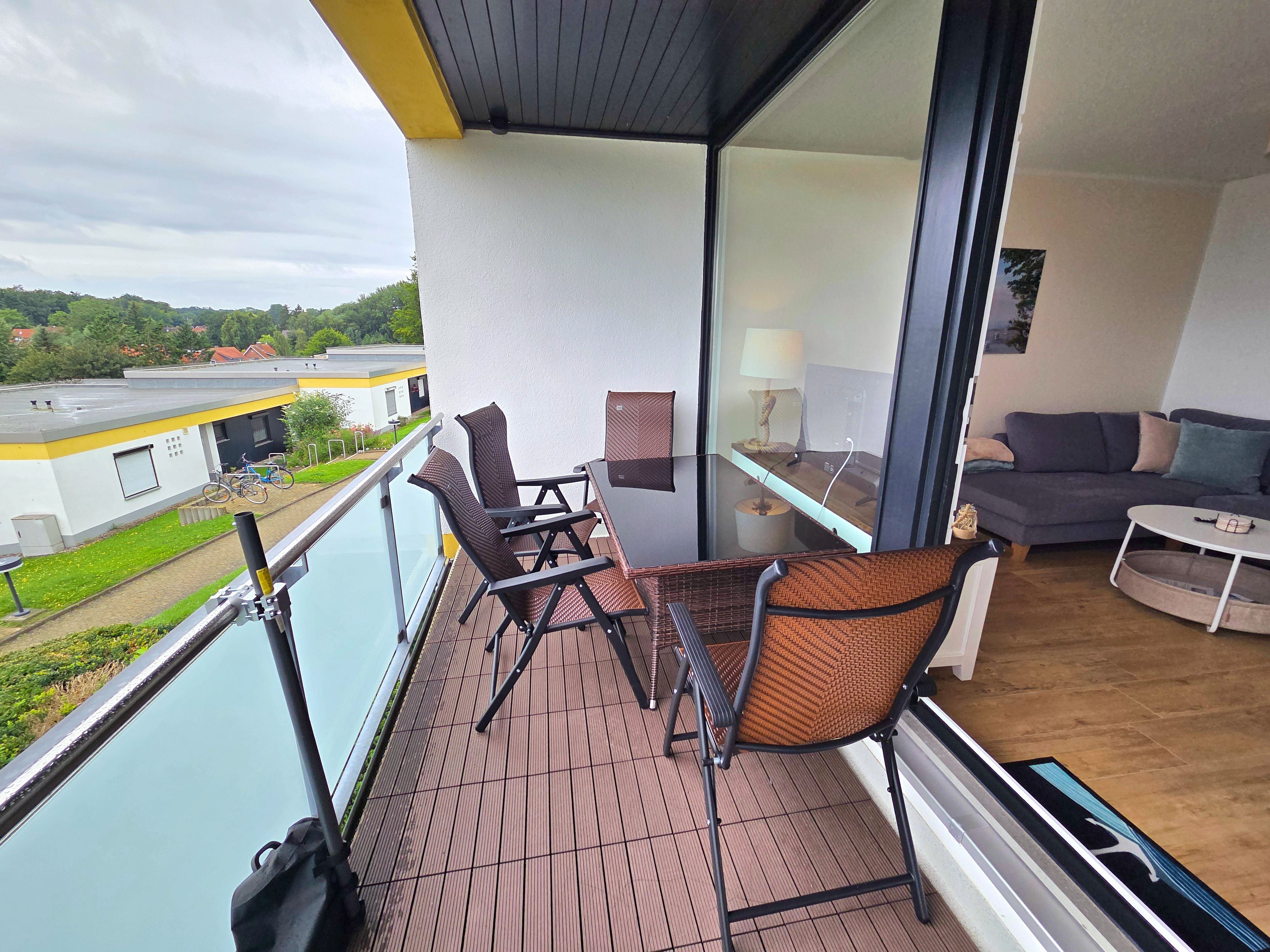 Der überdachte Balkon mit Meerblick lädt zum Verweilen im Freien ein, ausgestattet mit bequemen Gartenmöbeln und Sonnenschirm. Hier genießen Sie zu jeder Tageszeit die frische Ostseeluft und einen ansprechenden Ausblick – ideal um zu entspannen oder den Tag ausklingen zu lassen. Fliegengitter an den Fenstern sorgen für ungestörte Nächte.