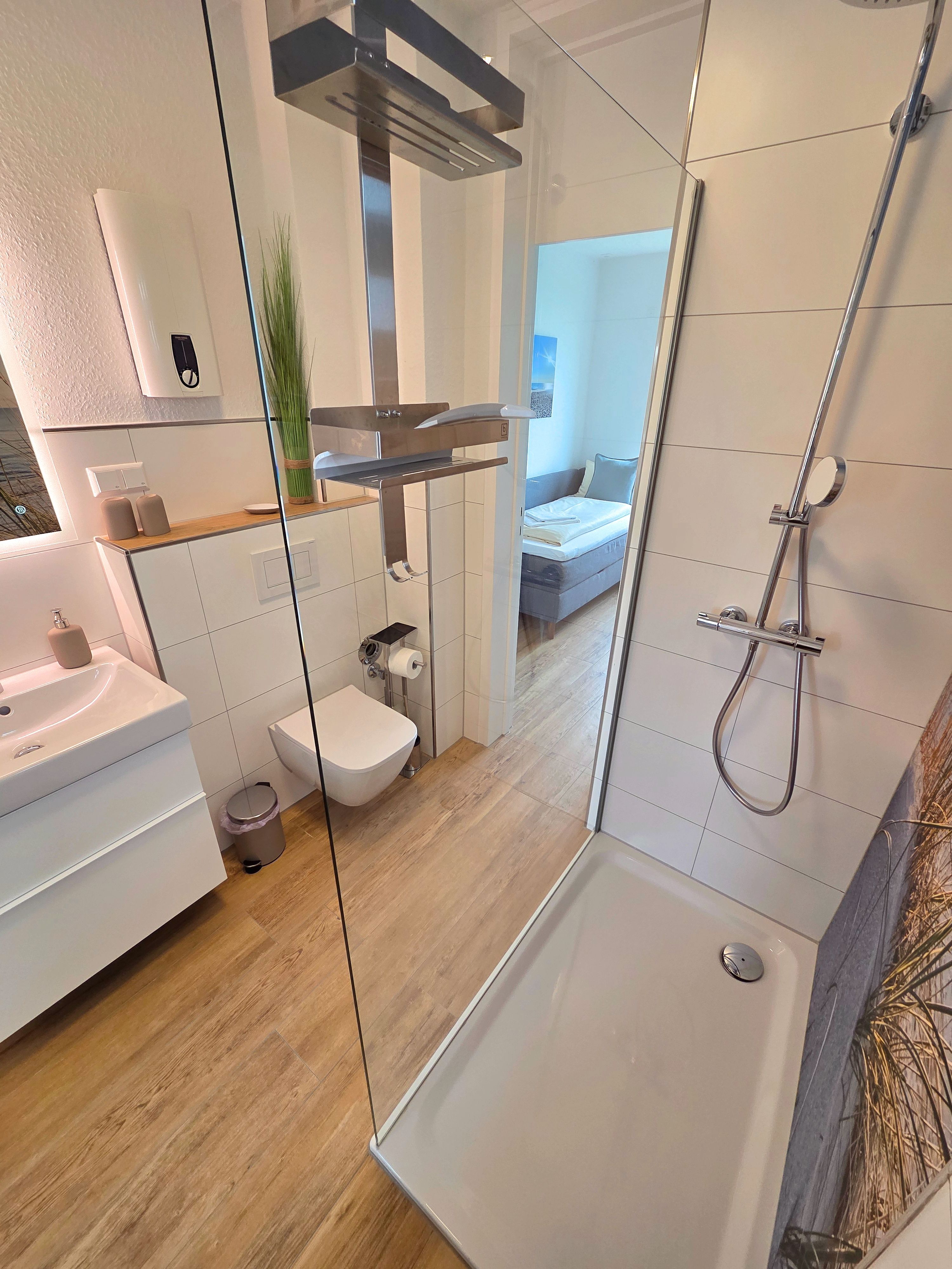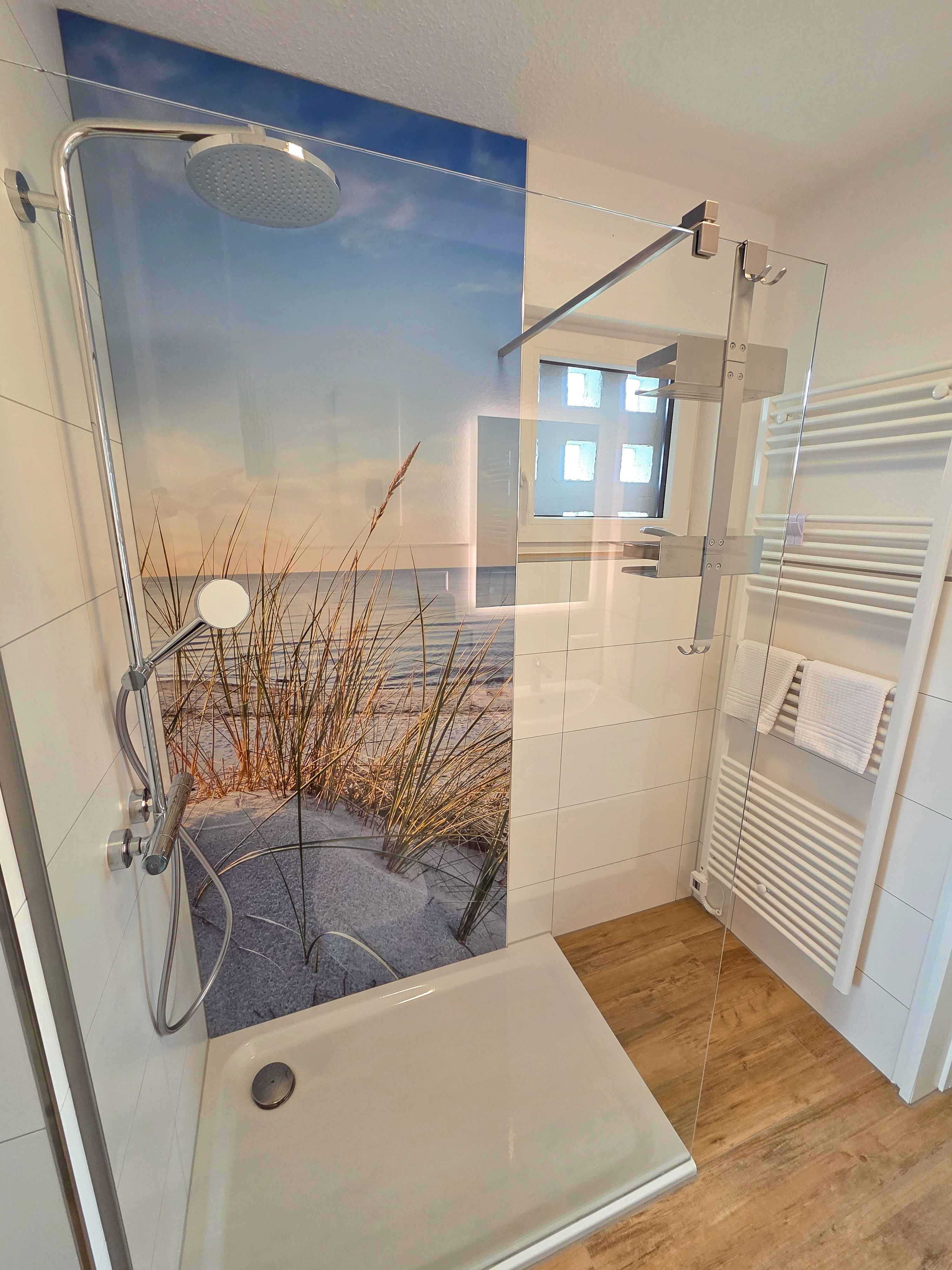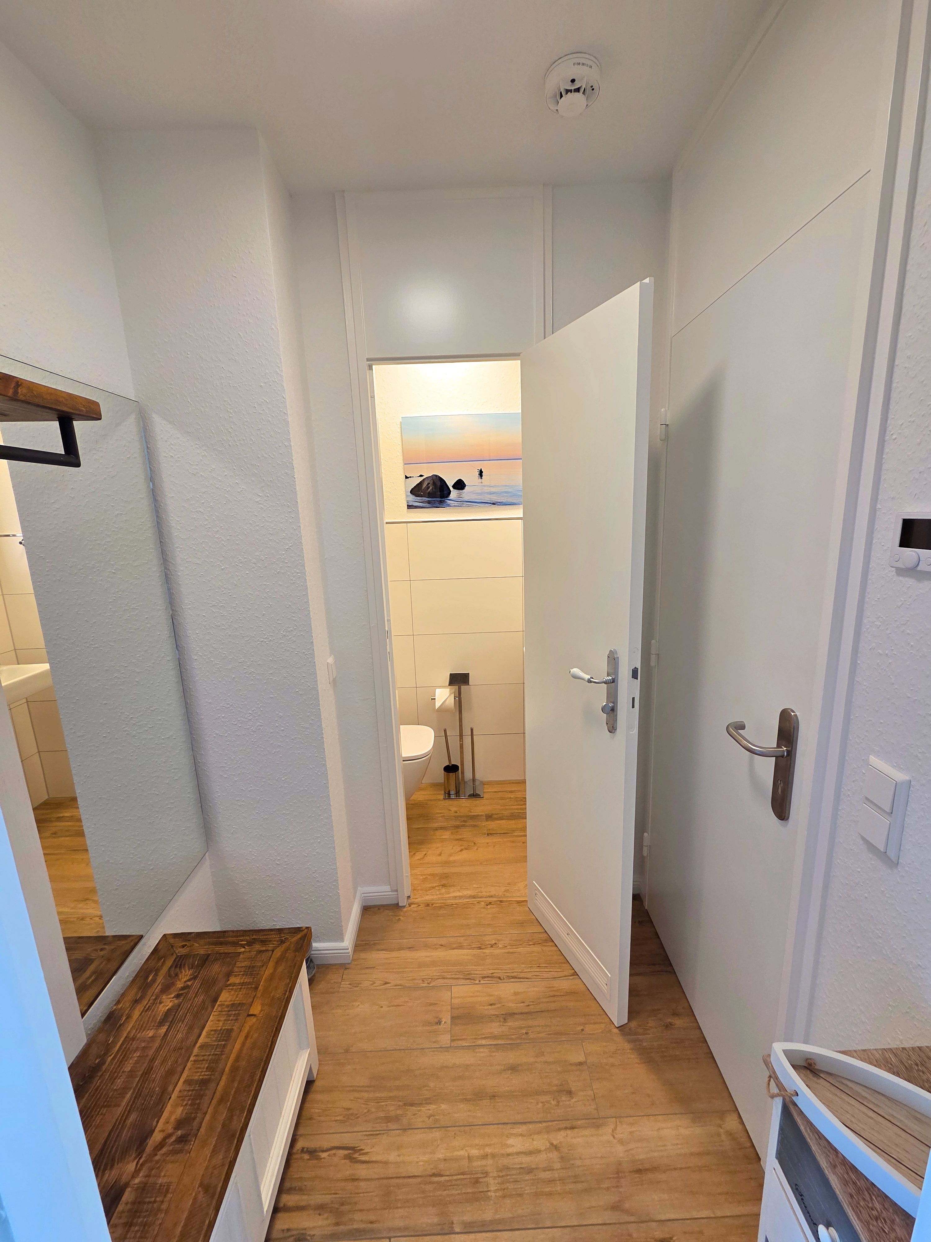Der überdachte Balkon mit Meerblick lädt zum Verweilen im Freien ein, ausgestattet mit bequemen Gartenmöbeln und Sonnenschirm. Hier genießen Sie zu jeder Tageszeit die frische Ostseeluft und einen ansprechenden Ausblick – ideal um zu entspannen oder den Tag ausklingen zu lassen. Fliegengitter an den Fenstern sorgen für ungestörte Nächte.
