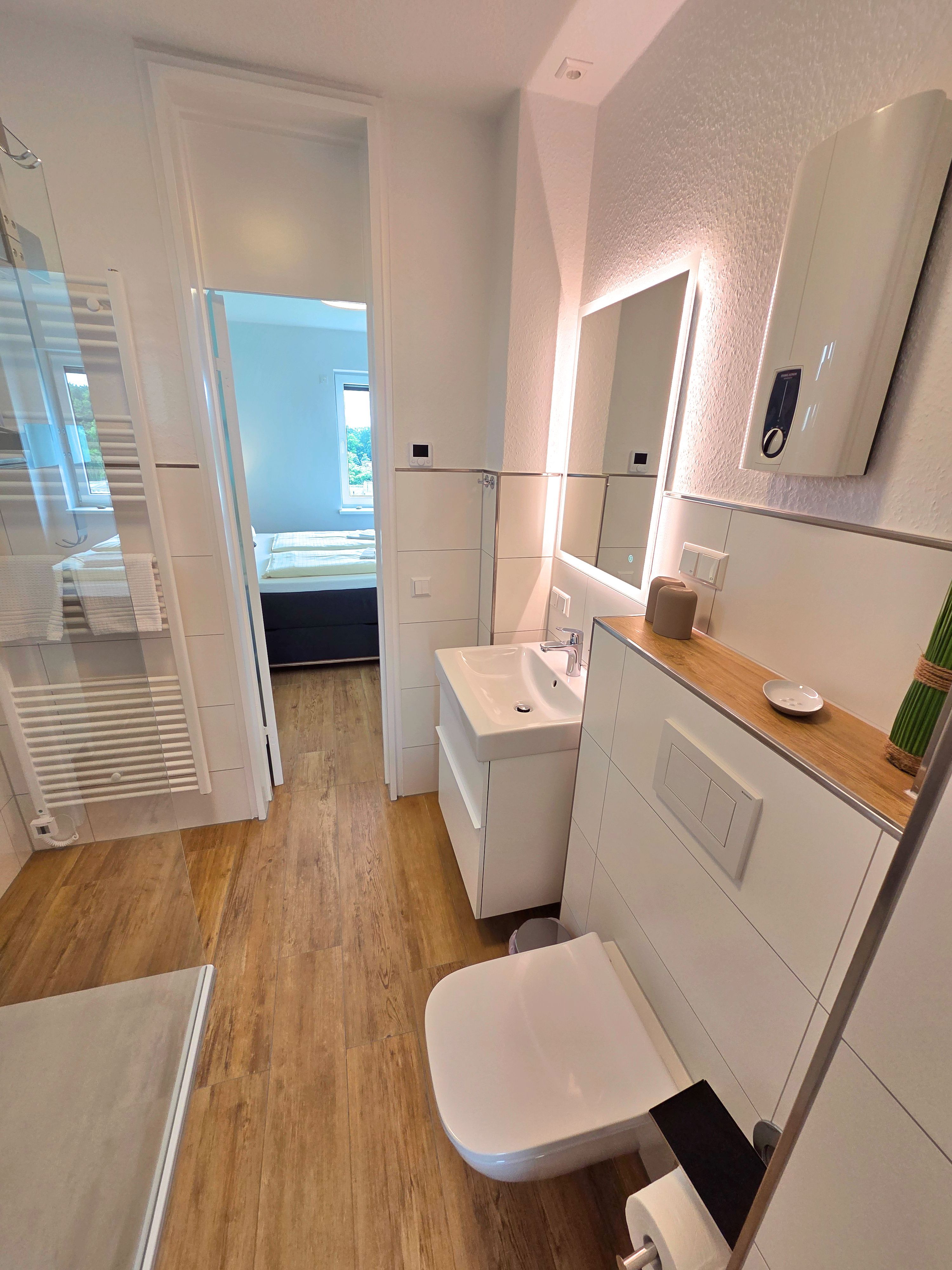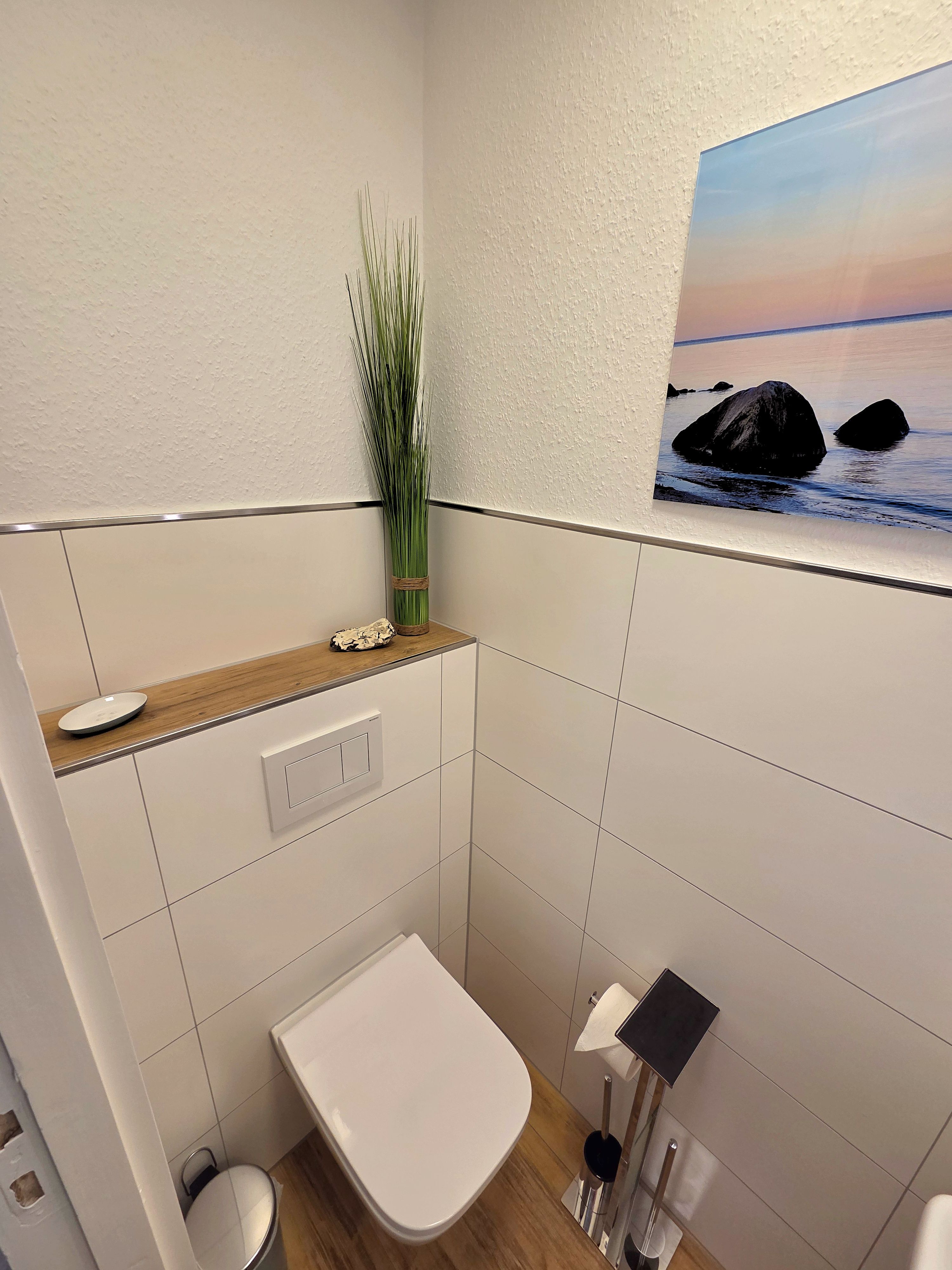 Zur weiteren Ausstattung zählen eine Fußbodenheizung und Zentralheizung, ein PKW-Stellplatz auf dem Gemeinschaftsparkplatz Hohes Ufer sowie diverse praktische Hilfsmittel wie Bügeleisen, Bügelbrett, Wäscheständer, Staubsauger und Ganzkörperspiegel. Für die organisatorischen Bedürfnisse steht ausreichend Stauraum durch Garderobe, Schuhschrank und Kommoden zur Verfügung.