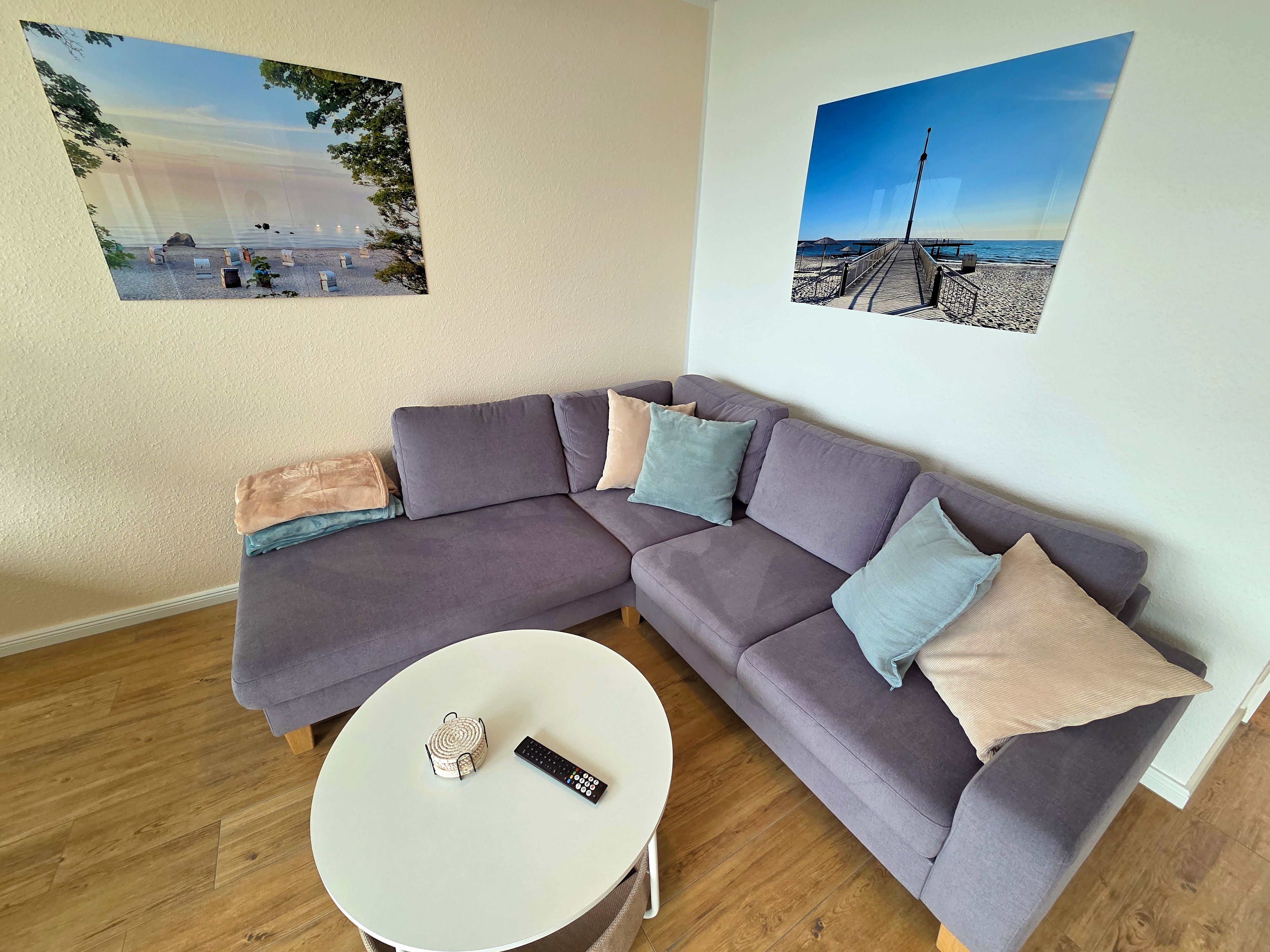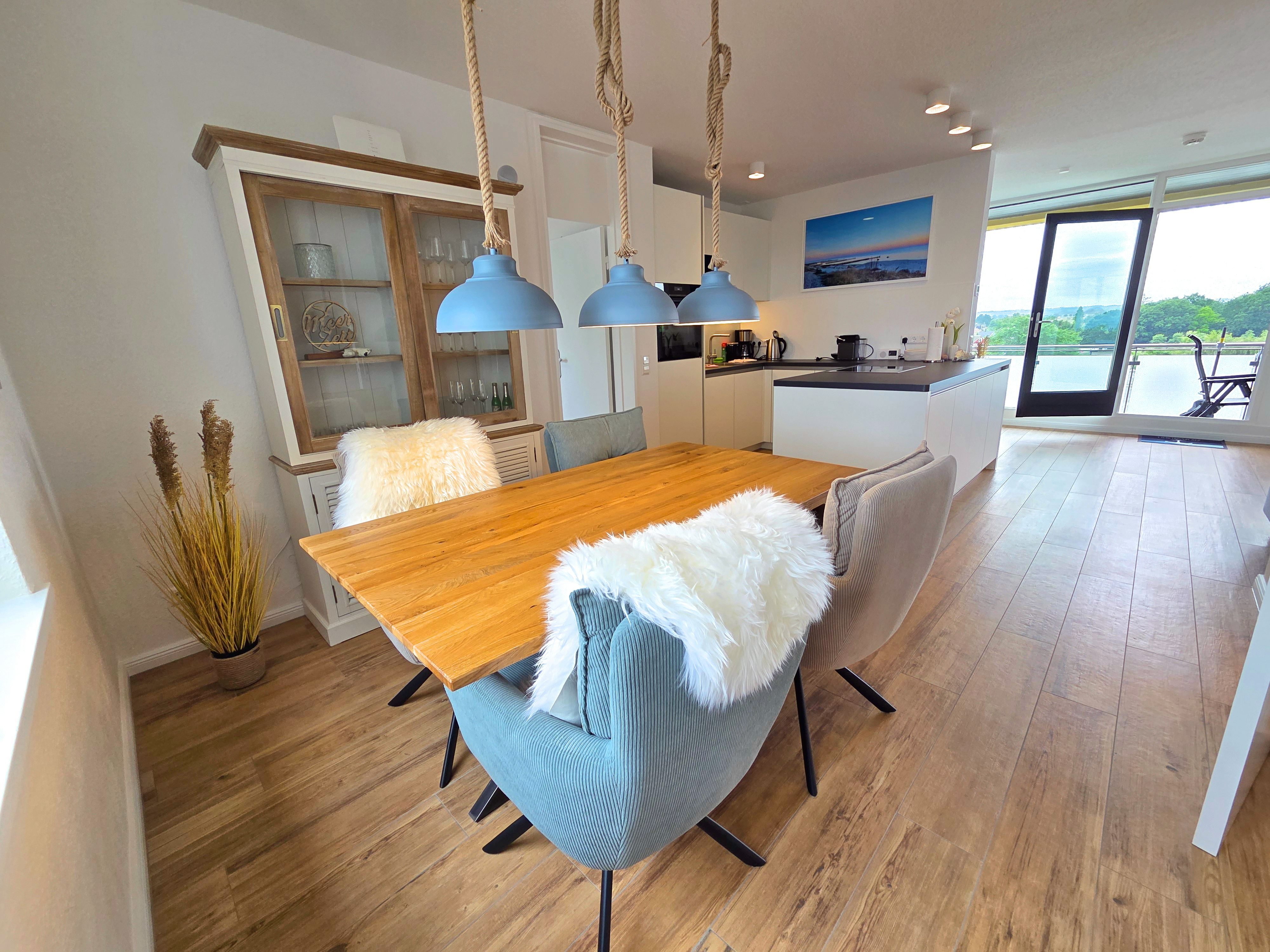 Der offen zum Wohnzimmer gestaltete Küchenbereich ist vollständig ausgestattet und bietet unter anderem eine Induktionskochstelle, einen Backofen, eine Mikrowelle, einen Kühlschrank mit Gefrierfach, eine Spülmaschine, Kaffeemaschine, Wasserkocher, Toaster sowie umfangreiche Küchenutensilien, Geschirr und Besteck. Der angrenzende Essbereich ist perfekt für gemeinsame Mahlzeiten. Im wohnlichen Wohnzimmerbereich mit Sofaecke können Sie entspannen und dank des Smart-TV und schnellen Internetanschlusses (ab 100 Mbit/s) auch Unterhaltungsangebote sowie aktuelle Informationen nutzen.