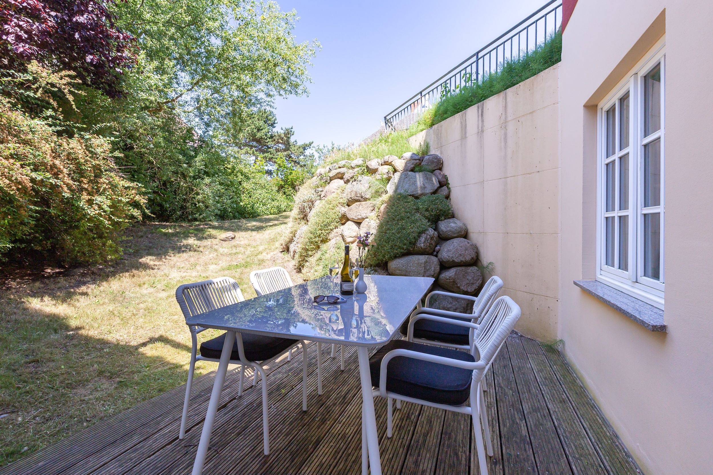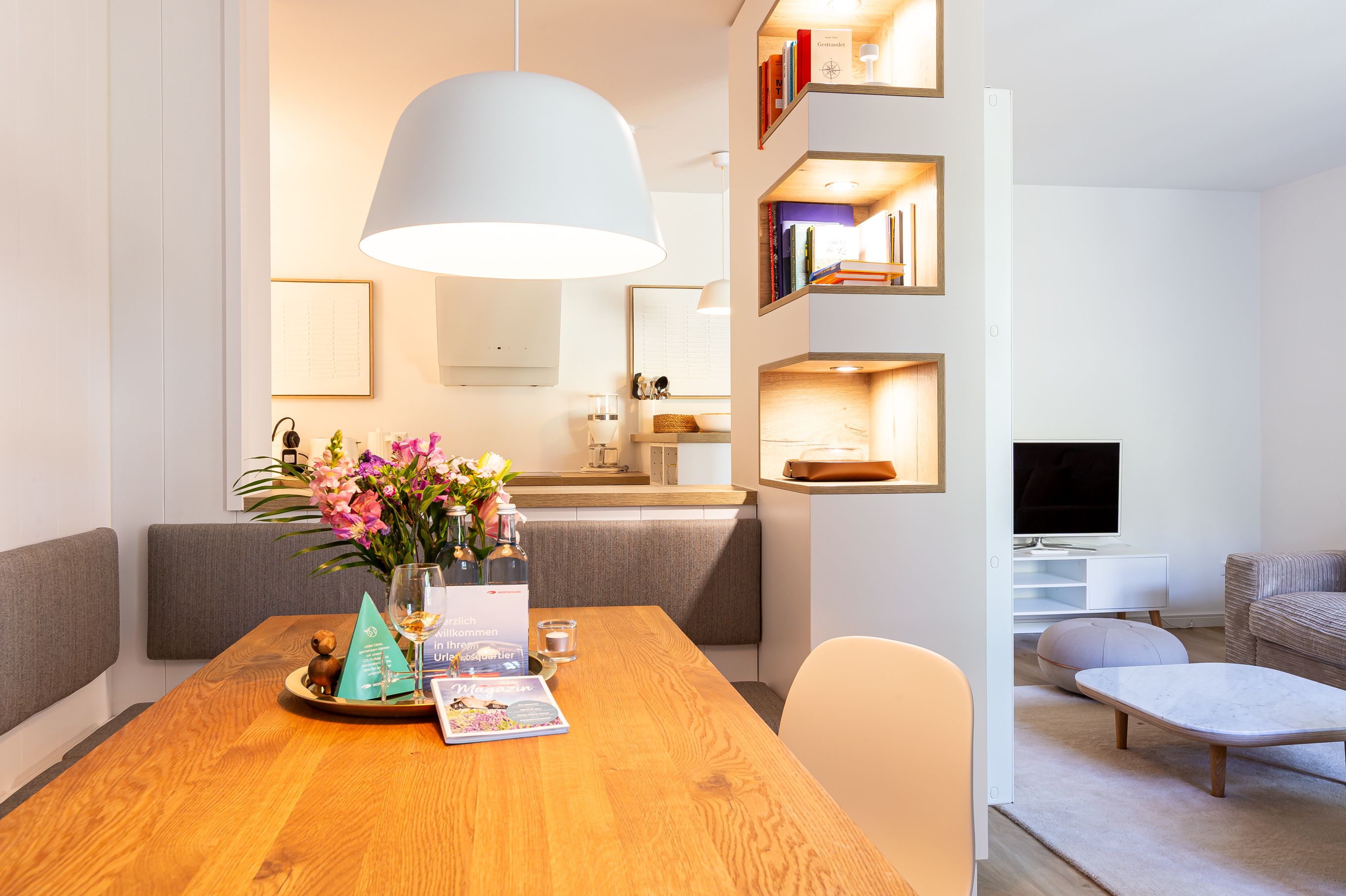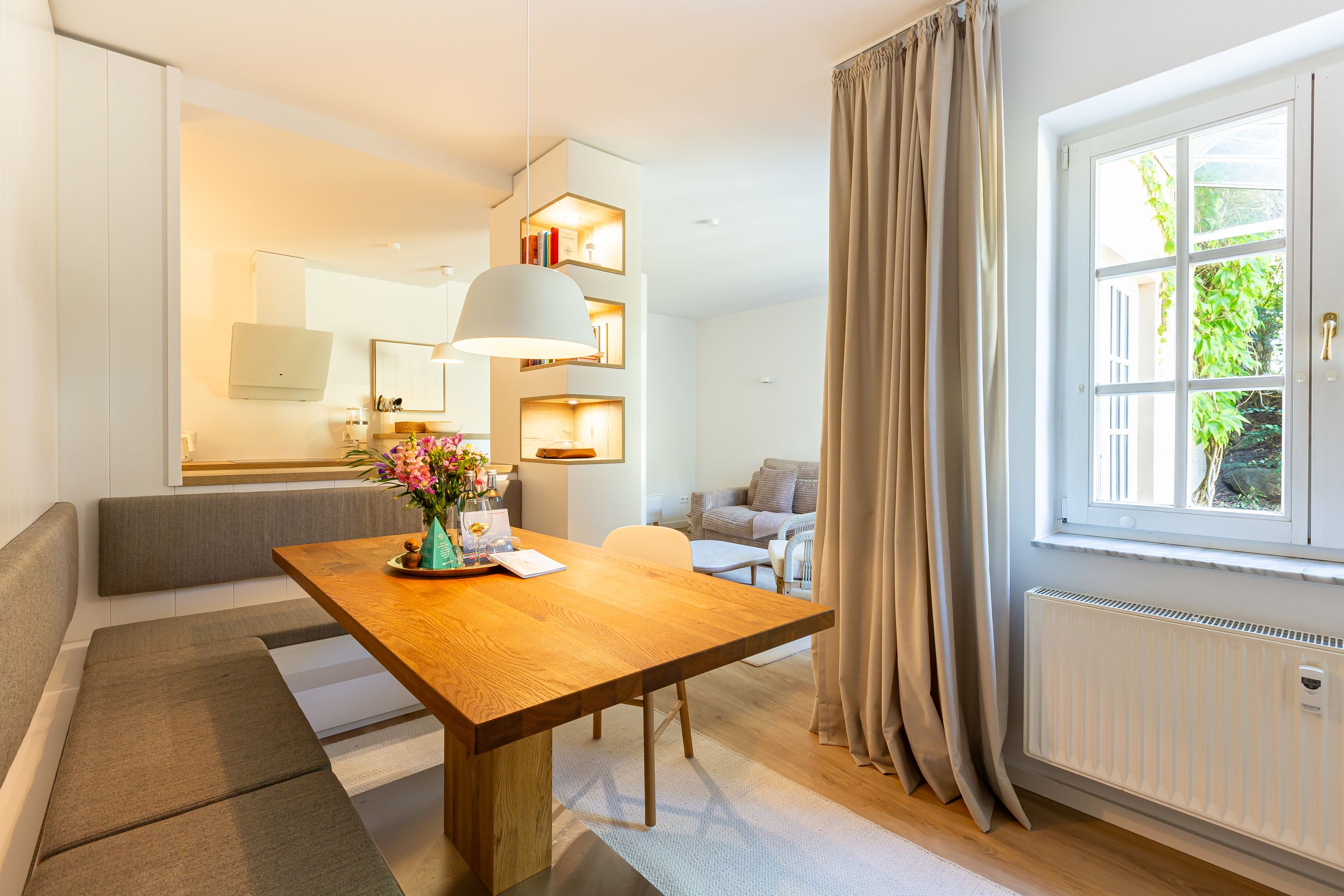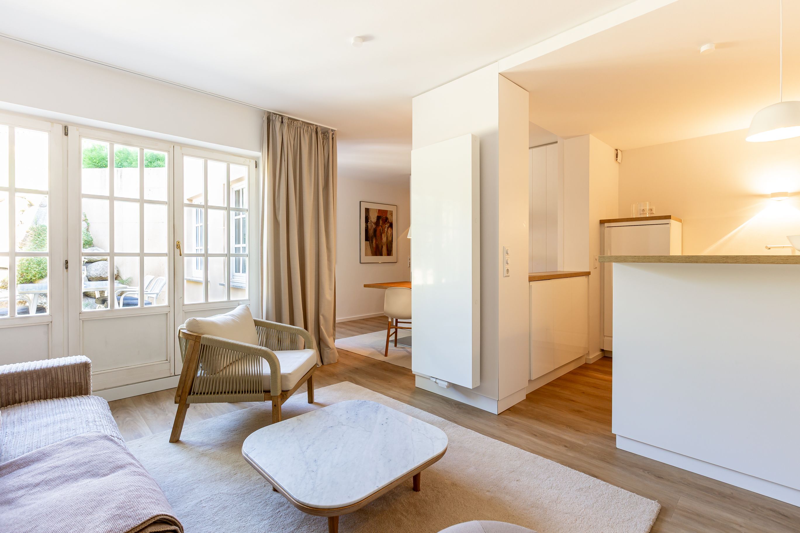 Diese Souterrainwohnung besticht durch eine helle, freundliche Atmosphäre und große Fenster mit einem wunderbaren Blick ins Grüne und den gepflegten Garten. Hier genießt man nicht nur die Ruhe, sondern auch ein stilvolles Ambiente, das bis ins Detail durchdacht ist. Die traumhafte Ausstattung zeichnet sich durch hochwertige Materialien und eine perfekte Abstimmung aus. Jedes Möbelstück und Accessoire wurde mit Bedacht gewählt, um eine harmonische Wohlfühlatmosphäre zu schaffen. Das Farbkonzept in warmen Sandtönen passt sich perfekt der strandnahen Umgebung an und lädt zum Entspannen ein. Die Raumaufteilung ist optimal auf die Bedürfnisse von zwei Personen abgestimmt. Der offene Wohn- und Essbereich bietet viel Platz zum Verweilen, während das Schlafzimmer durch seine gemütliche Gestaltung zum Rückzugsort wird. Auch die offene Wohnküche ist hochwertig ausgestattet und lässt keine Wünsche offen, sodass das Kochen in dieser Umgebung zu einem Vergnügen wird.