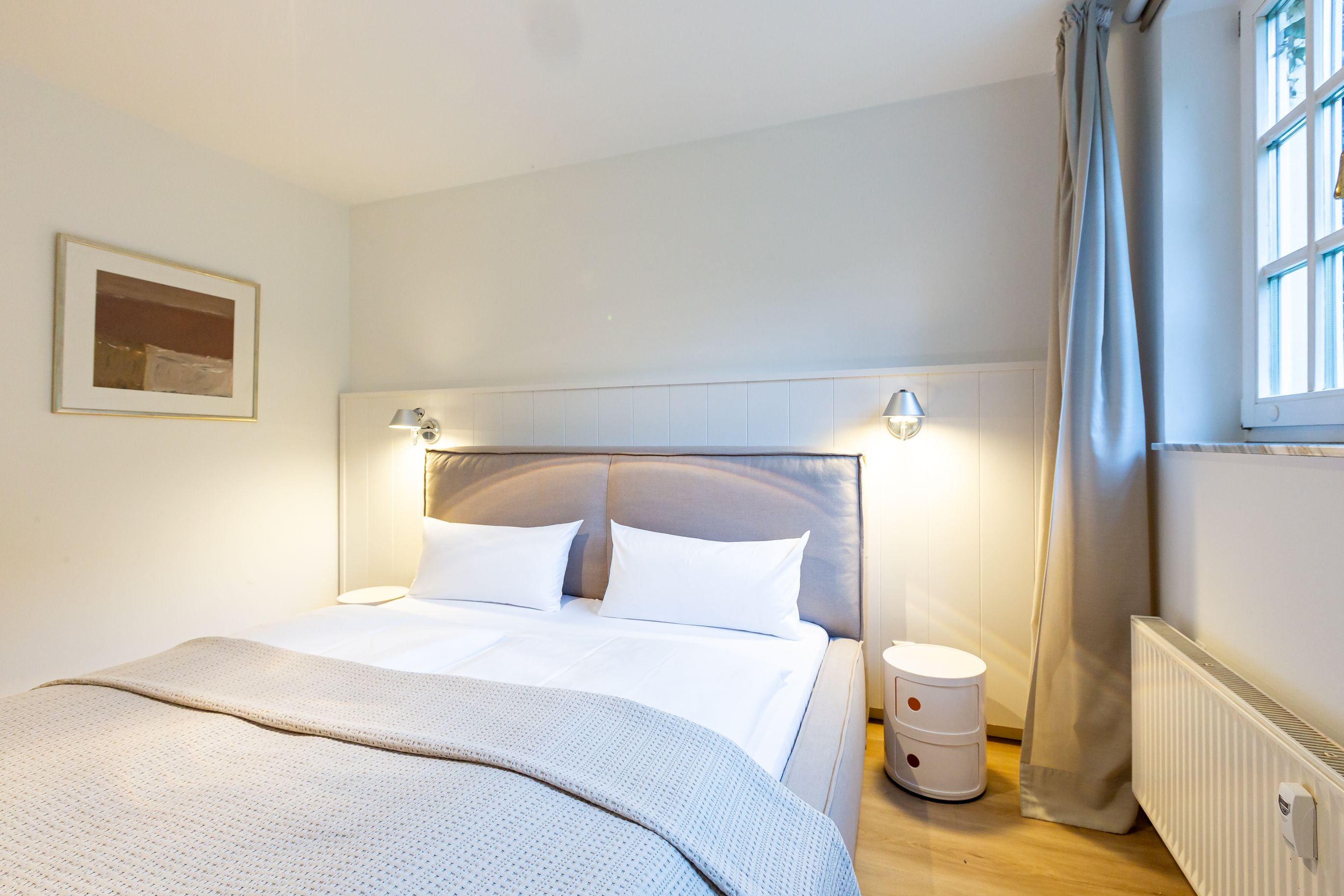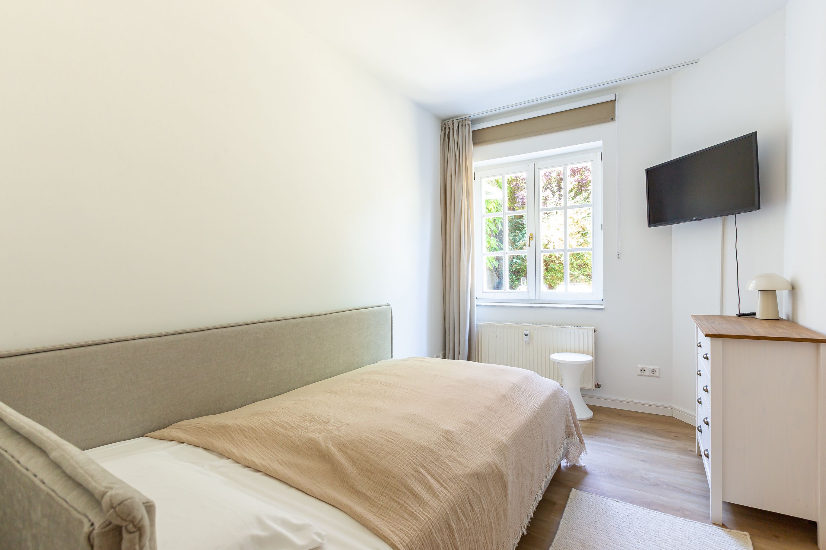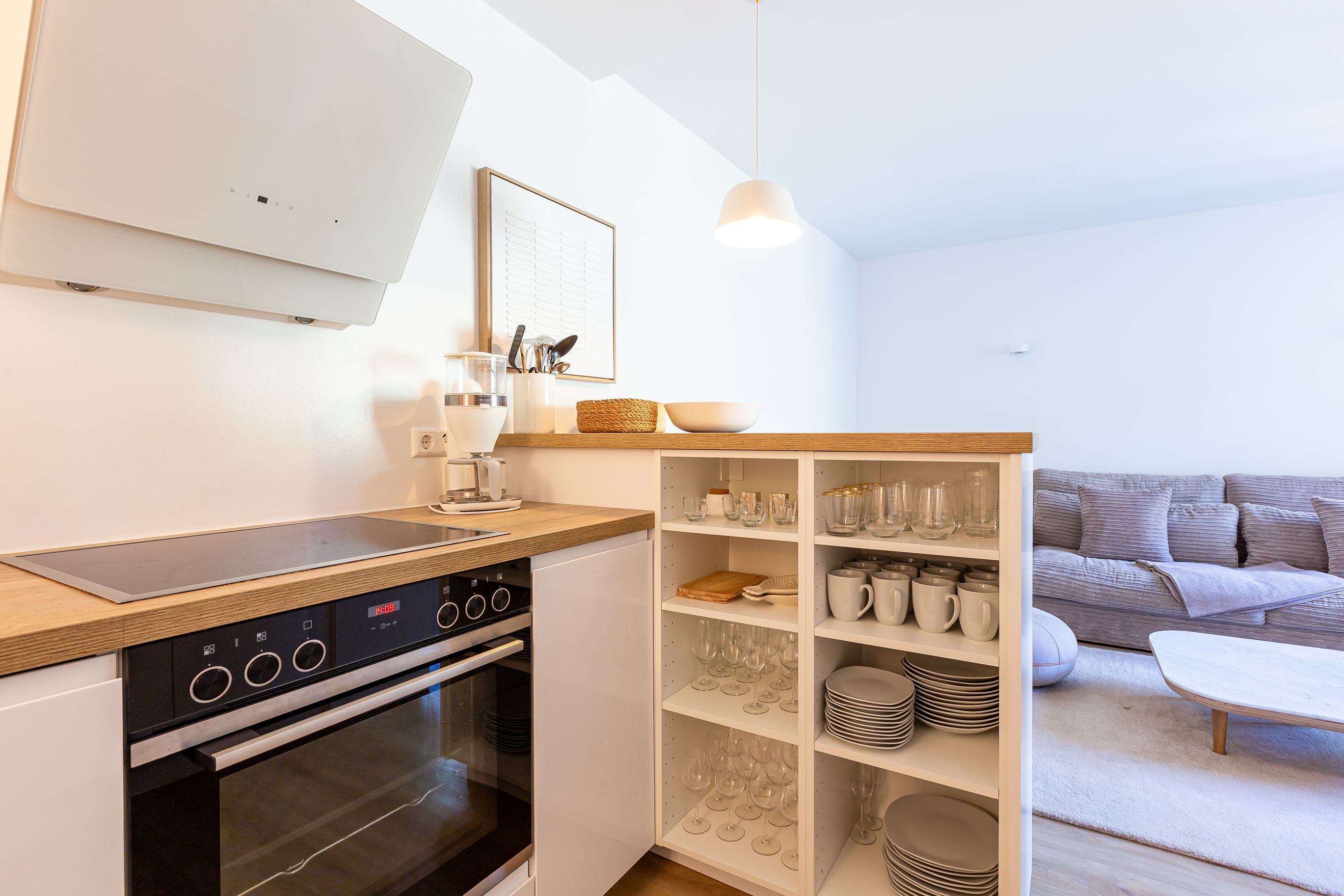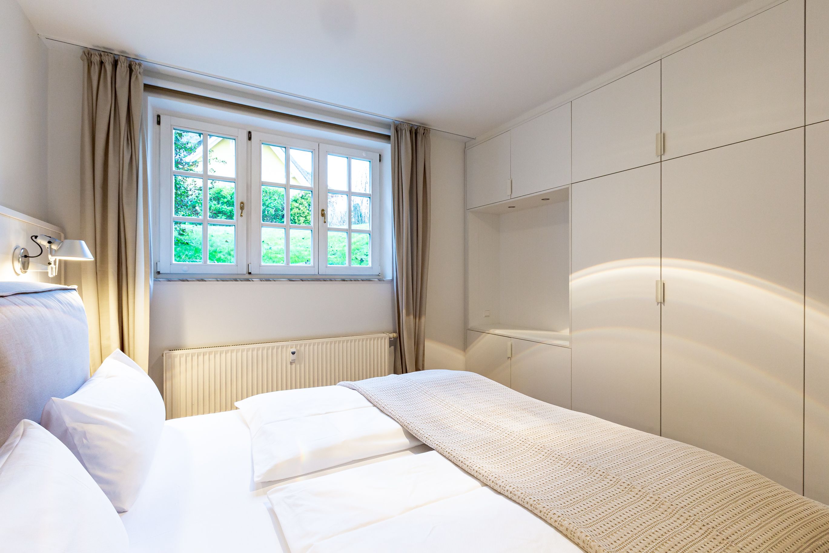 Diese Souterrainwohnung besticht durch eine helle, freundliche Atmosphäre und große Fenster mit einem wunderbaren Blick ins Grüne und den gepflegten Garten. Hier genießt man nicht nur die Ruhe, sondern auch ein stilvolles Ambiente, das bis ins Detail durchdacht ist. Die traumhafte Ausstattung zeichnet sich durch hochwertige Materialien und eine perfekte Abstimmung aus. Jedes Möbelstück und Accessoire wurde mit Bedacht gewählt, um eine harmonische Wohlfühlatmosphäre zu schaffen. Das Farbkonzept in warmen Sandtönen passt sich perfekt der strandnahen Umgebung an und lädt zum Entspannen ein. Die Raumaufteilung ist optimal auf die Bedürfnisse von zwei Personen abgestimmt. Der offene Wohn- und Essbereich bietet viel Platz zum Verweilen, während das Schlafzimmer durch seine gemütliche Gestaltung zum Rückzugsort wird. Auch die offene Wohnküche ist hochwertig ausgestattet und lässt keine Wünsche offen, sodass das Kochen in dieser Umgebung zu einem Vergnügen wird.