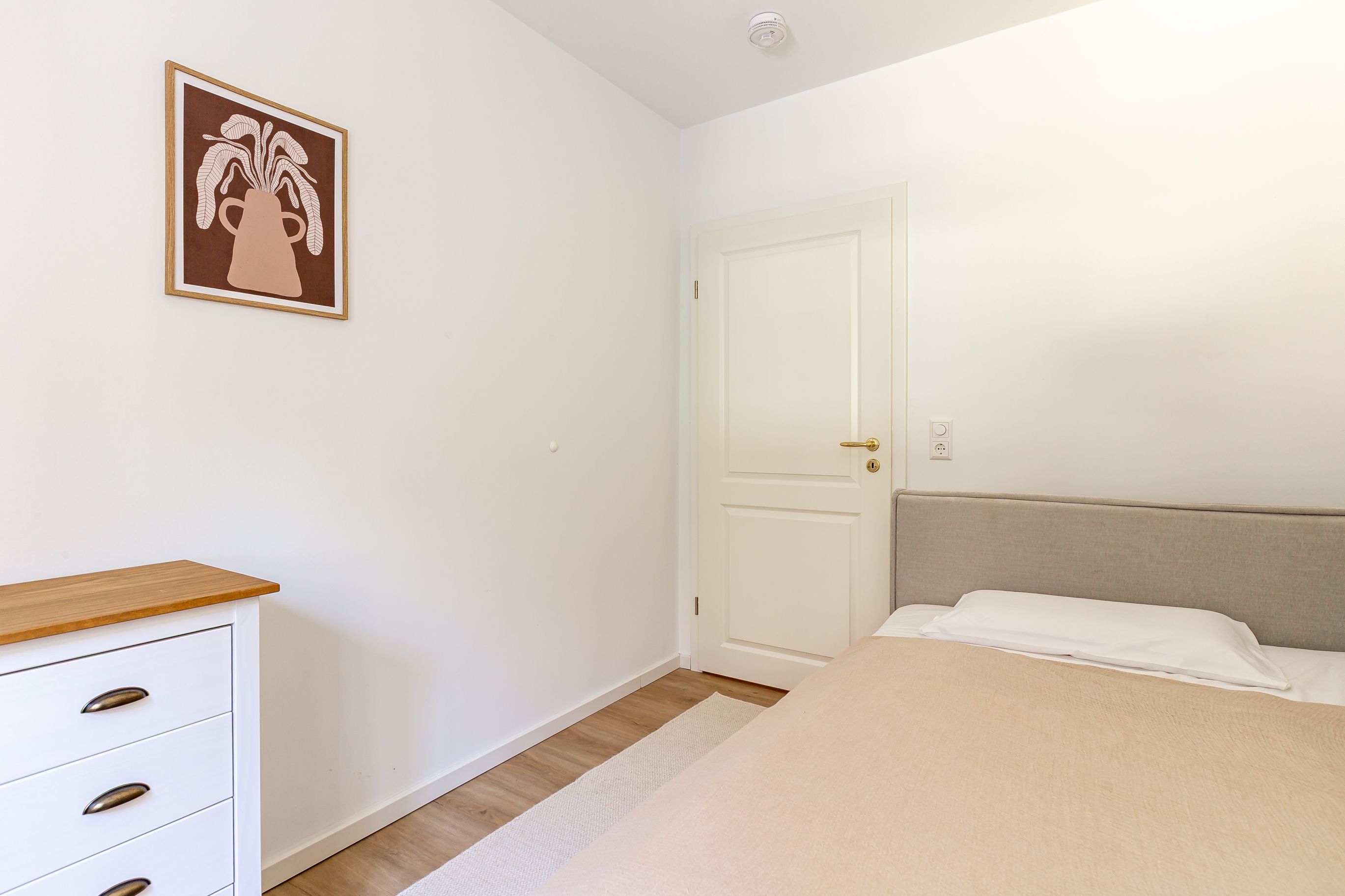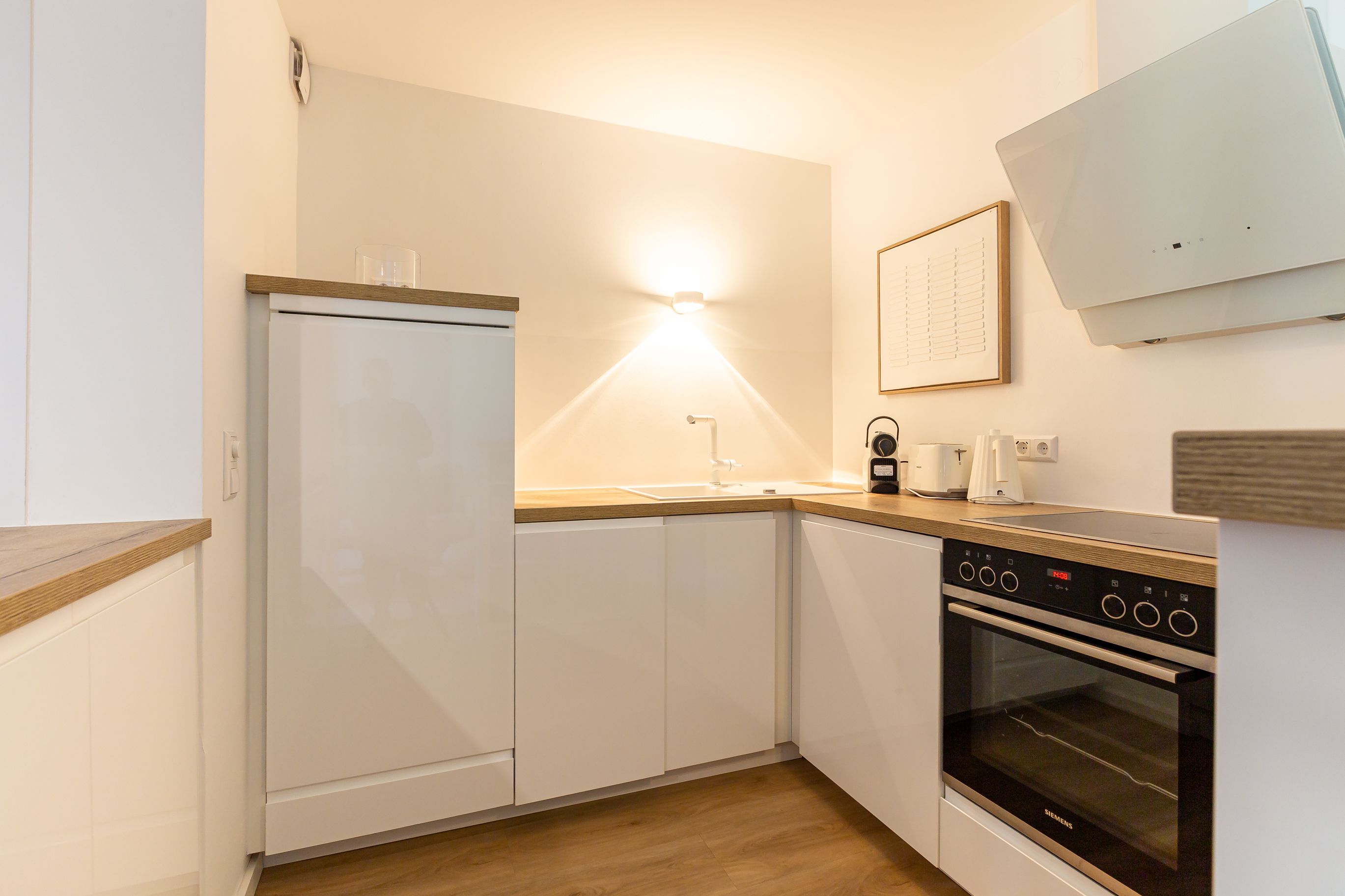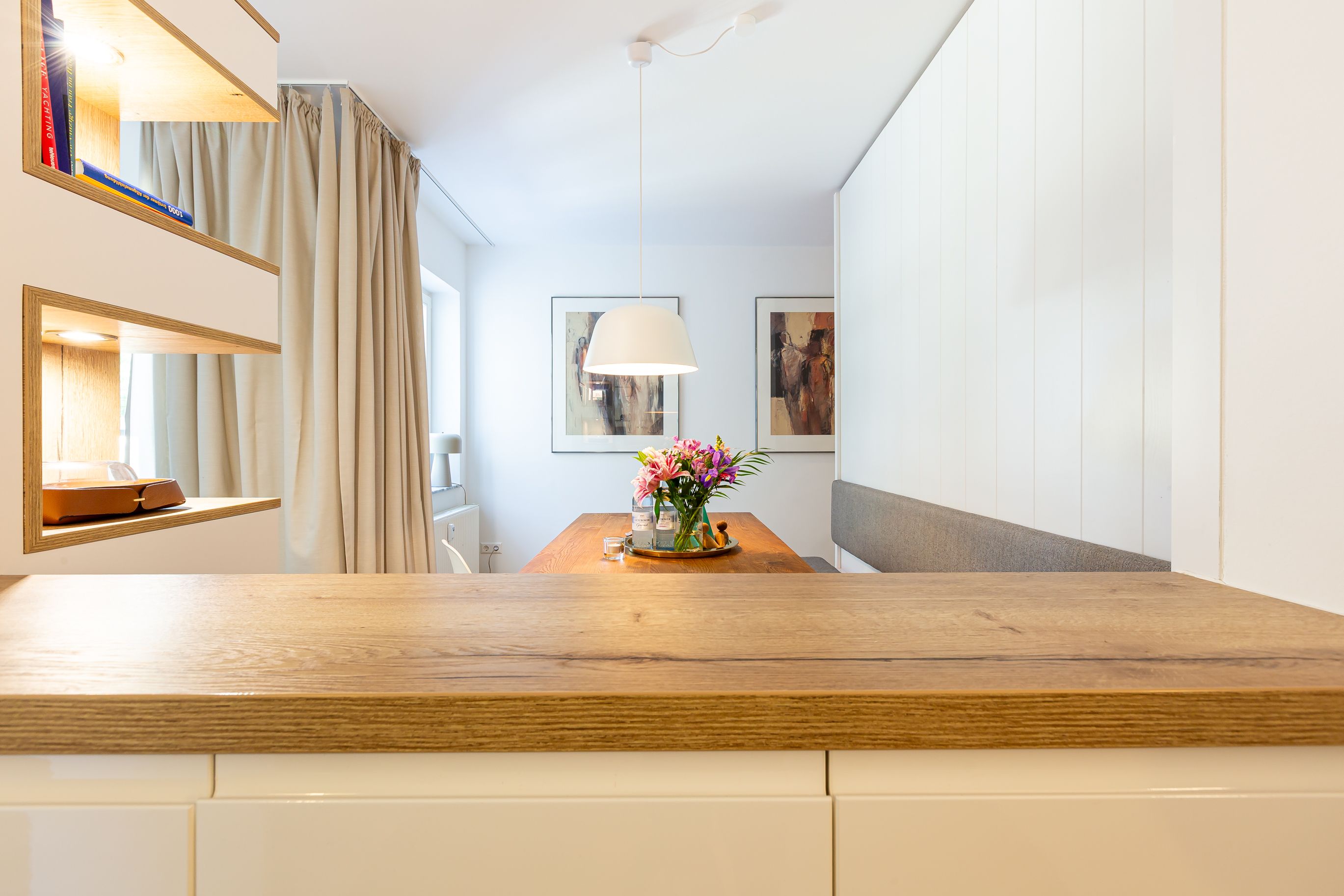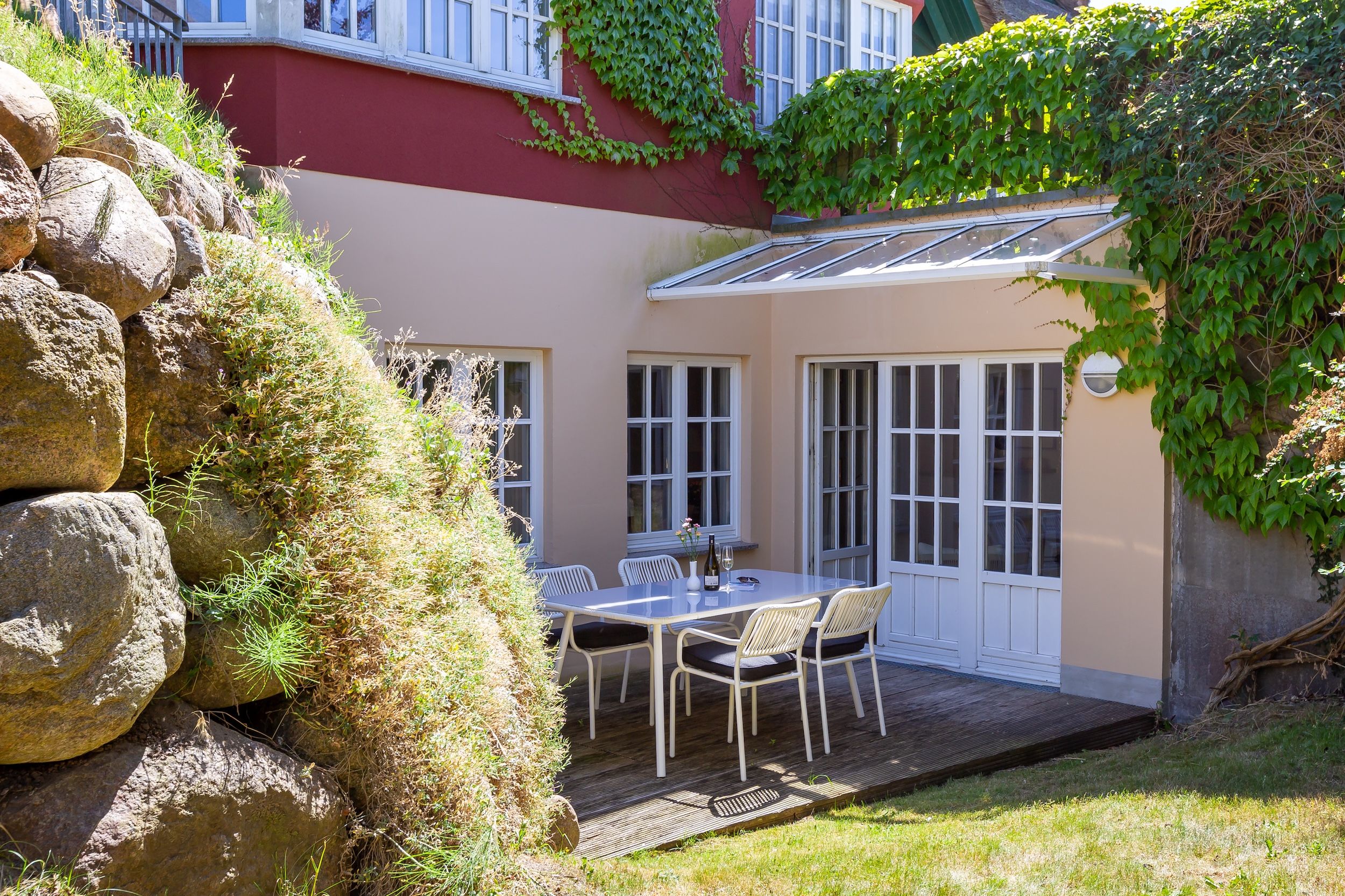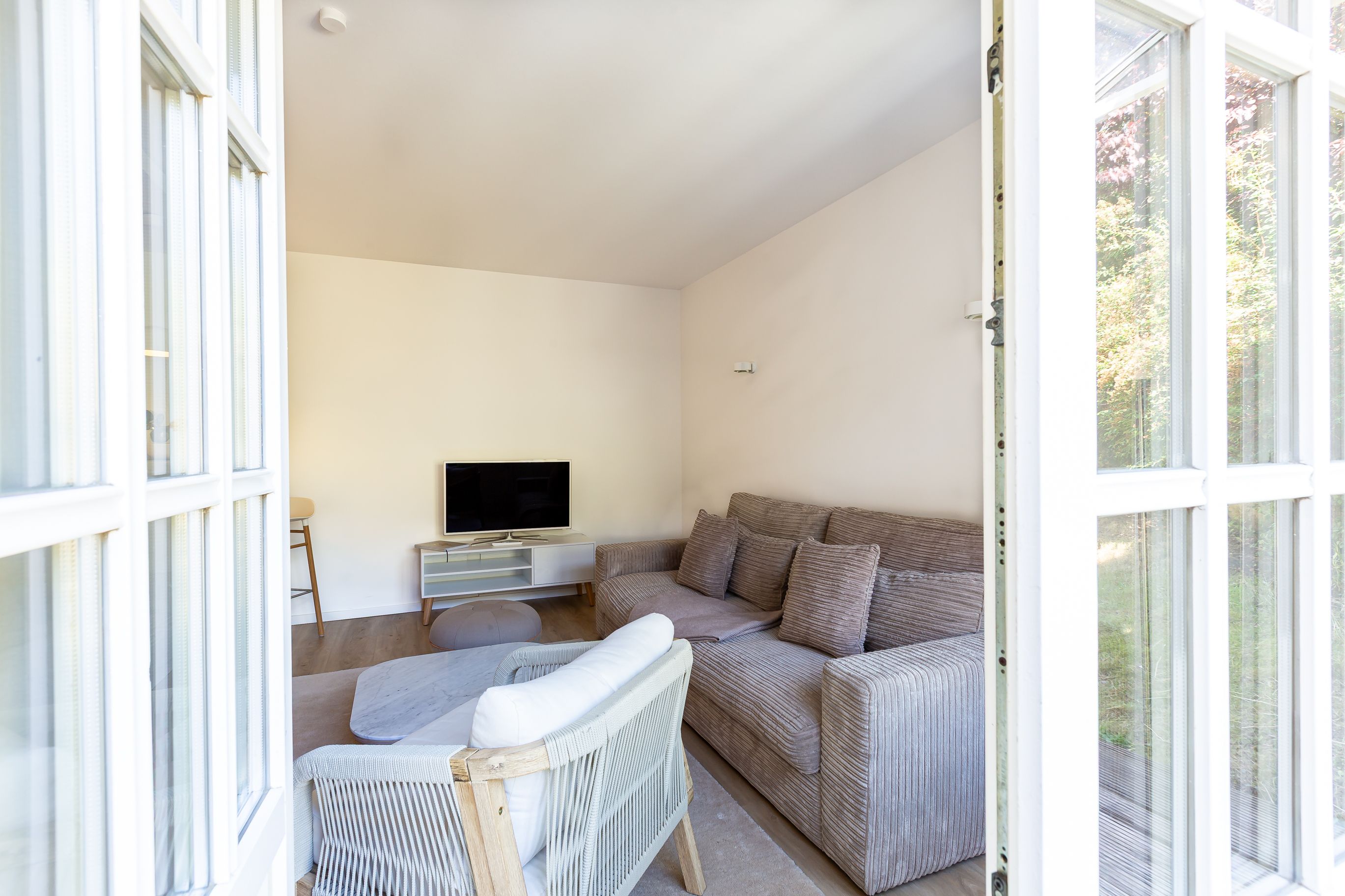 Diese Souterrainwohnung besticht durch eine helle, freundliche Atmosphäre und große Fenster mit einem wunderbaren Blick ins Grüne und den gepflegten Garten. Hier genießt man nicht nur die Ruhe, sondern auch ein stilvolles Ambiente, das bis ins Detail durchdacht ist. Die traumhafte Ausstattung zeichnet sich durch hochwertige Materialien und eine perfekte Abstimmung aus. Jedes Möbelstück und Accessoire wurde mit Bedacht gewählt, um eine harmonische Wohlfühlatmosphäre zu schaffen. Das Farbkonzept in warmen Sandtönen passt sich perfekt der strandnahen Umgebung an und lädt zum Entspannen ein. Die Raumaufteilung ist optimal auf die Bedürfnisse von zwei Personen abgestimmt. Der offene Wohn- und Essbereich bietet viel Platz zum Verweilen, während das Schlafzimmer durch seine gemütliche Gestaltung zum Rückzugsort wird. Auch die offene Wohnküche ist hochwertig ausgestattet und lässt keine Wünsche offen, sodass das Kochen in dieser Umgebung zu einem Vergnügen wird.