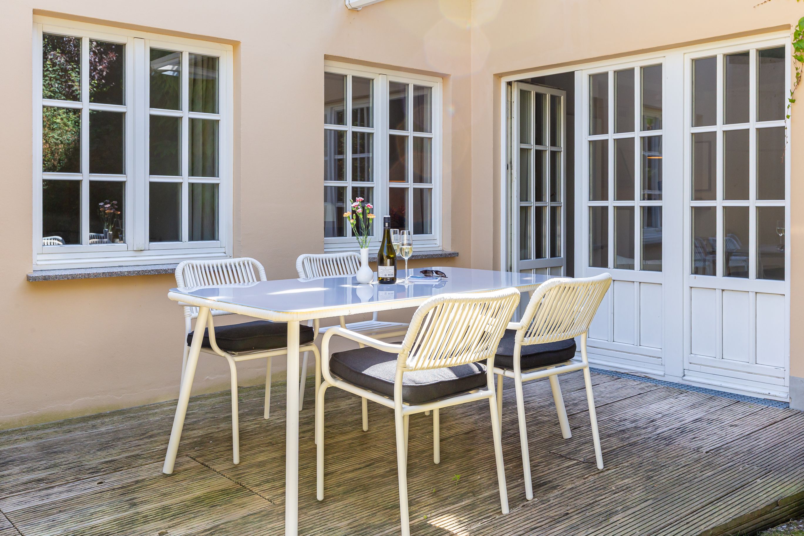 Zur Ferienwohnung gehört eine Terrasse. Diese ist zwar klein, bietet aber eine gemütliche Möglichkeit, beispielsweise den ersten Kaffee des Tages unter freiem Himmel zu genießen. Des Weiteren gehört zur Ferienwohnung ein PKW-Stellplatz und abschließbare Fahrradstellplätze im Keller des Hauses.