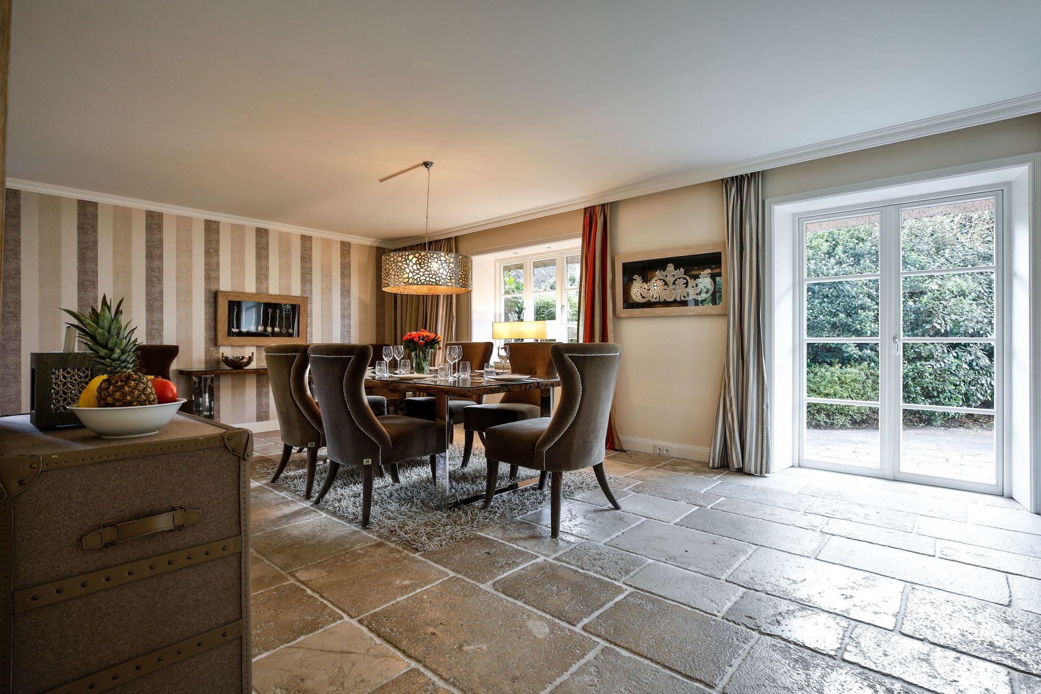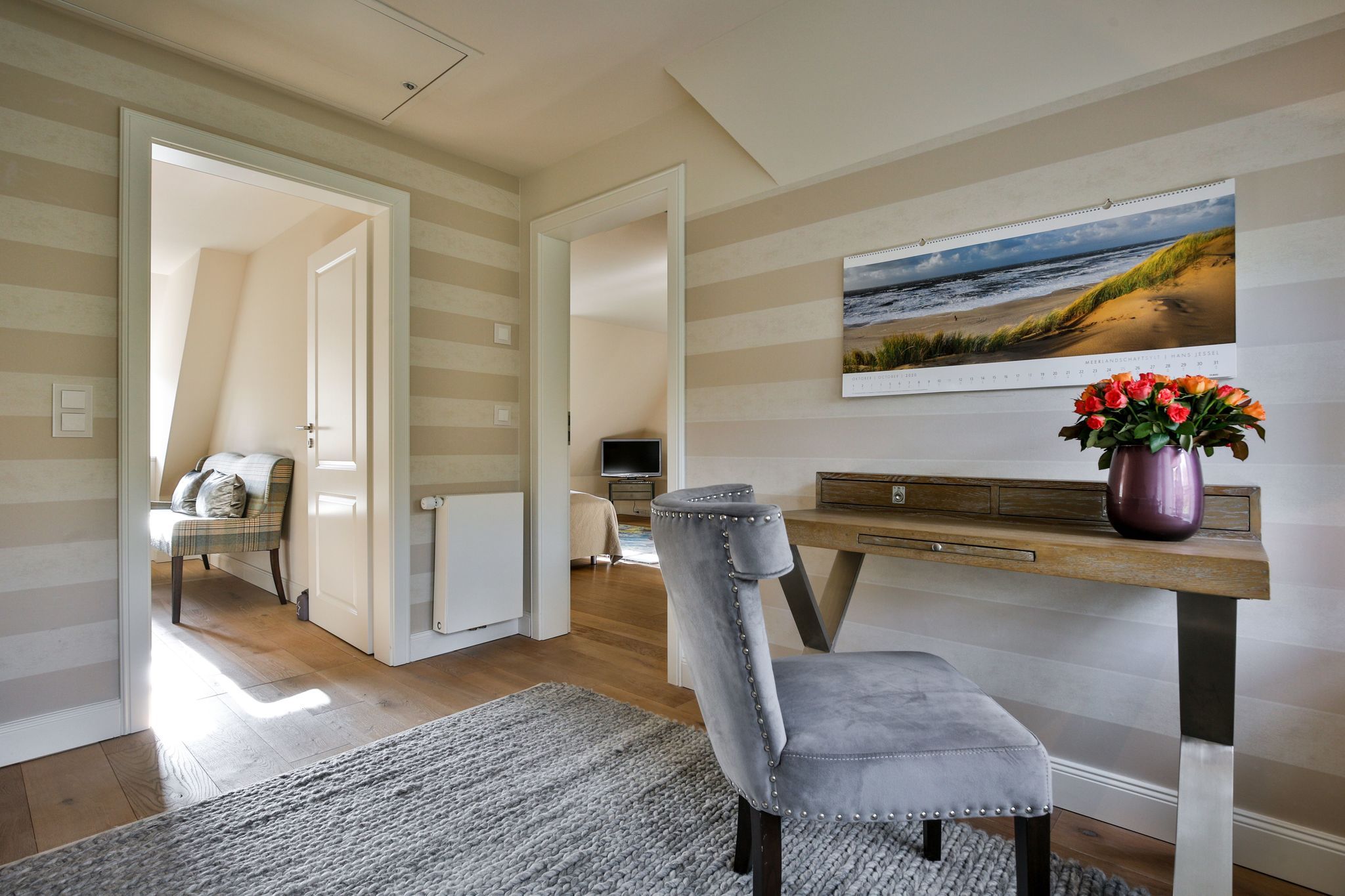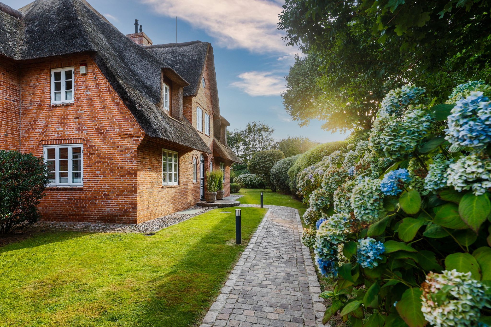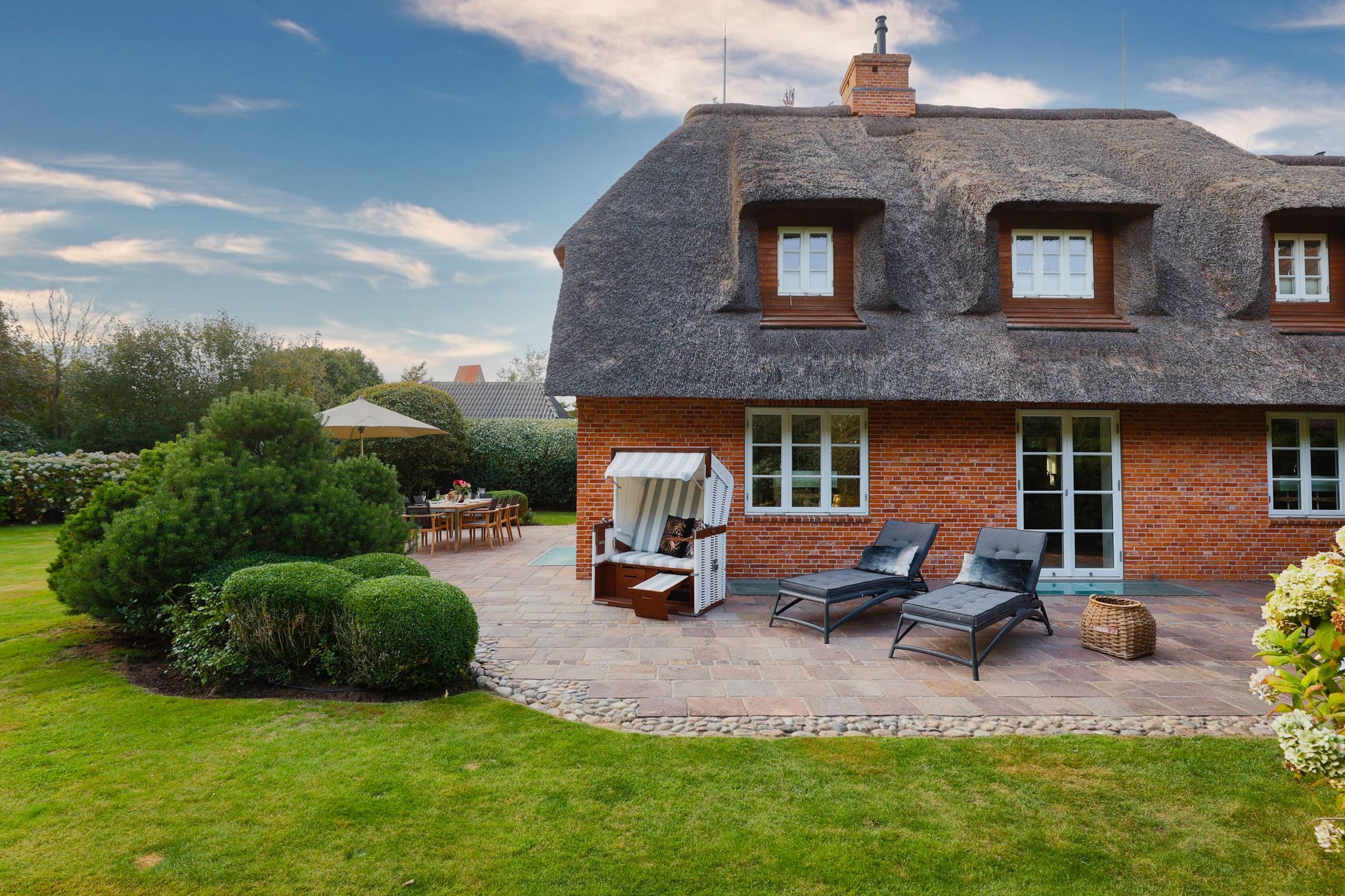 Das Haus ist hochwertig und exklusiv ausgestattet und von einem großzügigen Garten umgeben. Selbstverständlich ist dieses Haus mit 5 Sternen des DTV klassifiziert. Diese mit Reet gedeckte Doppelhaushälfte mit Einzelhaus-Charakter liegt fußläufig zur Keitumer St. Severin und in unmittelbarer Nähe zum Wattenmeer. Das helle und großzügige Objekt über drei Ebenen (EG, OG, Souterrain) ist ca. 260 m² groß und bietet zwei bis acht Personen ausreichend Platz. Das geräumige und hochwertige Haus liegt auf einem insgesamt 1.000 m² Grundstück südlich der St. Severin Kirche in Keitum. Das exklusive Doppelhaus wurde mit aufgearbeiteten Ziegelsteinen von 1886 erbaut. Die Räumlichkeiten im Erdgeschoß sind mit großflächigen sehr hochwertigen Natur Limestone ausgelegt, im Obergeschoß liegen Echtholzeichendielen, das gesamt Souterrain und die Bäder sind ebenfalls mit Limestone verlegt. Im Erdgeschoss und im Souterrain ist jeweils eine Fussbodenerwärmung integriert, zusätzlich sind auch Heizkonvektoren in allen Räumen angebracht. Auf allen Ebenen finden Sie hochwertige Tischlereinbauten. Darüber hinaus bietet das Haus jeglichen Komfort wie Sauna mit Ruheraum, Gaskamin, Flat-TV's ( streamingfähig) mit Soundbar, WLAN (High-Speed Internet), alle Schlafzimmer und Wohnzimmer mit Flachbildschirmen, Alarmanlage, Geschirrspüler, Mikrowelle, Backofen, Kühlschrank, Nespresso Kaffeemaschine, Induktionsherd, Safe, Hauswirtschaftsraum mit Waschmaschine und Trockner und zwei Pkw-Stellplätze. Bademäntel sind für Sie als unser Gast in diesem Domizil kostenfrei. Die Betten sind jeweils 1,80 x 2,00 m mit durchgängiger Matratze. Das Haus ist von einem großzügigen gepflegten Garten mit zwei Terrassen und Friesenwälle umgeben. Das Haus ist ausschließlich für Nichtraucher (auf der Terrasse wäre es erlaubt).