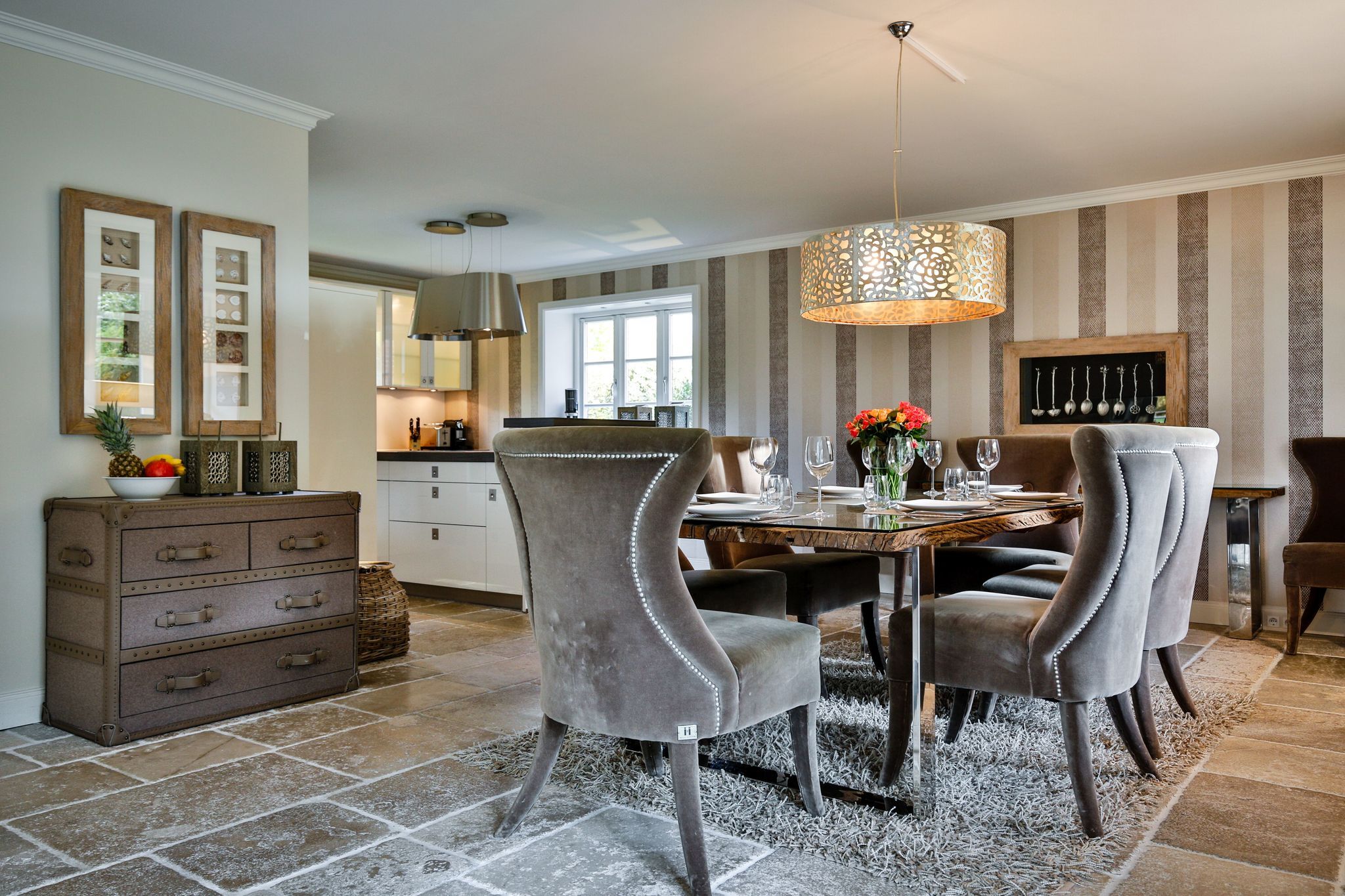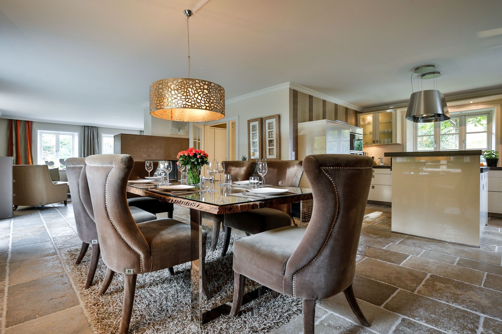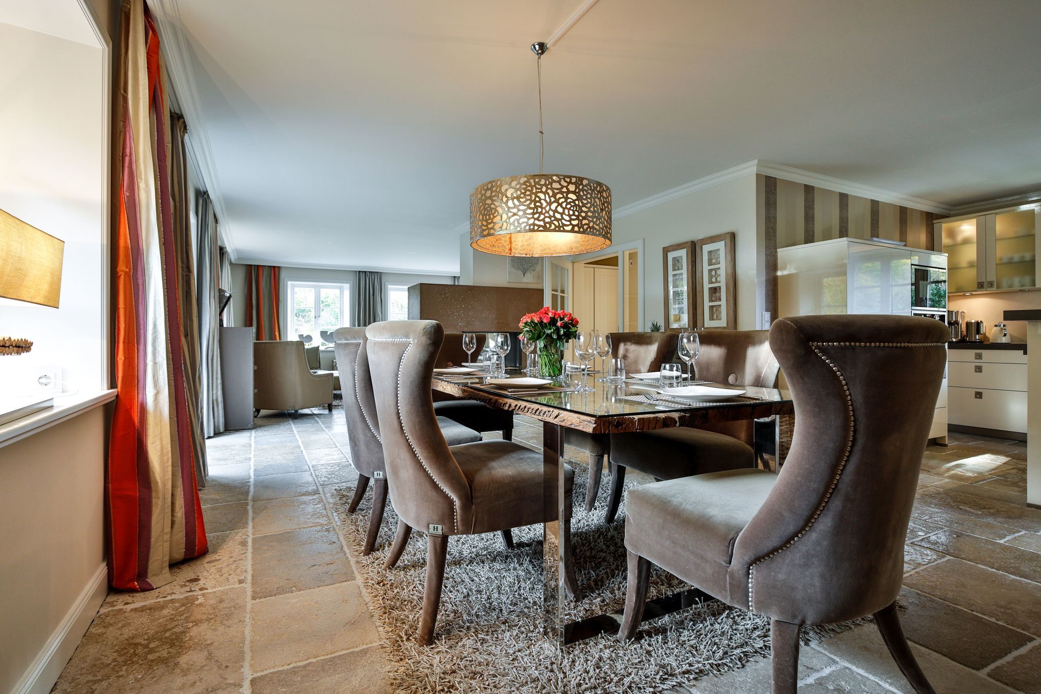 Küche/Essbereich: offene Küche mit Kochinsel ( Induktionsherd Geschirrspüler, Mikrowelle, Backofen, Kühlschrank, Soda-Stream) und Essbereich mit großem Tisch mit 8 Stühlen