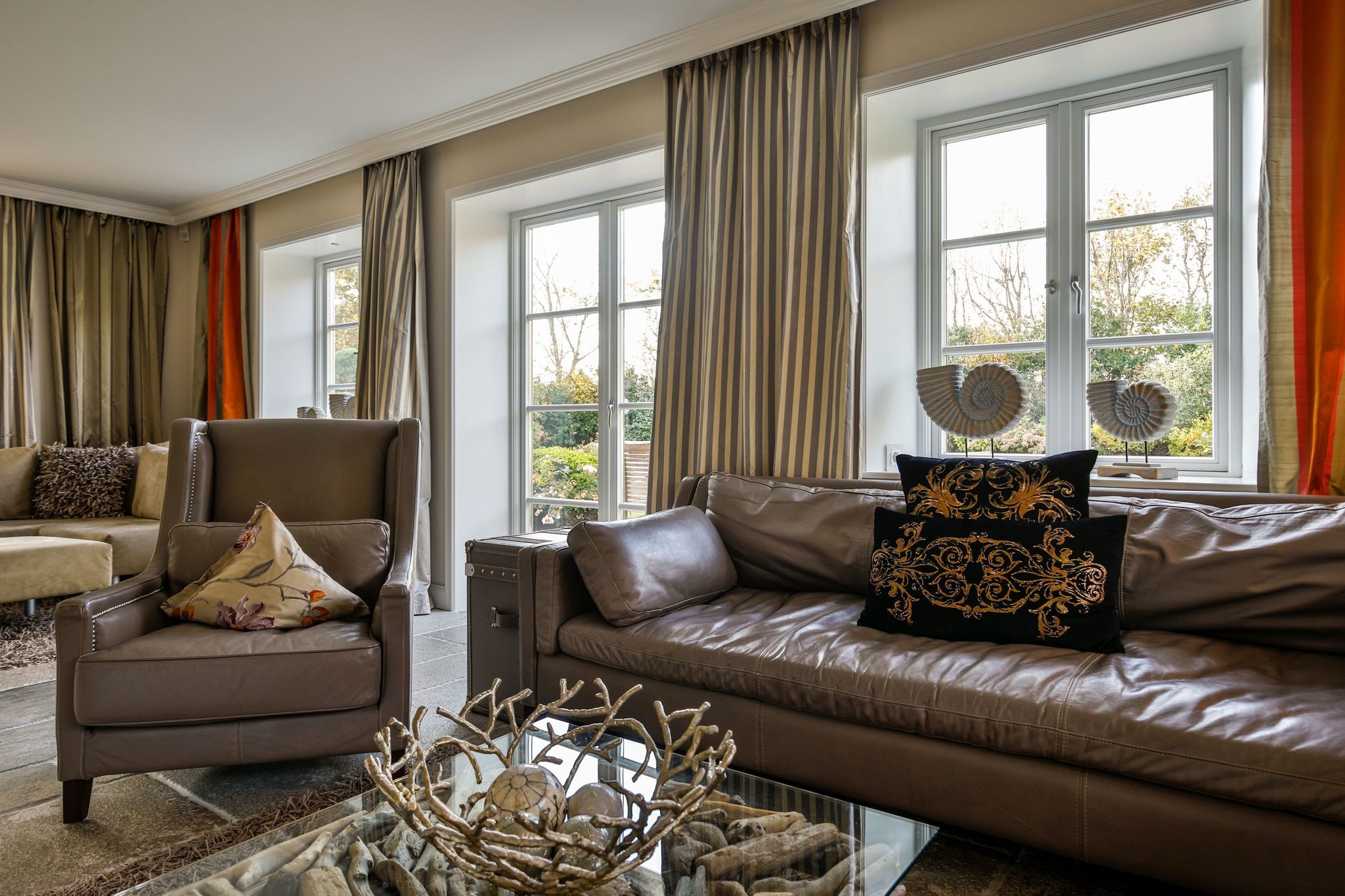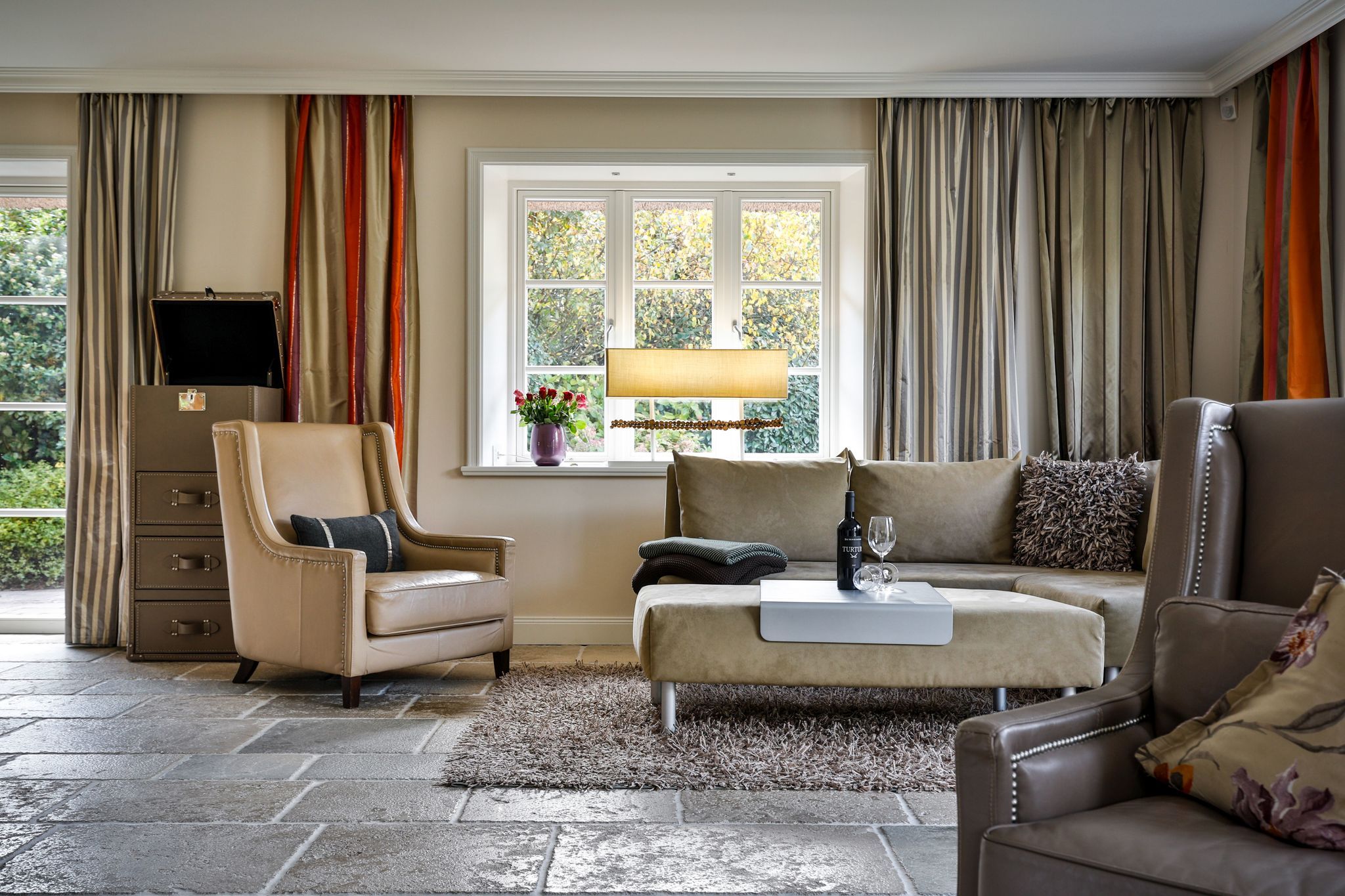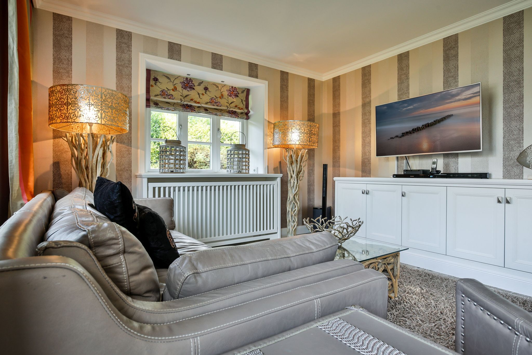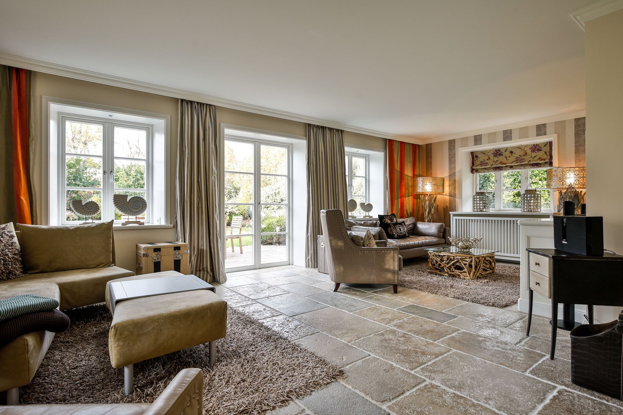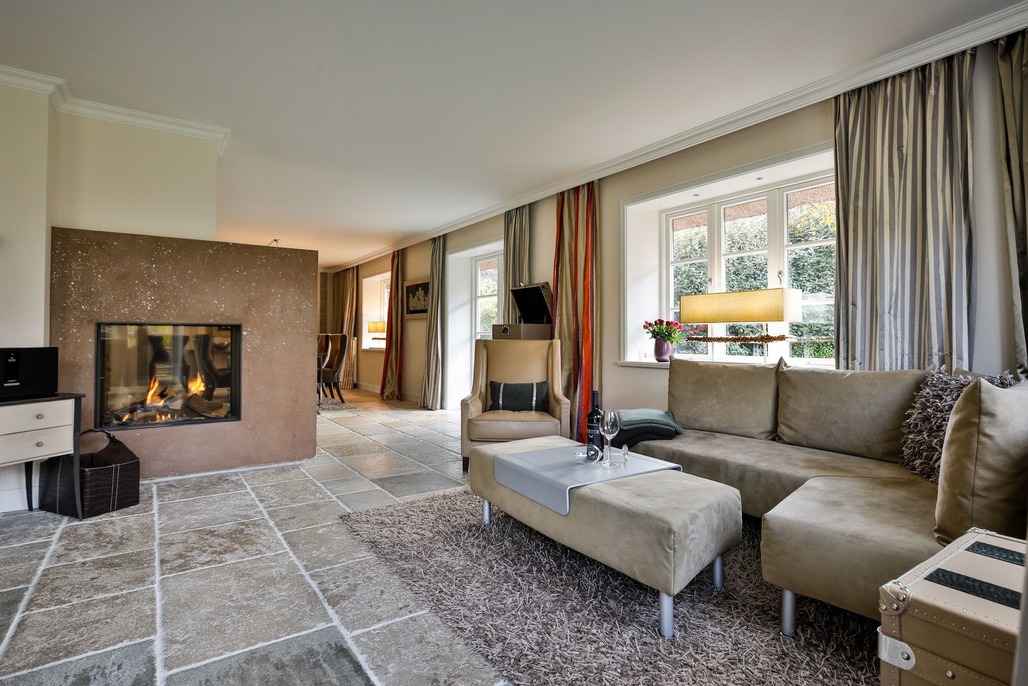 Wohnen: geräumiger Wohnbereich mit großer Couchecke (3er Couch, zwei Sessel und Eckcouch) doppelseitiger, dekorativer Gaskamin (Fernbedienung)