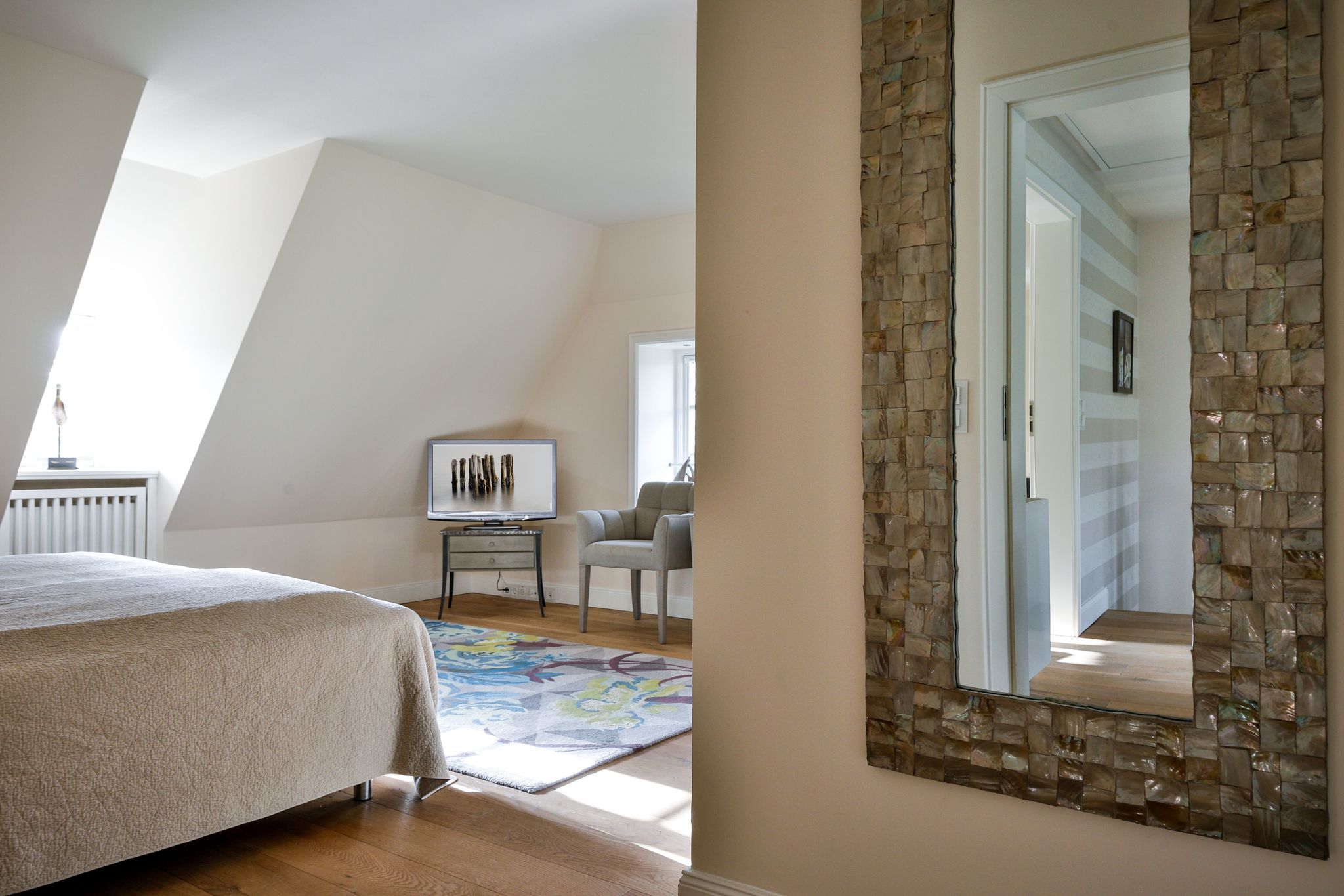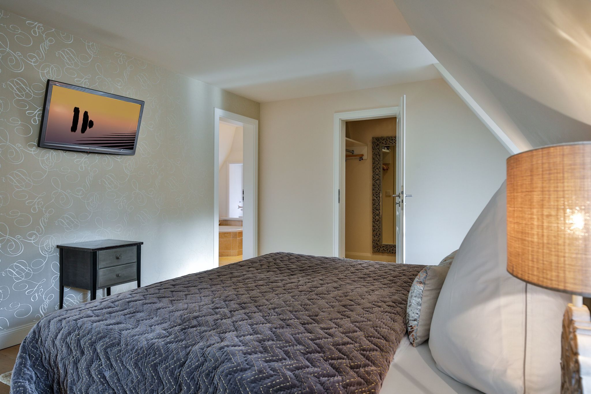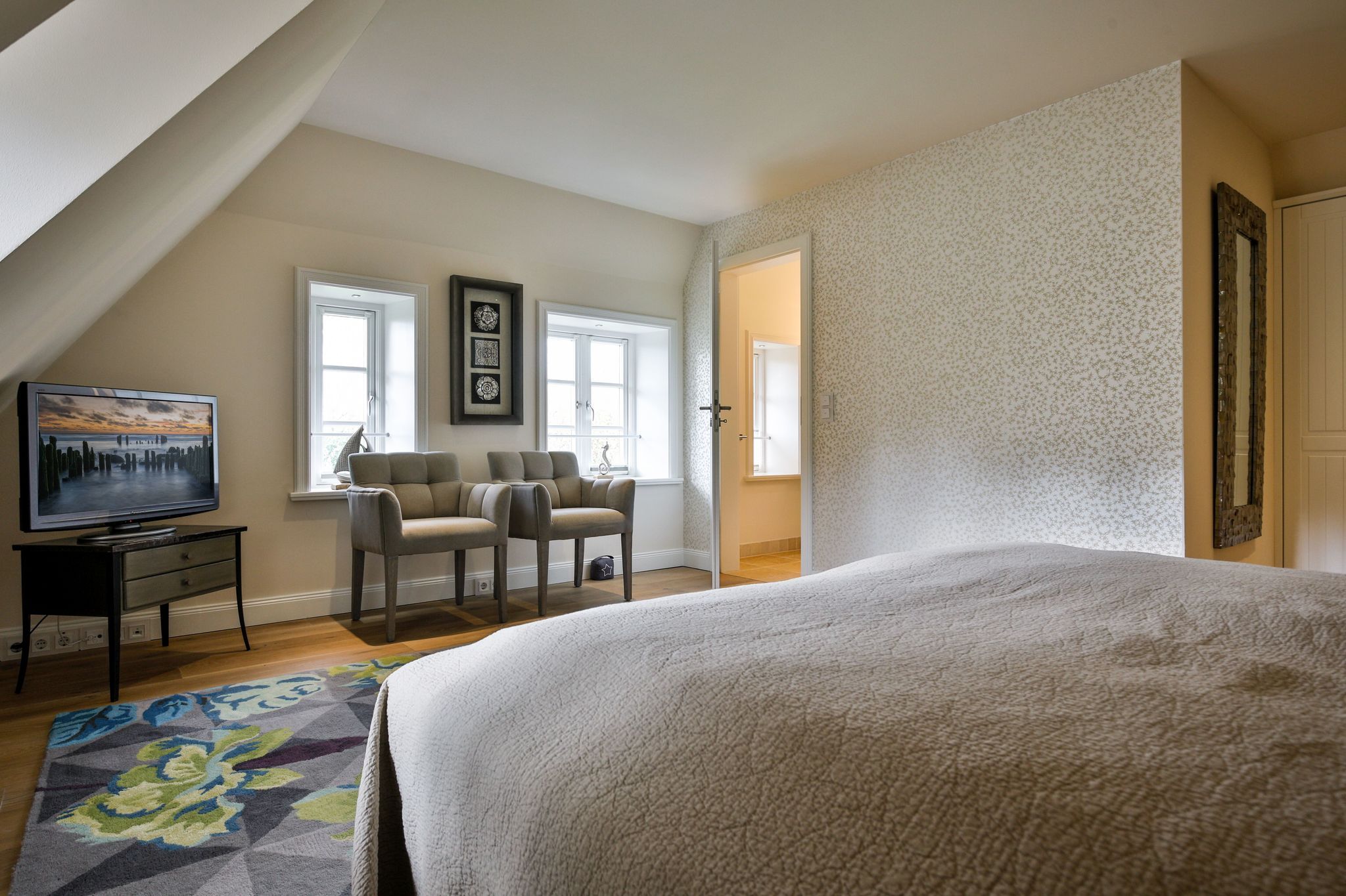 Schlafen 1: geräumiger Schlafraum mit Doppelbett (180cmx200cm), begehbarem Kleiderschrank und TV