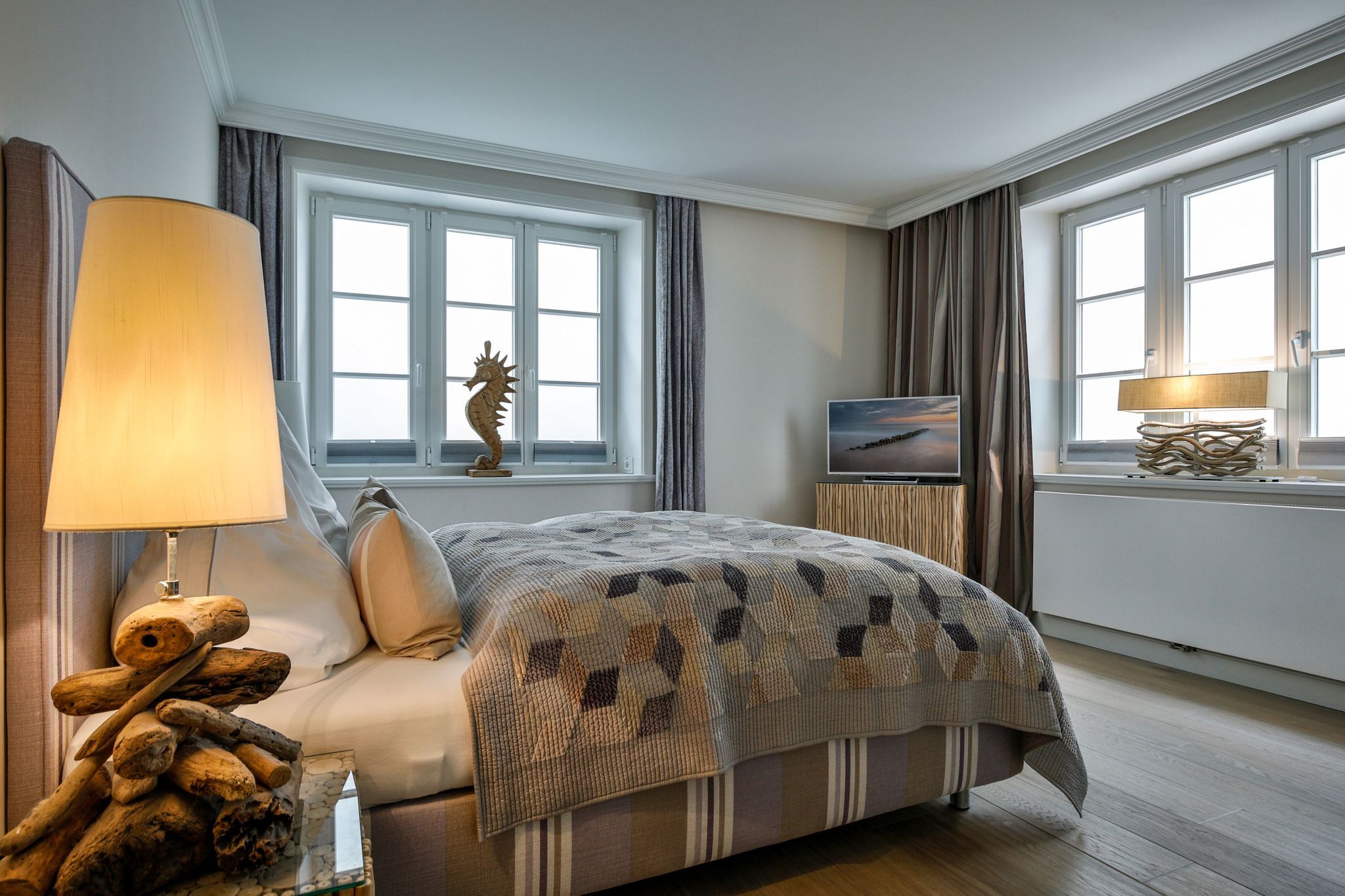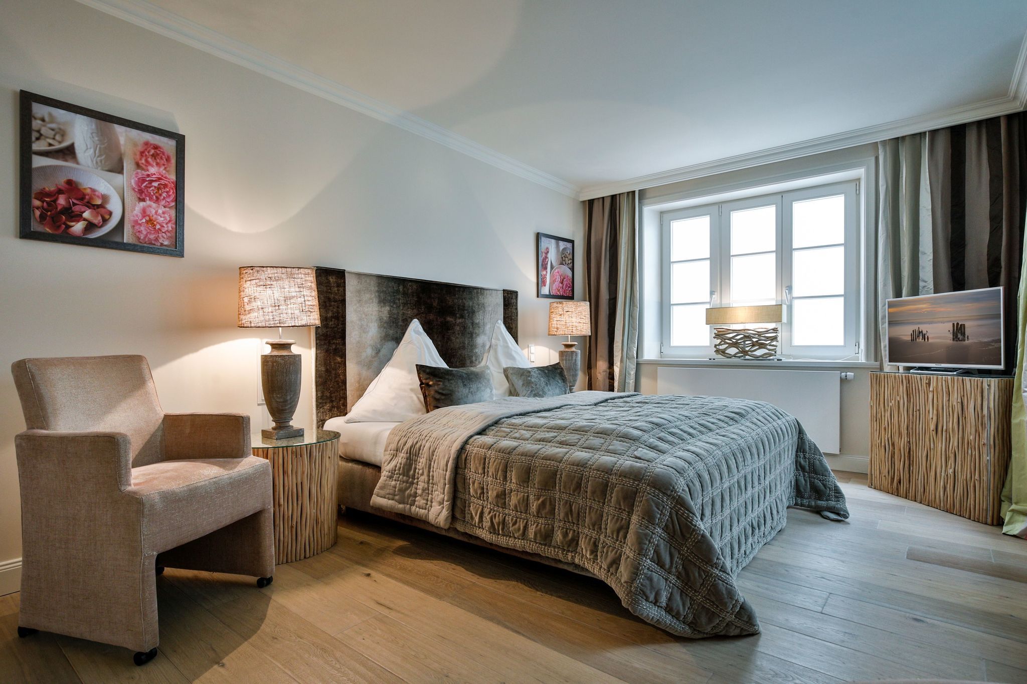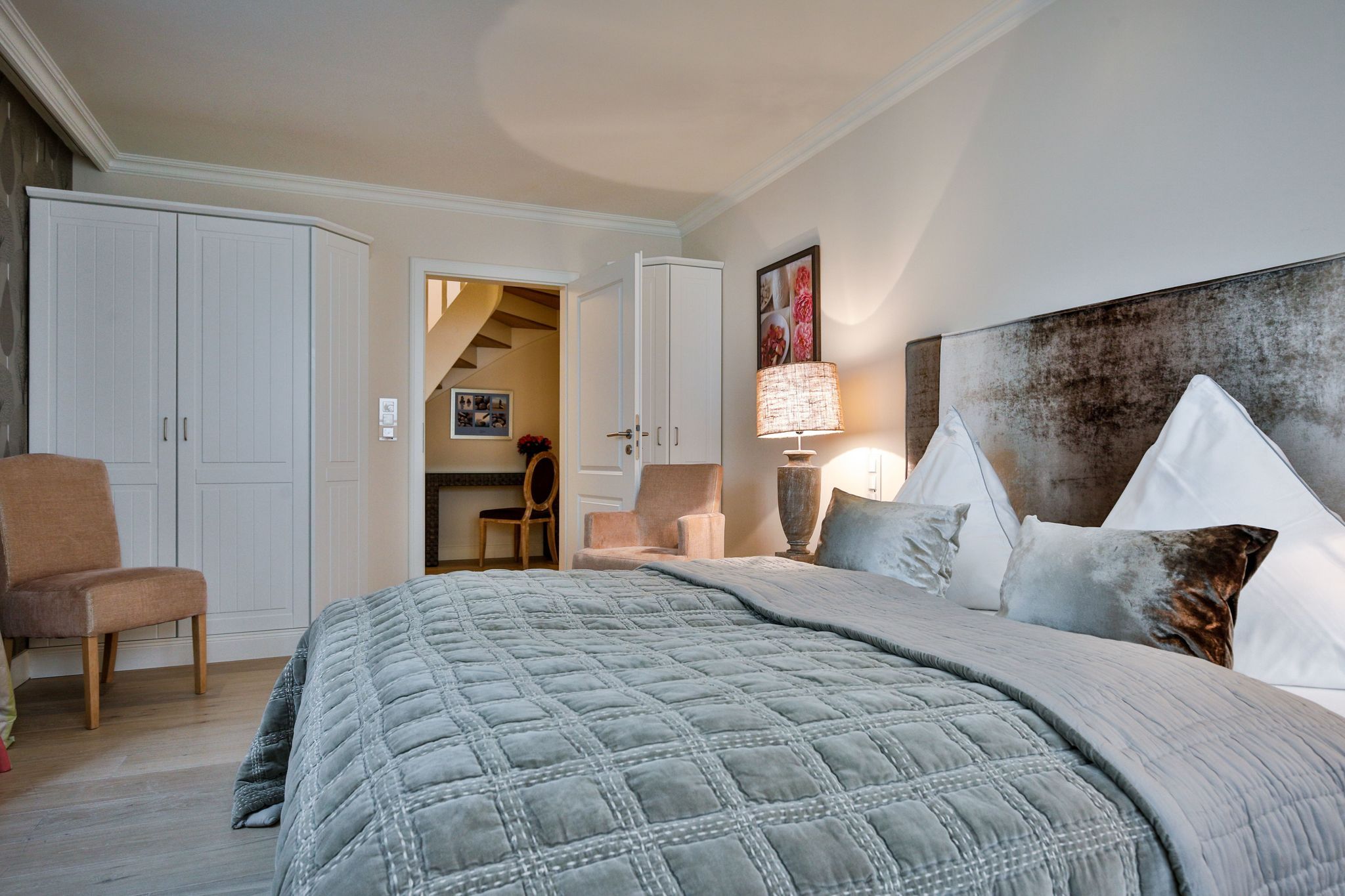 Schlafen 1: geräumiger Schlafraum mit Doppelbett (180cmx200cm), begehbarem Kleiderschrank und TV