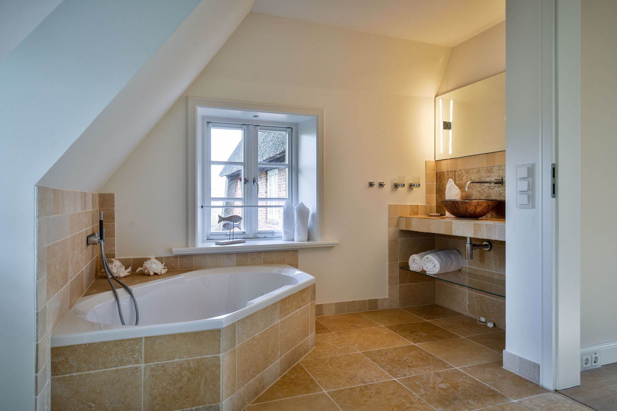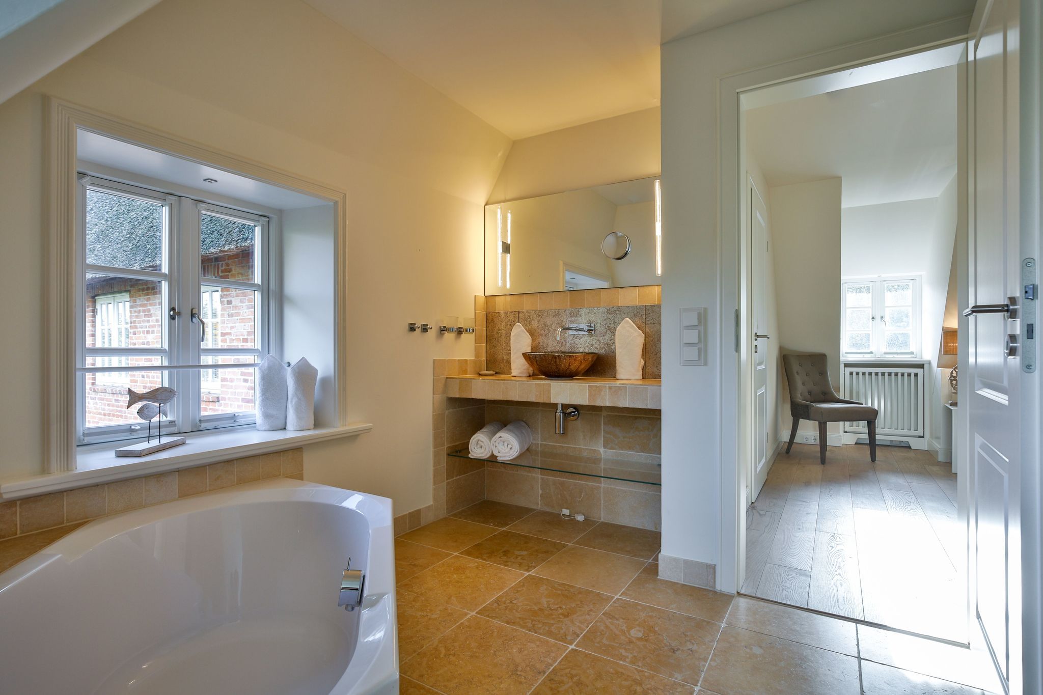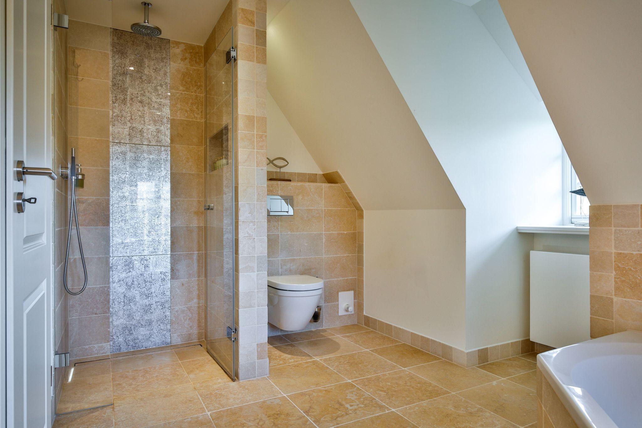 Bad 1: helles en Suite Bad mit Dusche, Badewanne und Handtuchwärmer