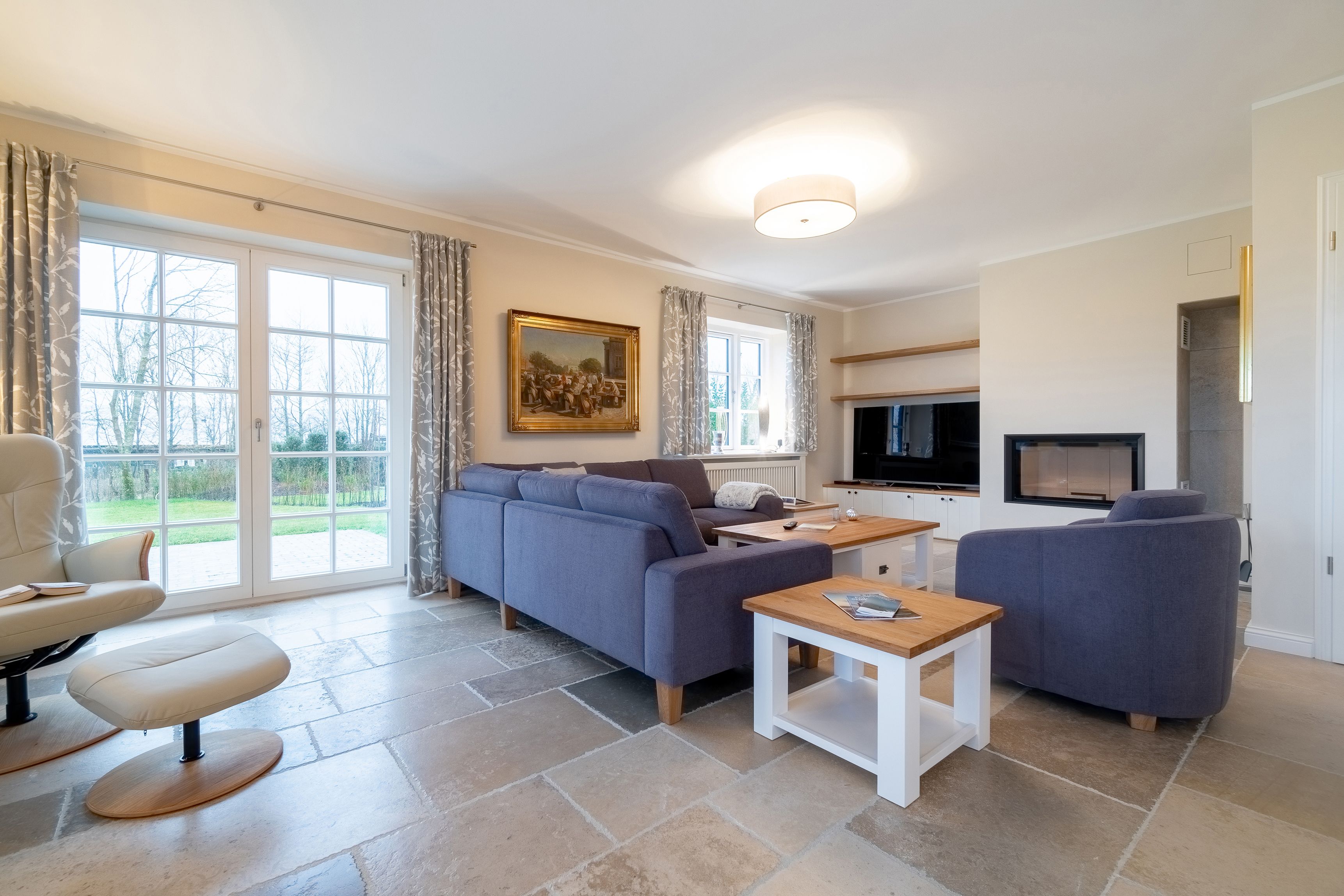 Zu den Highlights der Ferienunterkunft zählen wir u. a. den Kaminofen, die hauseigene Sauna, den Garten mit Terrasse sowie die ruhige Randlage im Dorf Oldsum, von der aus Sie einen unverbaubaren Blick auf die Marsch und den Deich haben.