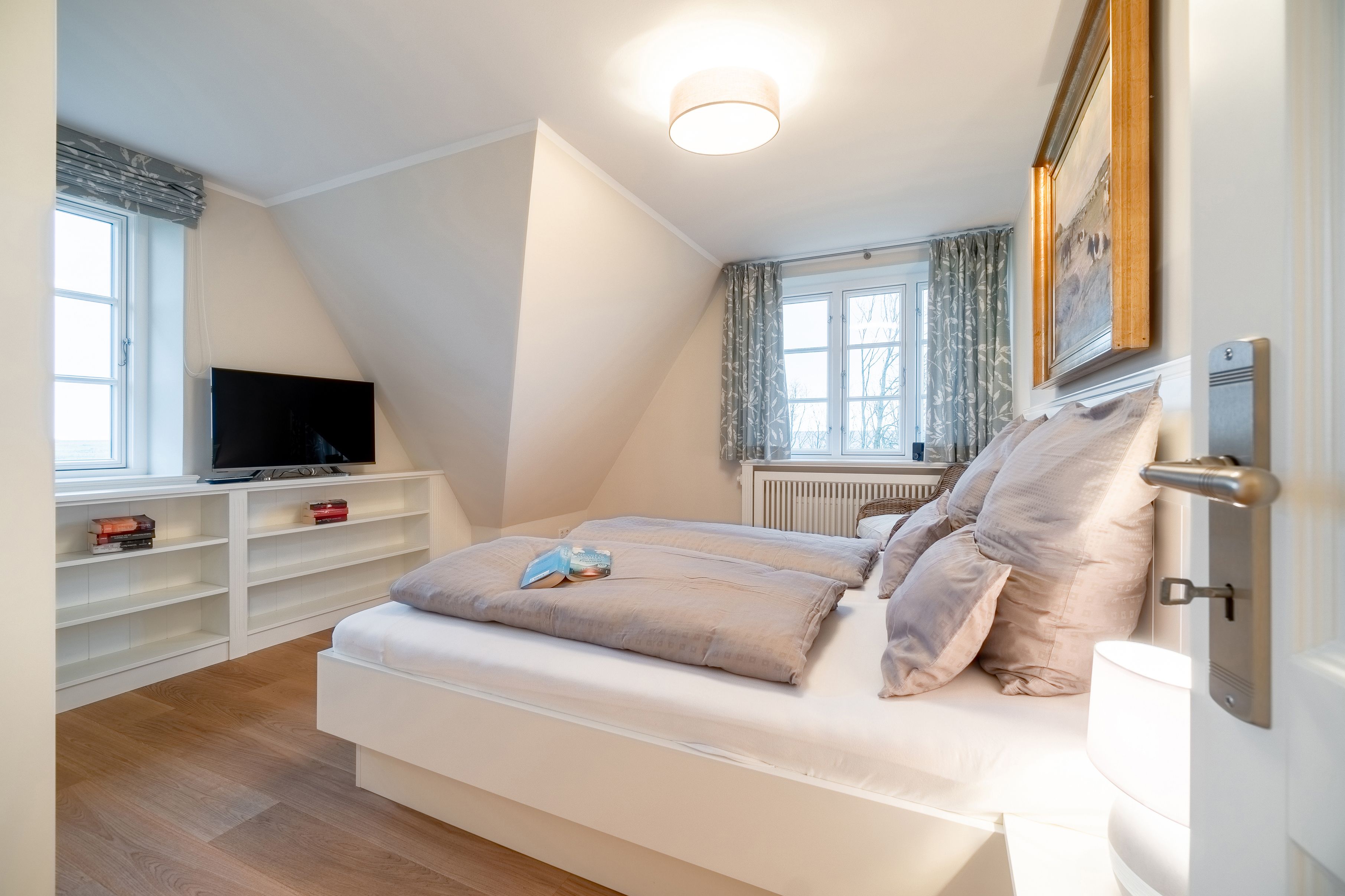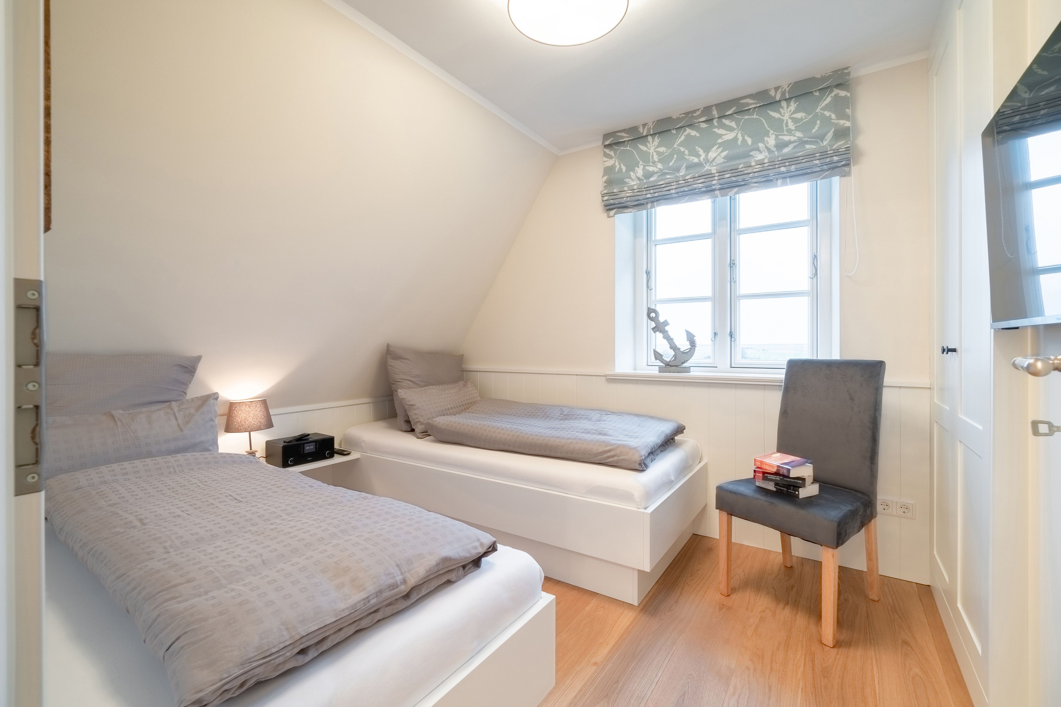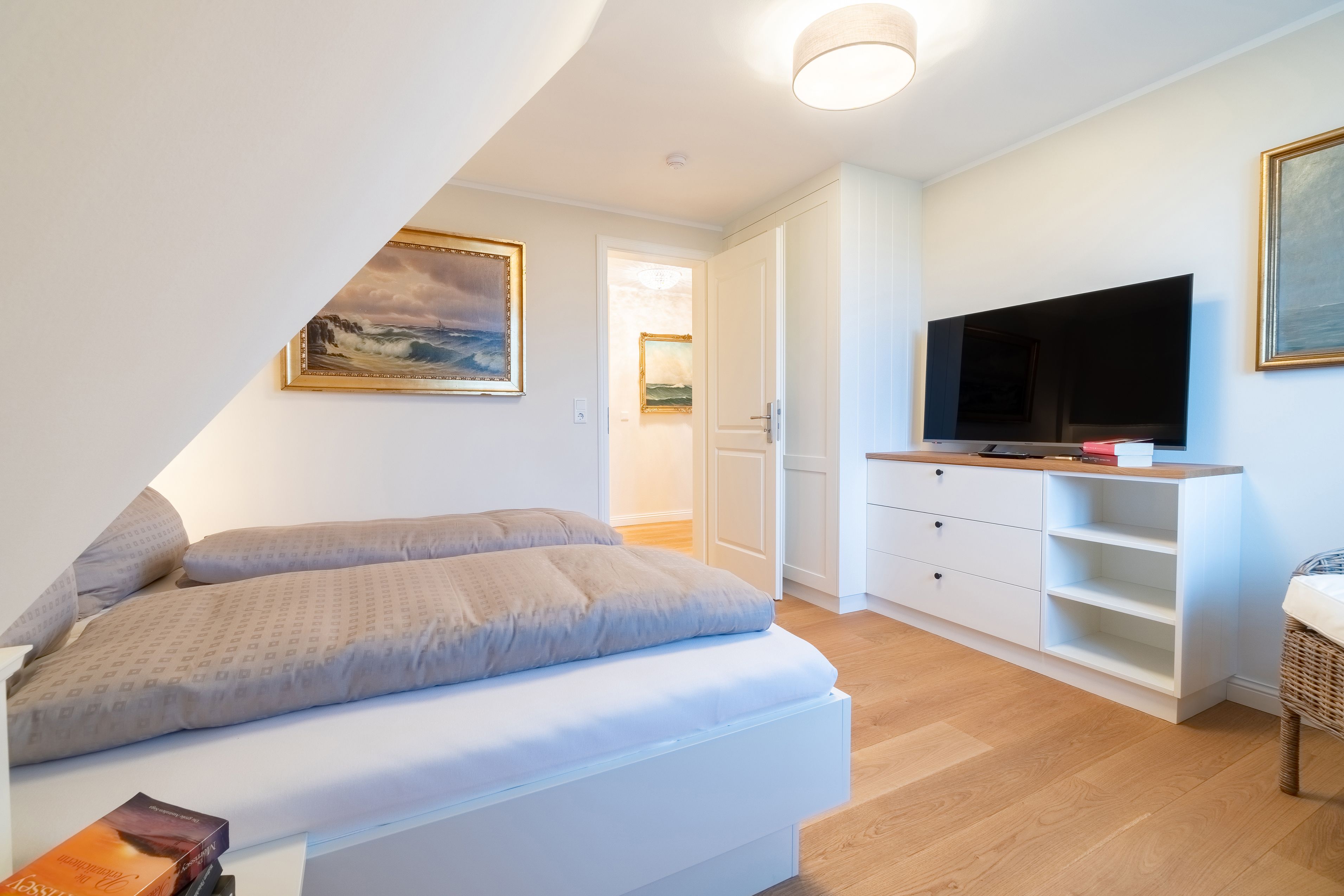 Im Obergeschoss befinden sich die drei Schlafzimmer - zwei mit jeweils einem Doppelbett und eines mit zwei Einzelbetten - sowie das zweite Duschbad. Alle Schlafzimmer sind mit einem Smart-TV ausgestattet.